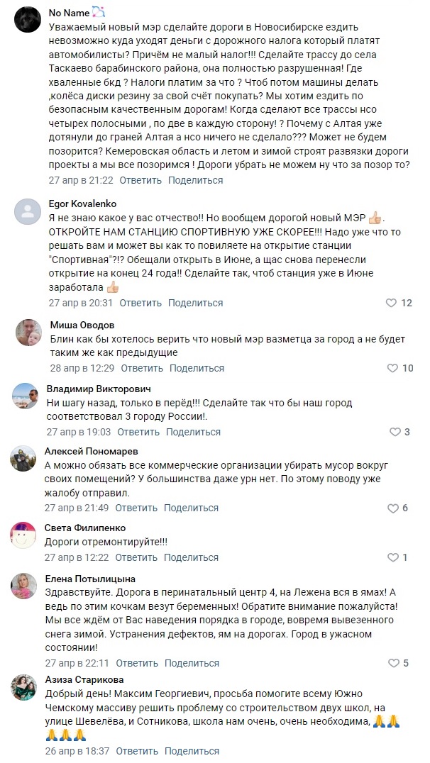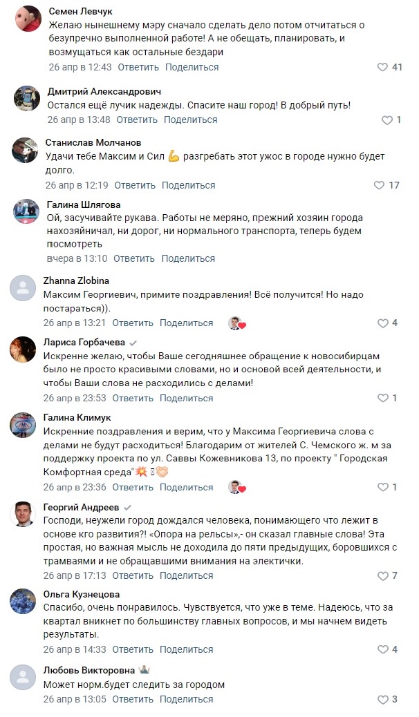 Целый ряд комментаторов сообщил, что они не готовы авансом оказывать доверие мэру, а поддержат его только тогда, когда он реальными поступками докажет, что этого заслуживает. Есть и те, кто уже оценил позитивные подвижки в жизни города после вступления Максима Кудрявцева в новую должность. Напомним, свою работу он начал с вопросов чистоты на улицах мегаполиса — во-первых, с личного участия в субботнике, во-вторых, с проверки 96 стройплощадок: настоял на том, чтобы каждую оборудовали мойками для колёс, если таковых не было, чтобы спецтехника не развозила грязь по Новосибирску. Горожане эти шаги одобрили. «Правильное начало работы»;