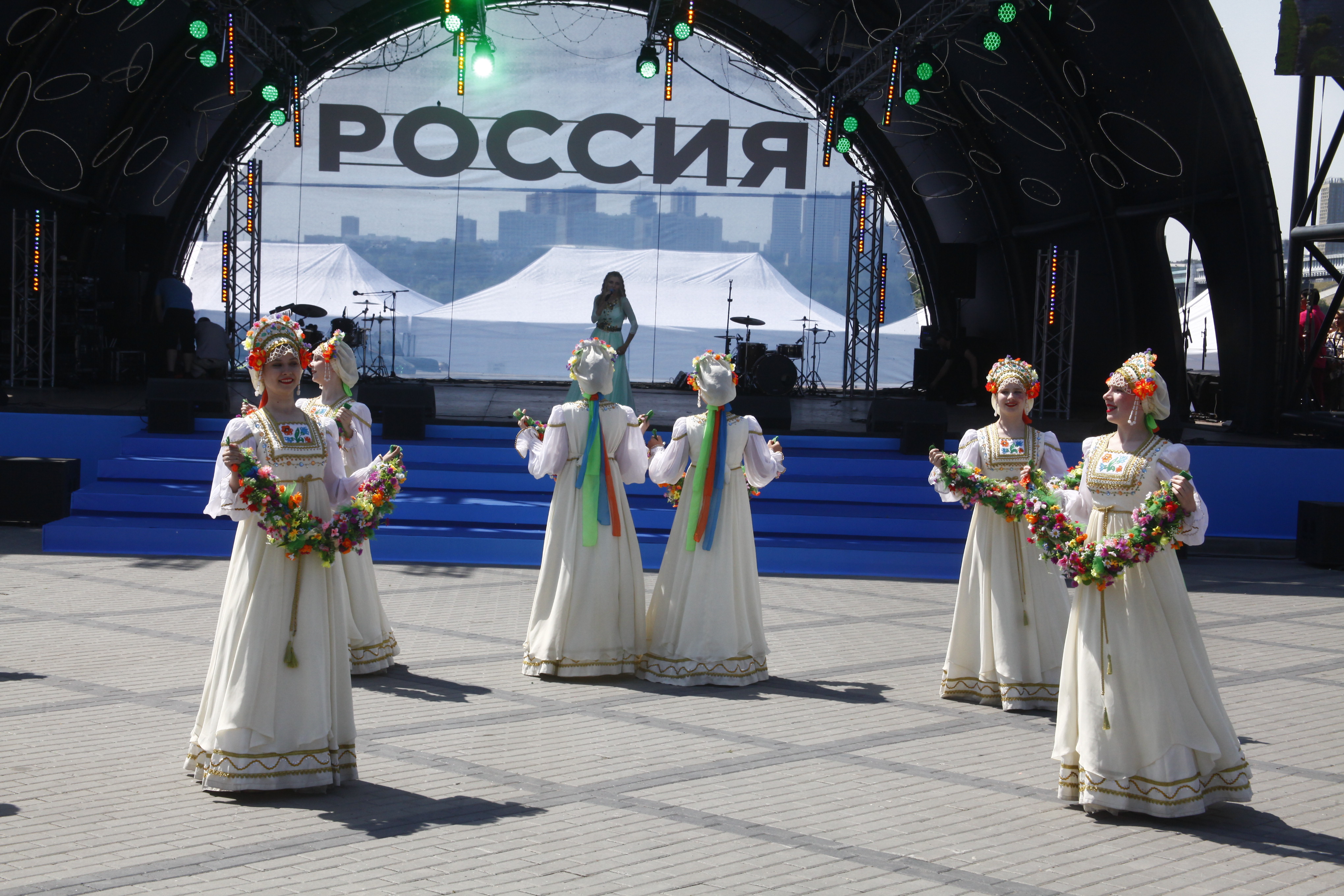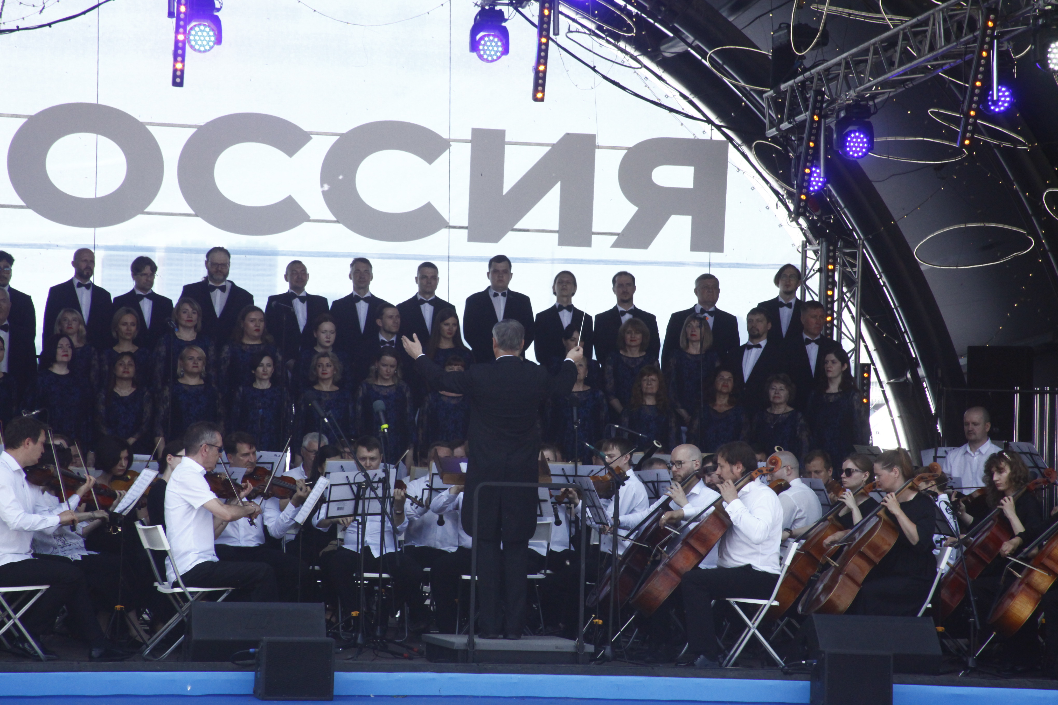 Основной точкой притяжения стала главная сцена. Тематическую программу «Вдохновлённые Россией» открыли академический симфонический оркестр и хоровая капелла филармонии — участники национального марафона классики.