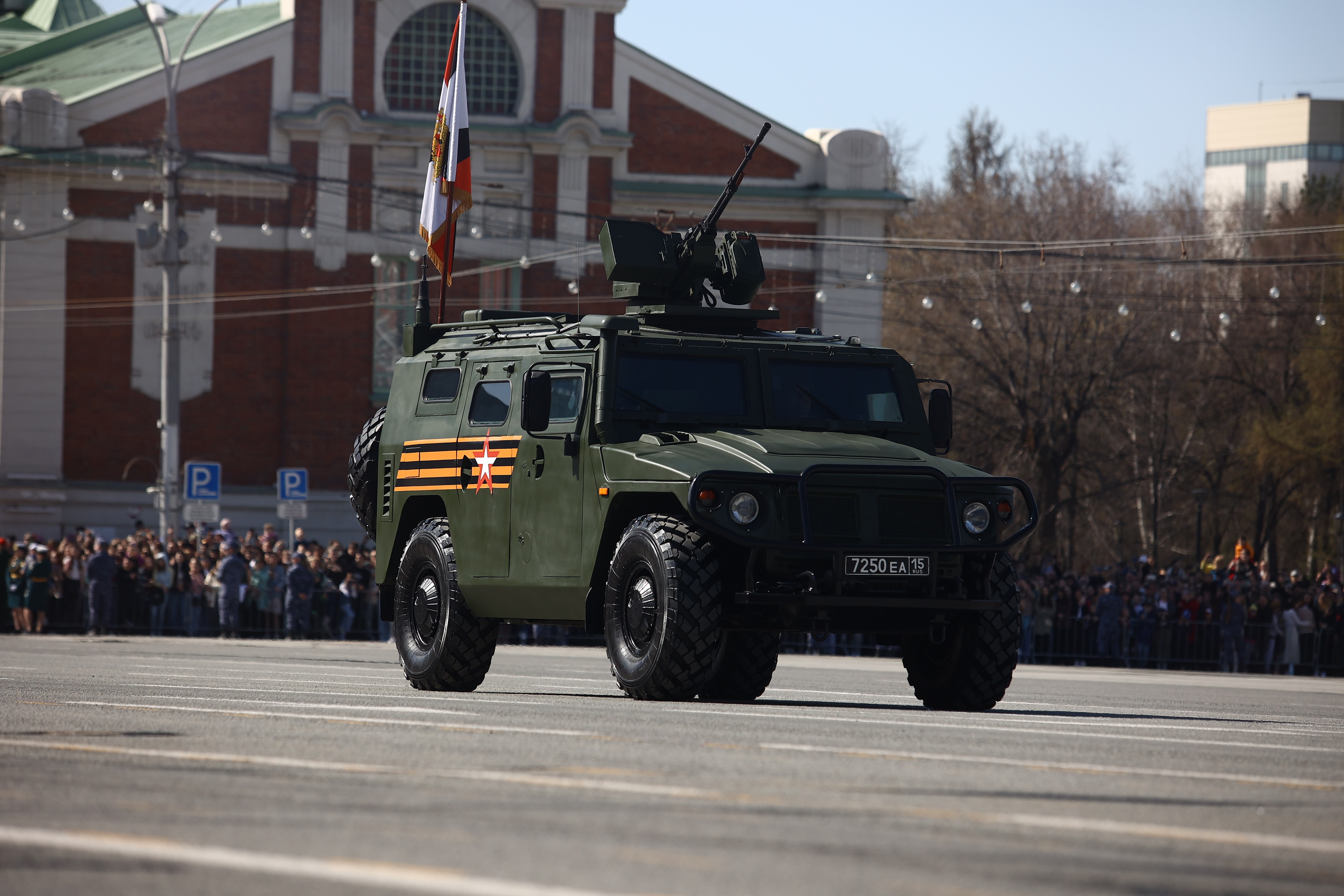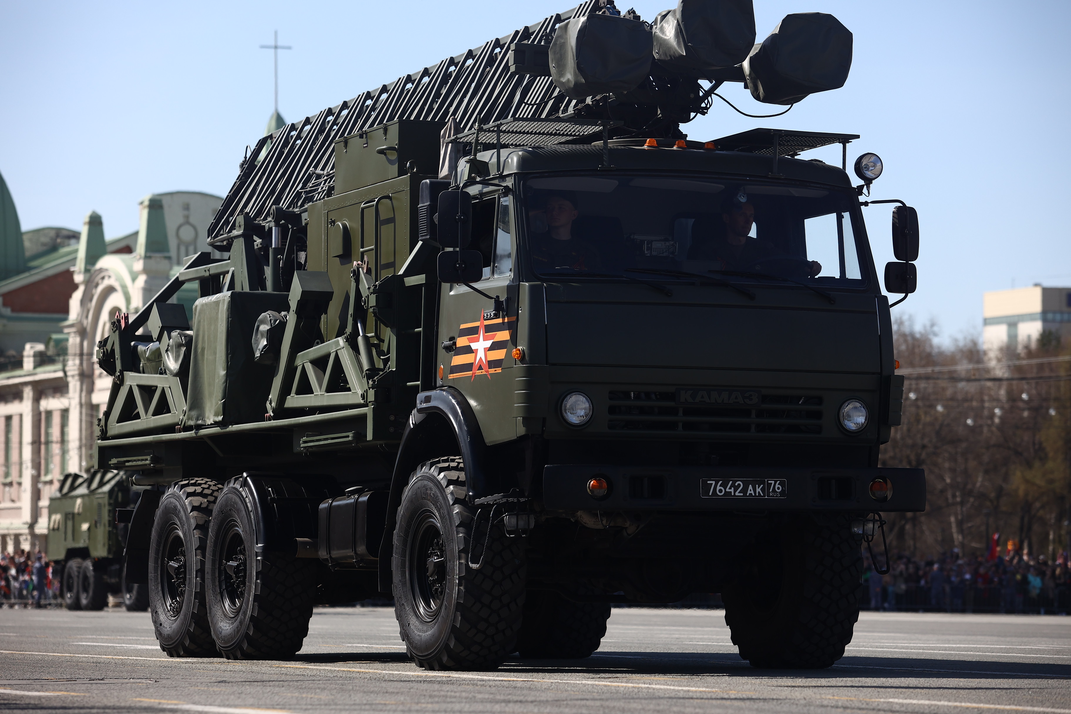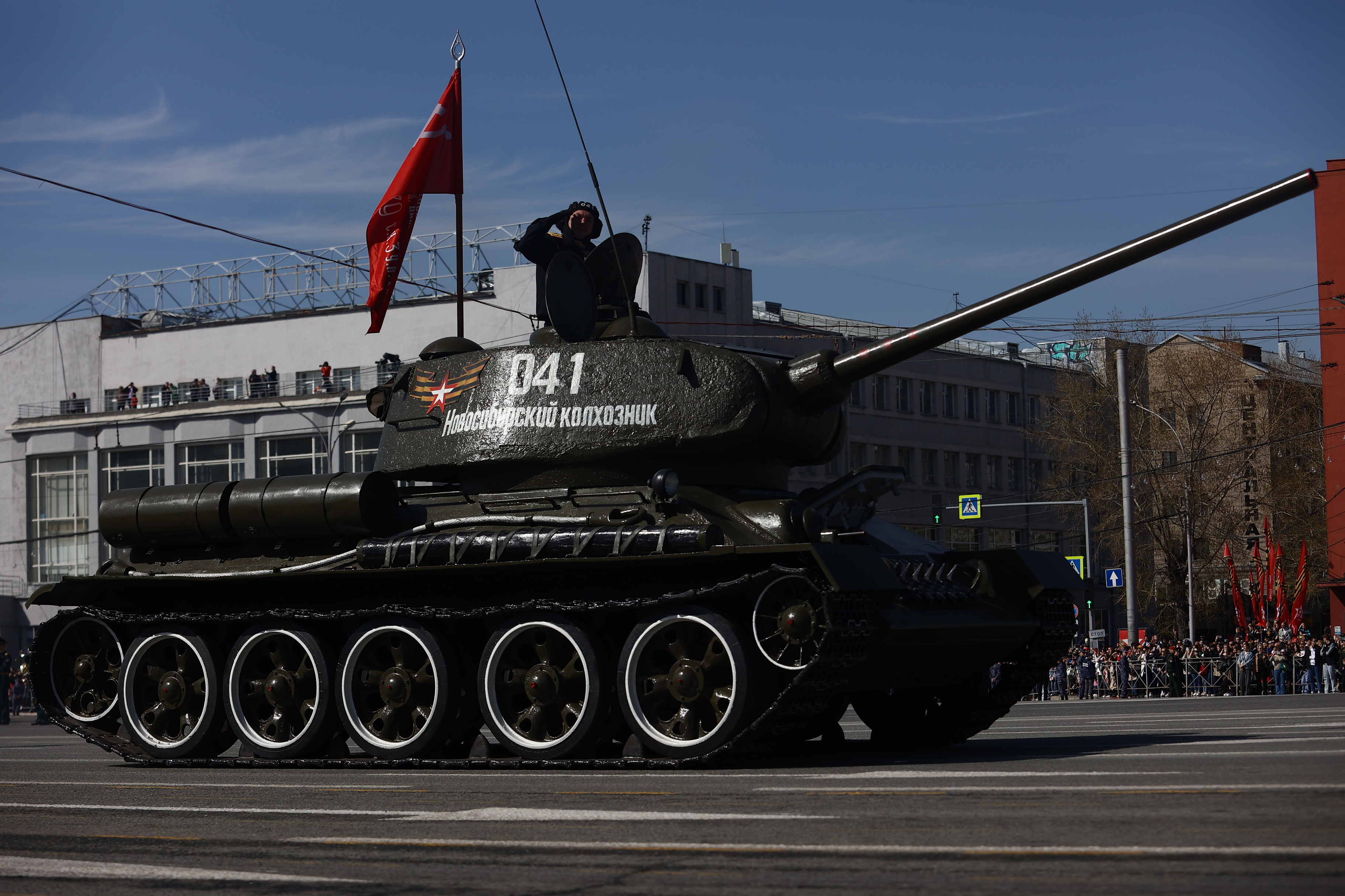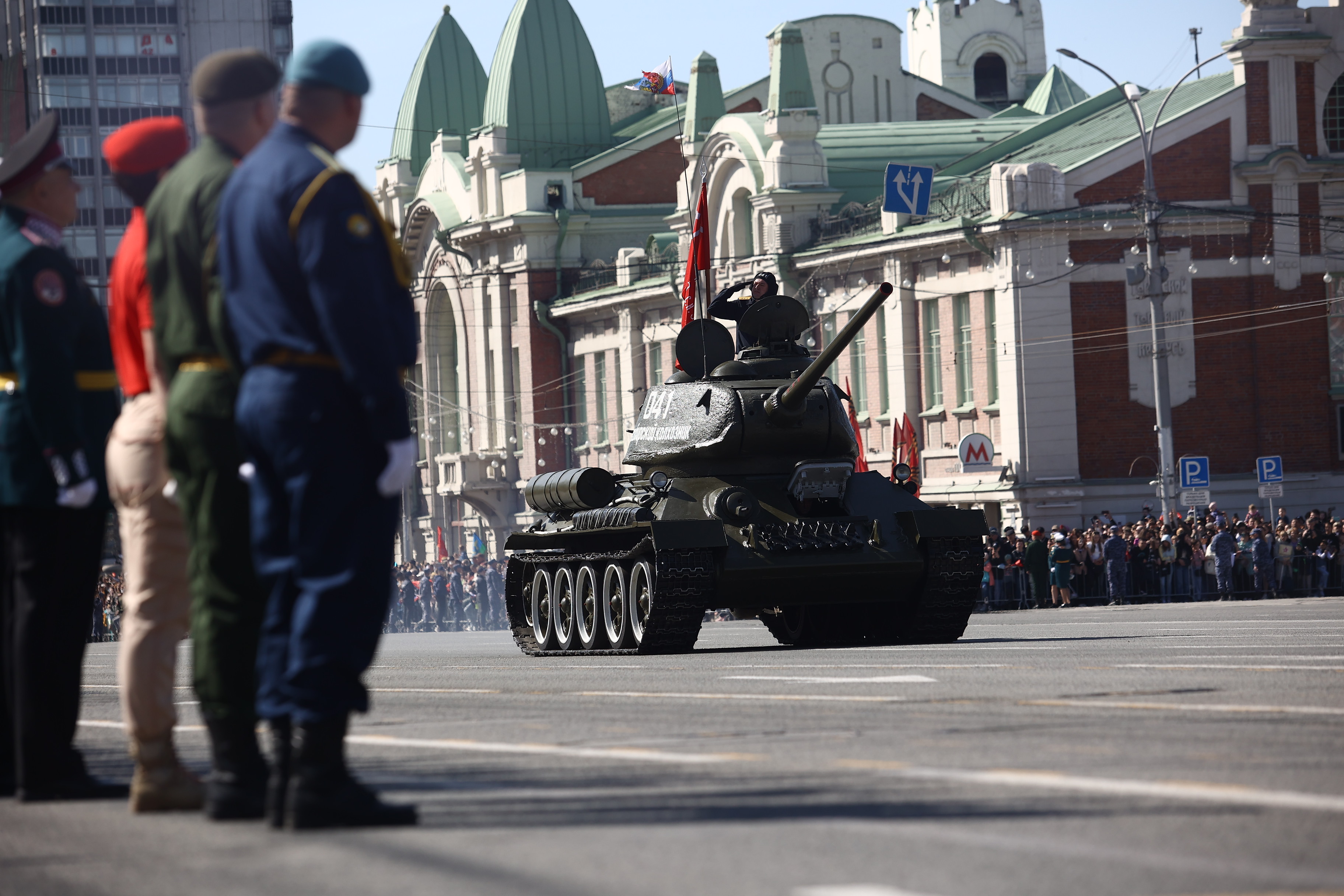 Это в том числе мобильная пусковая установка ракетного комплекса «Ярс», боевая продиверсионная машина «Тайфун», комплексы С-400 «Триумф» и «Искандер», бронеавтомобиль «Тигр», бронетранспортёры БТР-82АМ, радиорелейная станция Р-416ГМ. Возглавил колонну легендарный танк Т-34. А в небе над площадью Ленина прошёл мини-авиапарад от СибНИА имени С. А. Чаплыгина: новосибирцы увидели самолёт «Легенда-570» и восстановленный к празднику истребитель И-16, участвоваший в Великой Отечественной.