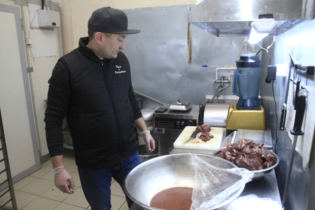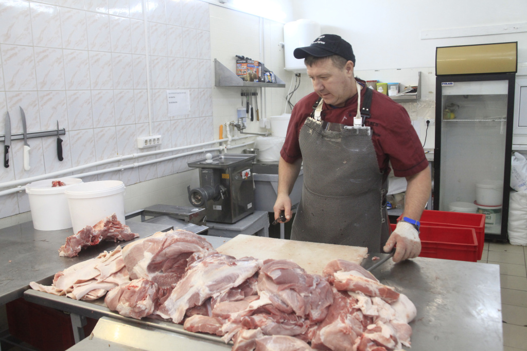 Кстати, история начинки для пельменей начинается в цехе разделки, где сначала проверяют качество сырья. Мясник Евгений виртуозно обращается с острейшим ножом: разделывает свинину, говядину, баранину и курицу, отделяя мякоть, из которой потом технолог накрутит разные фарши.