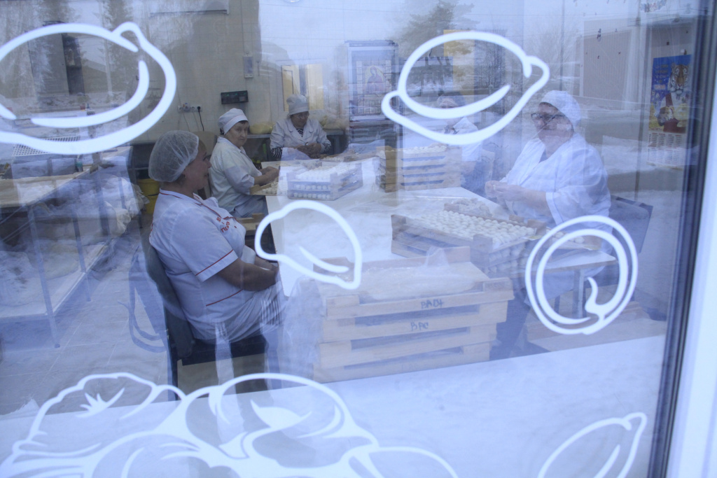 Через большое окно заглядывают прохожие, смотрят, как работает цех. Смена у лепщиц длится с 7:30 до 13:00. Женщины говорят, что их профессия требует усидчивости, любви и что не каждый сможет выдержать такой режим. За день каждая из них должна выполнить норму — 40 кг пельменей. Если руки не сильно устали, то можно остаться и продолжить. Оплата труда сдельная — сколько налепил, столько и получил.