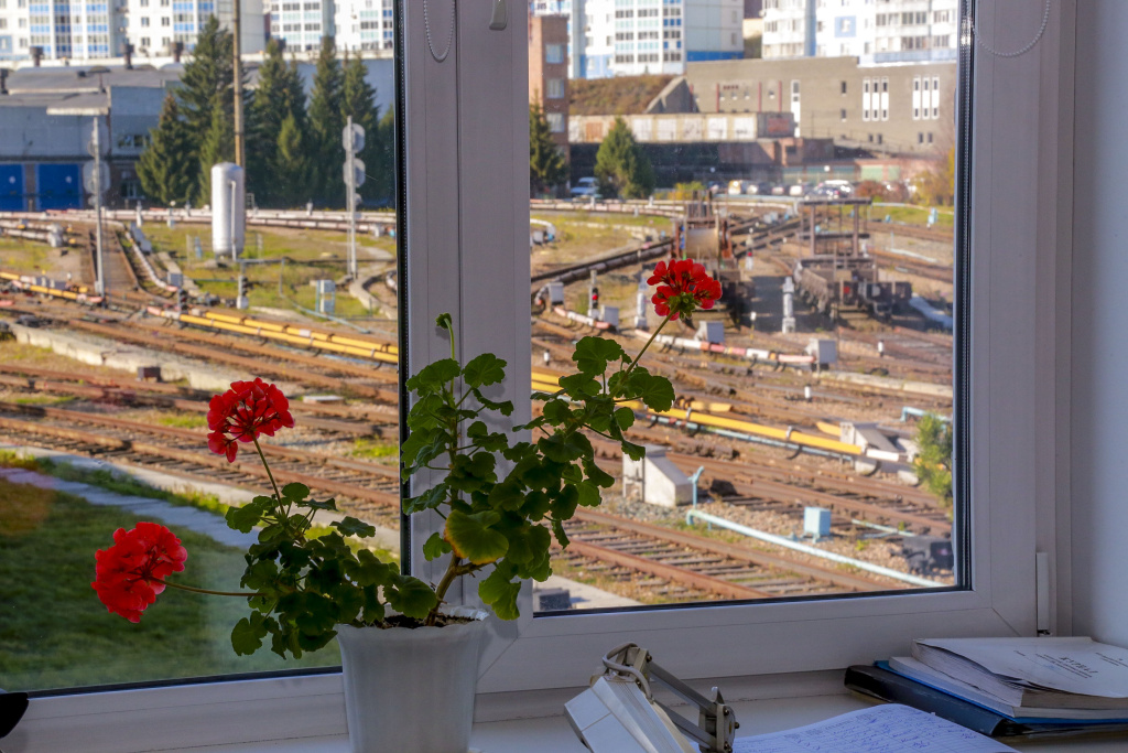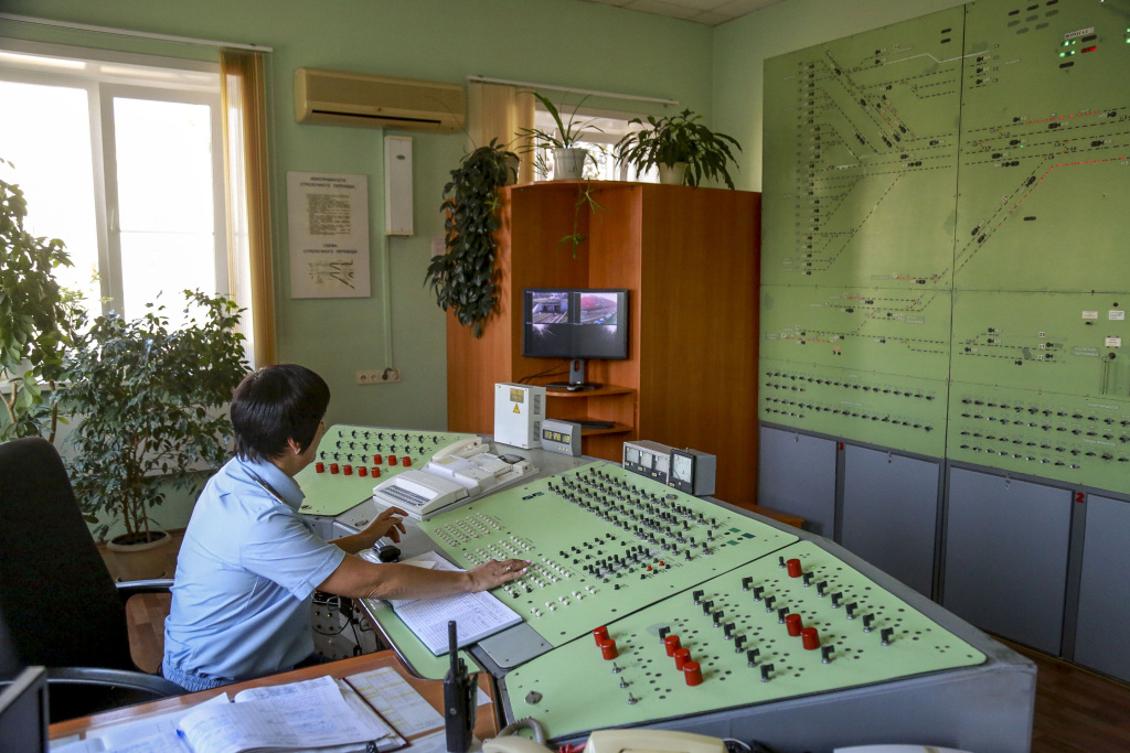 В кабинете Оксаны Бородихиной — пульт управления оборудованием и большое настенное табло, куда выведены все пути. Белая полоса на нём — это проложенный маршрут для отправления поезда. Вся техника работает с момента запуска депо — с 1985 года, но служит исправно, сбоев не даёт.