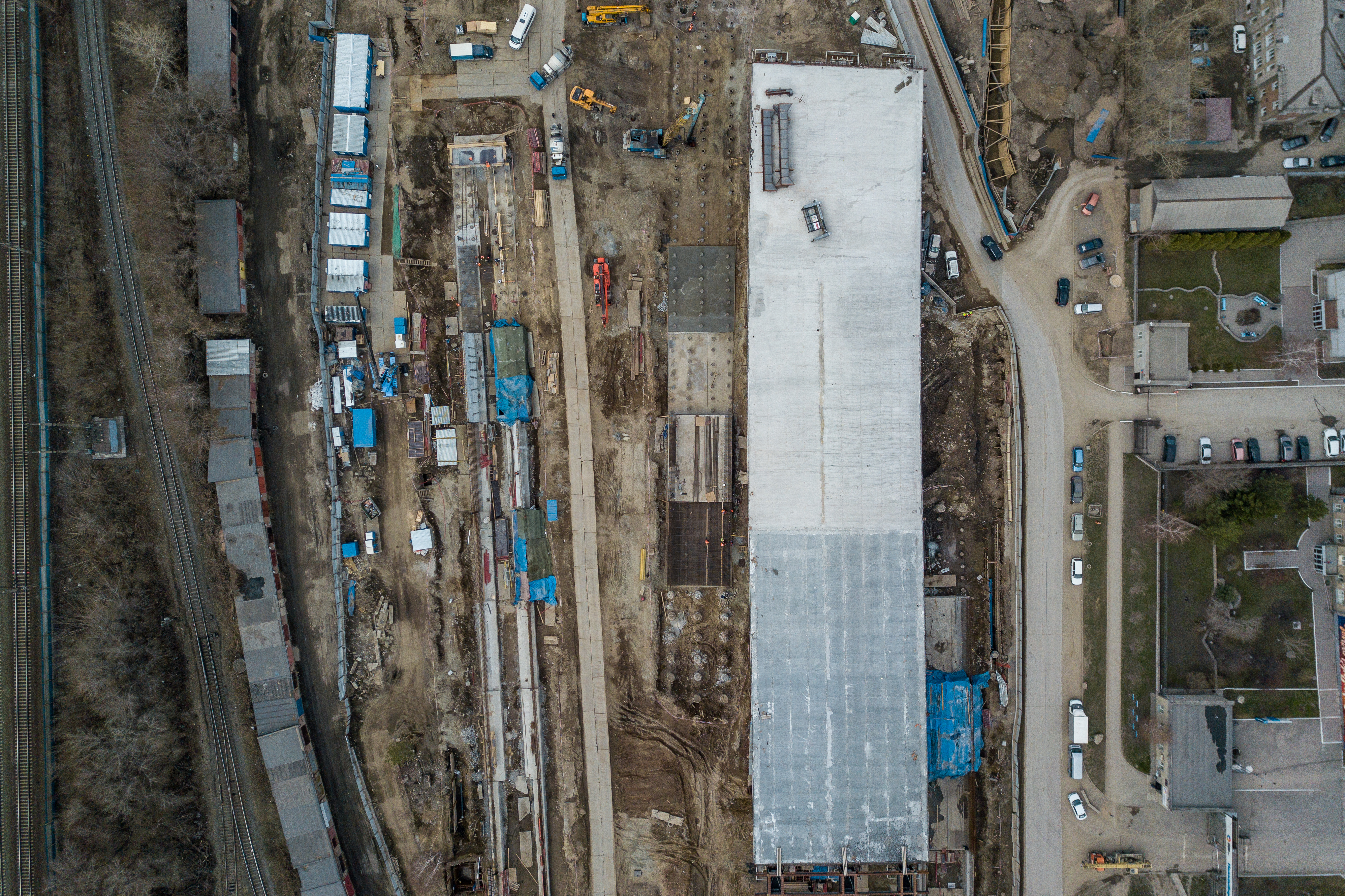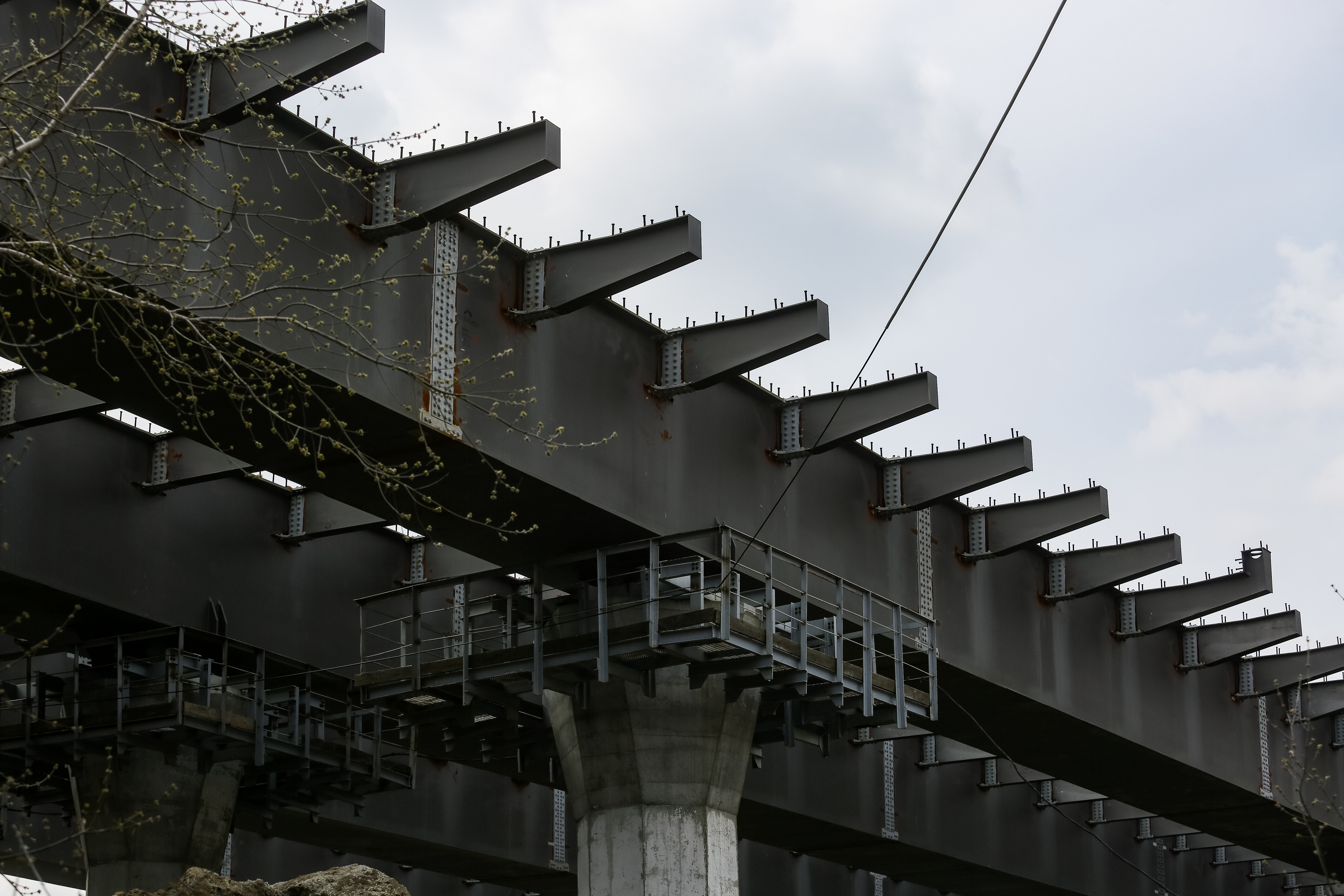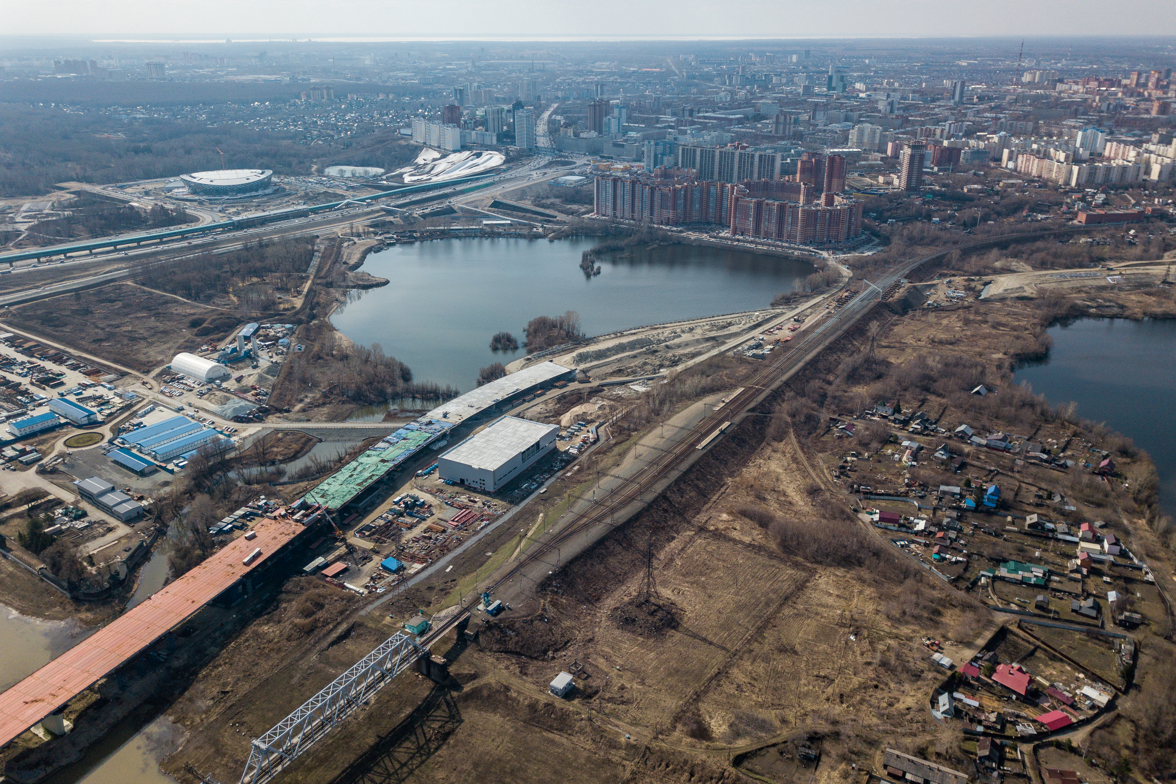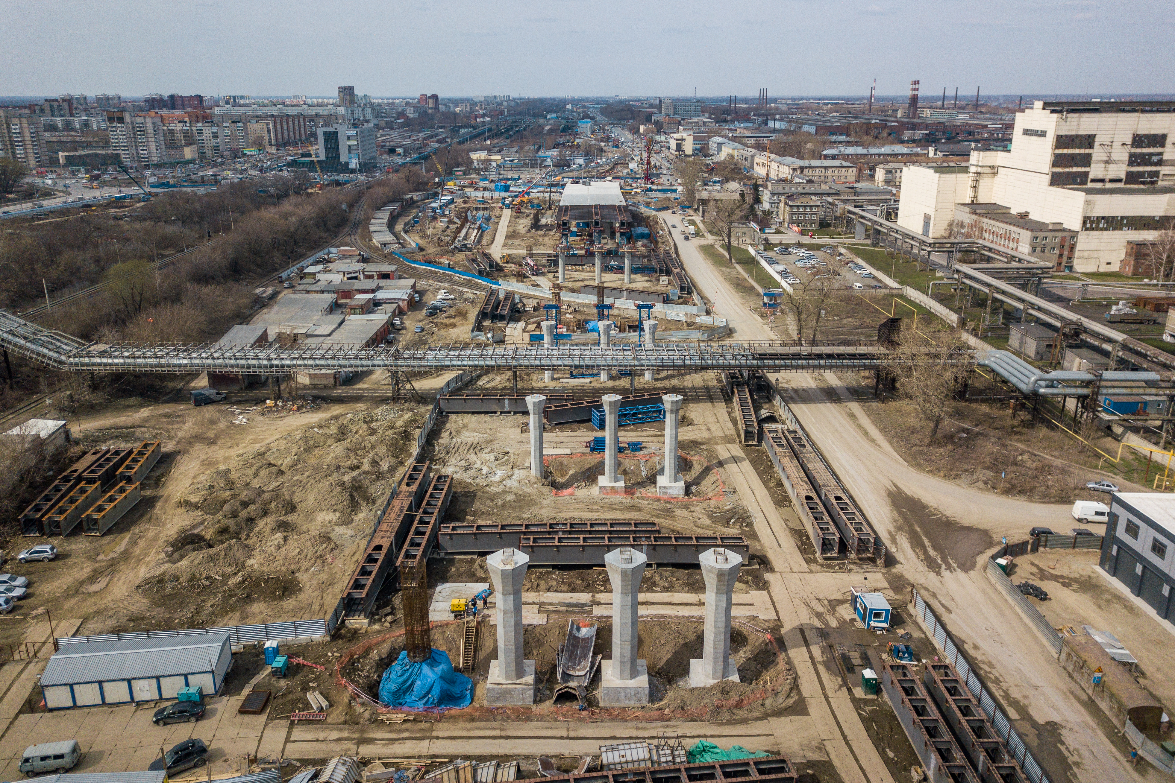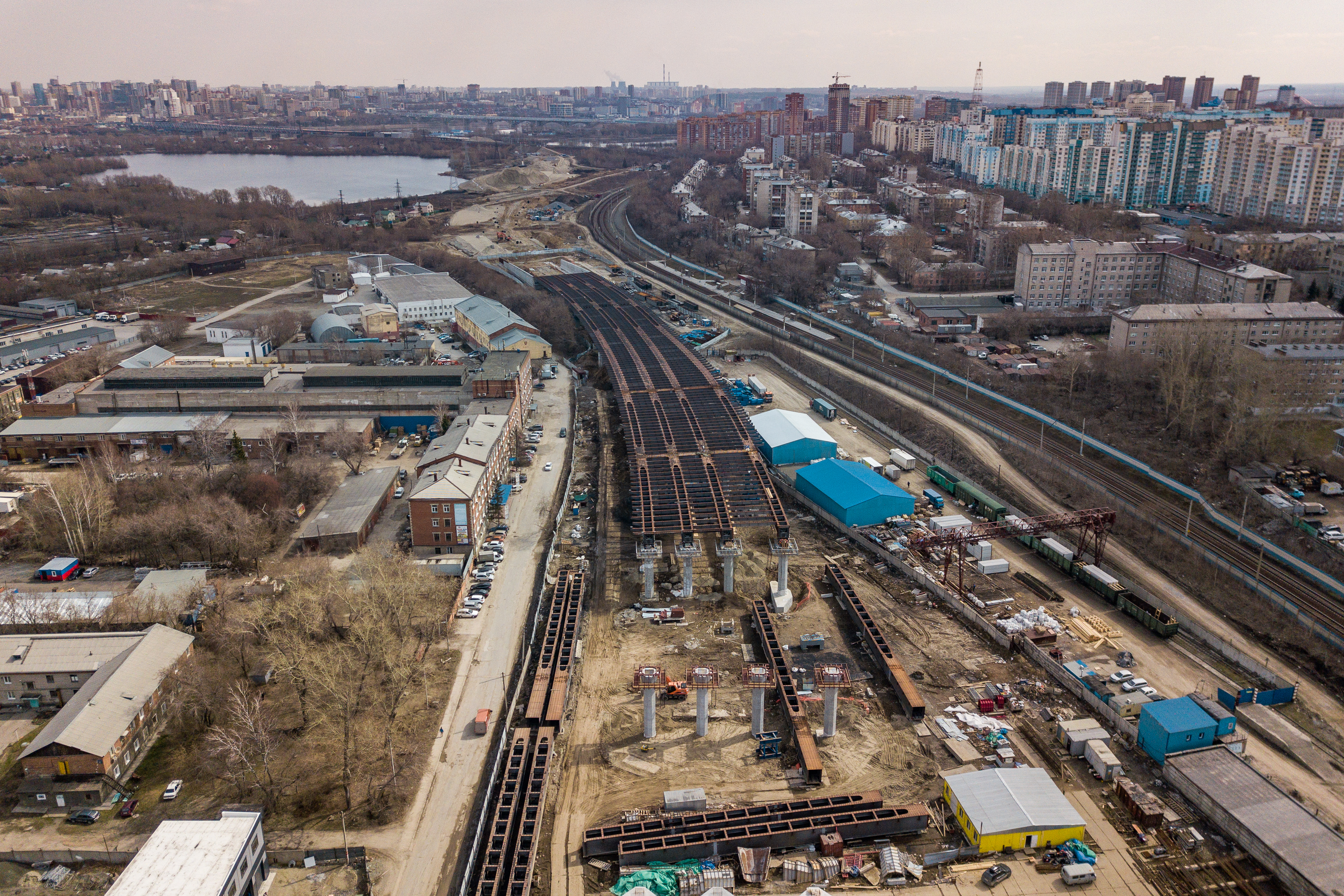 Прорисовывается геометрия 400-метровой автомобильной эстакады, которая идёт вдоль Станционной к реке. Конструкцию монтировали участками, все опоры уже готовы, и сейчас на них поднимают пролёты.