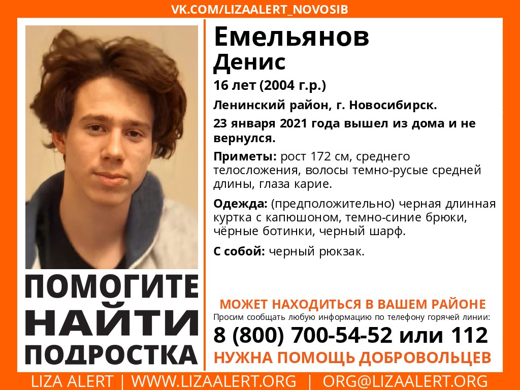 В Новосибирске пропал 16-летний Денис Емельянов. Он вышел из дома в Ленинском районе 23 января и не вернулся. Ориентировку на поиск пропавшего подростка разместили волонтёры «Лиза Алерт».