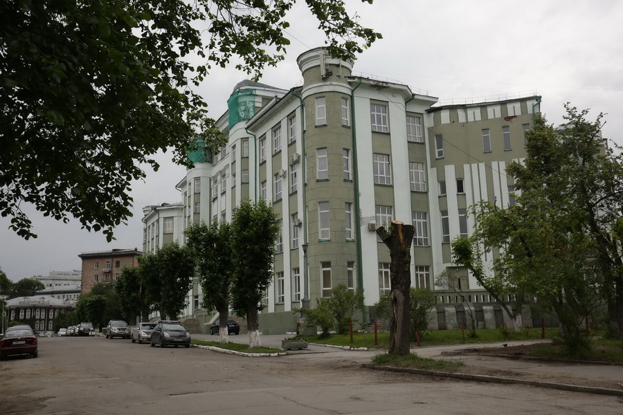 Сергей Чумаченко: Да, это один комплекс, который был построен в 1920-е годы, и первоначально он воспринимался как будущее главное общественное здание нашего города. Собственно, улица Щетинкина именно поэтому проходит под очень странным углом. Центр города — это, казалось бы, квадратная квартальная разбивка. И тут улица Щетинкина, которая наискосок проходит через квартал.
