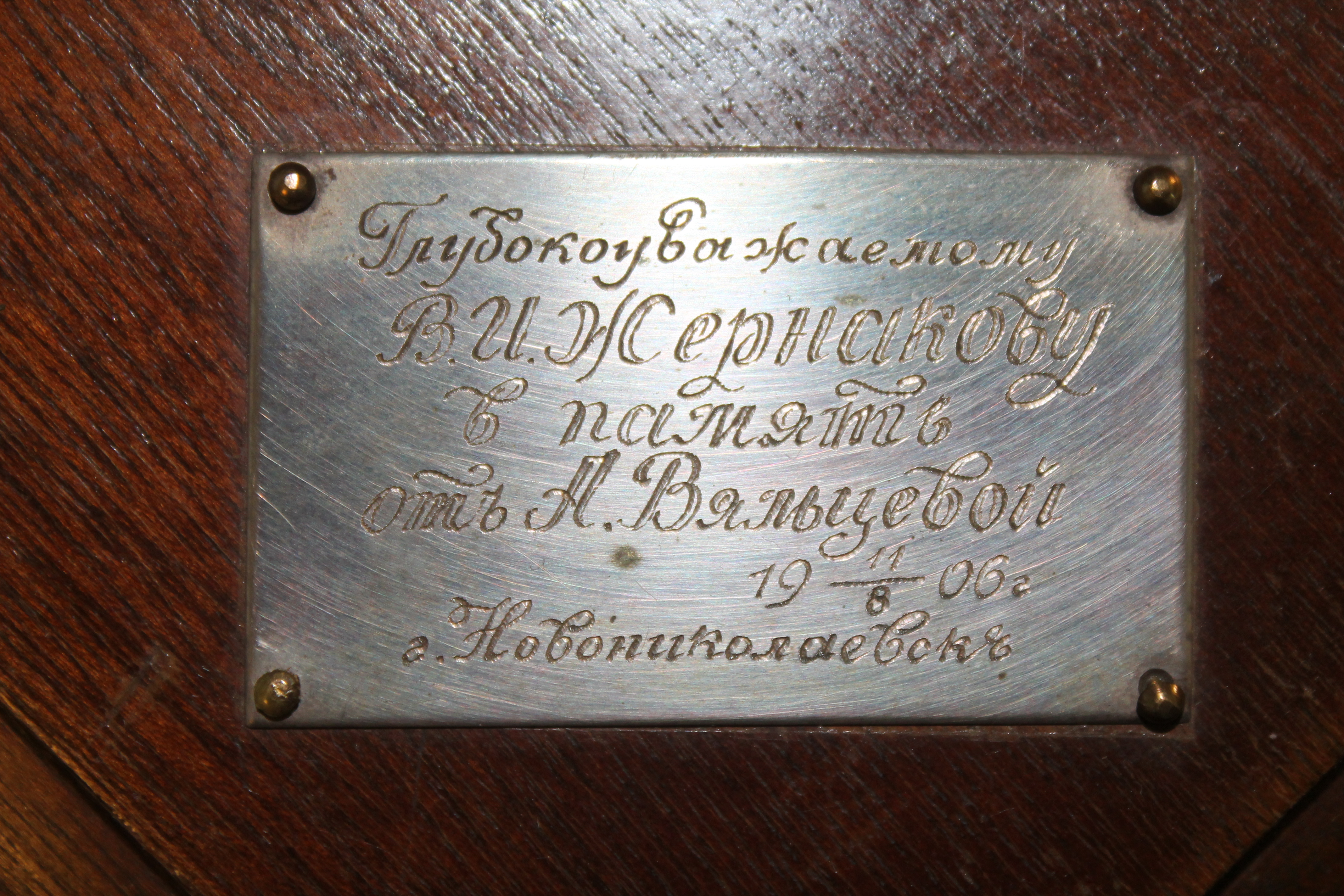 Евгений Ларин: Это точно вопрос дальнейшего исследования — очень интересно все-таки узнать обстоятельства дарения. Почему именно Жернакову? Как Владимир Ипполитович расстался с подарком и где этот предмет был все эти годы? И почему мы всё-таки так мало знаем о том визите Анастасии Вяльцовой в наш город? Самое интересное, что местные газеты никак не осветили этот вопрос. Либо я плохо искал. Дело в том, что в 1906 году Николай Павлович Литвинов уже вовсю печатал газеты. Правда, последний номер «Народной летописи» в 1906 году — это номер 51 — датируется 13 июля 1906 года. После этого газету закрыли, и её выпуск ненадолго возобновился в 1909 году. Но Литвинов издавал и другие газеты, а вот что именно он печатал в августе 1906 года, мне неизвестно. Но газеты, — ново-николаевские или томские, — не должны были оставить приезд Вяльцевой без внимания. Или она приехала инкогнито и поэтому её визит оставили тайной?