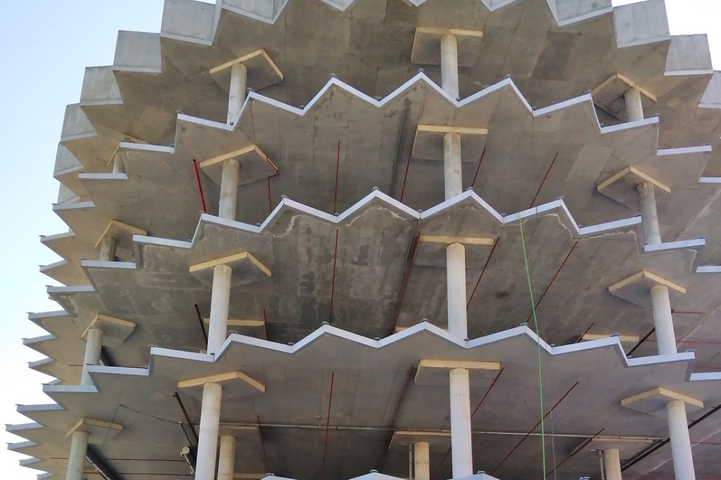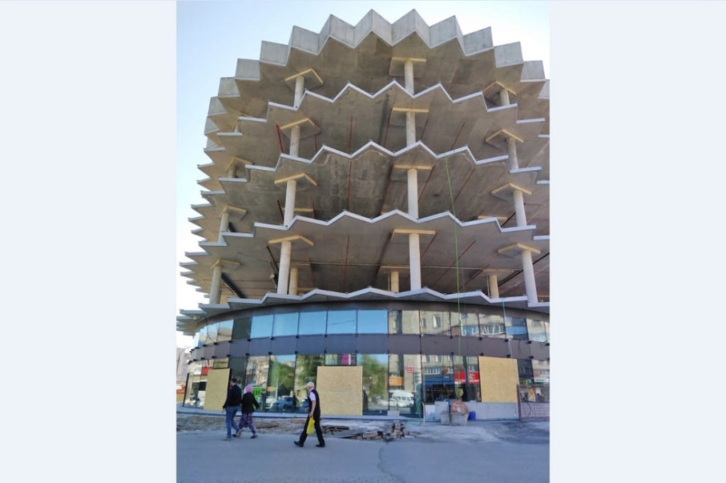 Строительство ТЦ «Грани» вышло на самый ответственный этап — монтаж ребристого зеркального фасада из стеклянных треугольников с синим оттенком. Несколько сегментов уже смонтировали на ту часть здания, что выходит в сторону улицы Покрышкина. Ребристым фасадом из треугольников строителям предстоит закрыть второй, третий, четвёртый и пятый этажи. Внешние стены первого этажа смонтировали из больших прямоугольных стеклопакетов с армированным стеклом. Если оно разобьётся, то просто растрескается, но из профиля не выпадет и не рассыплется.