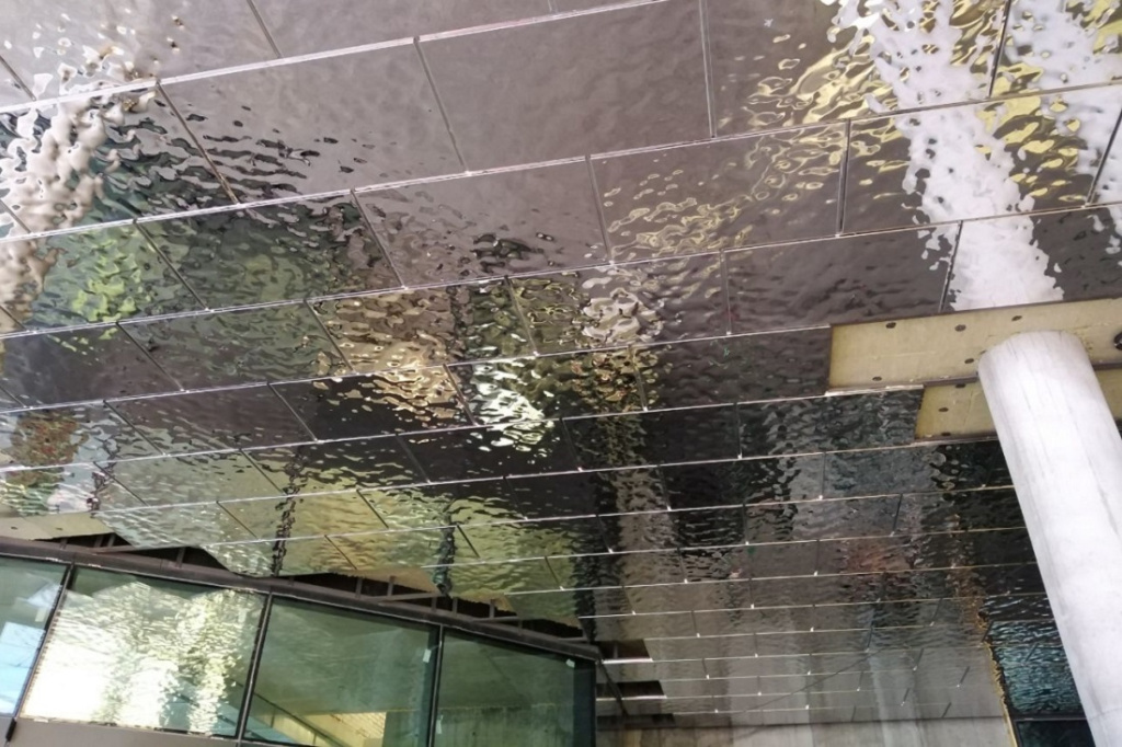 Потолок галереи, ведущий сквозь здание от станции метро «Площадь Маркса» к трамвайным остановкам и улице Титова, отделали фактурными зеркальными панелями. Ограждение вокруг здания частично убрали, поэтому сквозь стеклянные стены можно увидеть, что внутри нового торгового центра уже смонтировали эскалаторы и уложили на пол керамогранит.