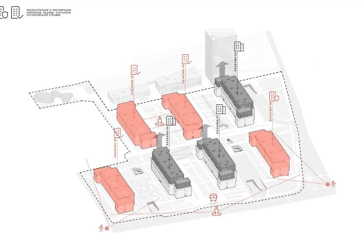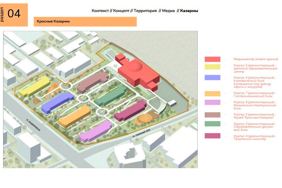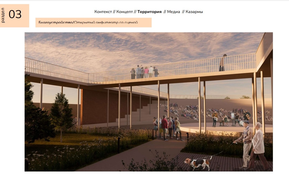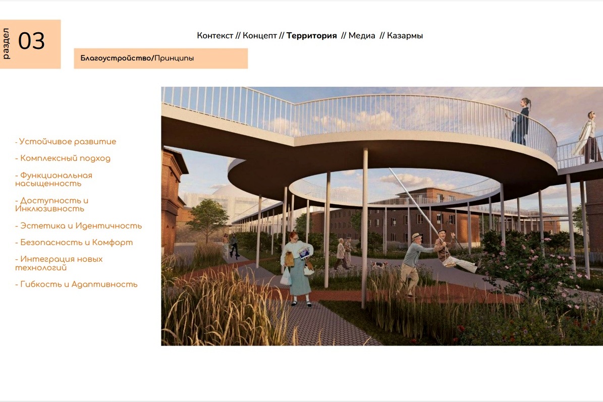 Концепция «История в диалоге с современностью» предусматривает для казарм новый функционал с сохранением образов и силуэтов. Стеклянное здание ломанной формы — это музей и медиацентр. Казармы реконструируют по принципу: сохранение — восстановление — бережное отношение. На территории обустроят прогулочные зоны с игровыми площадками и антивандальными амфитеатрами. Туннельные проезды оформят перголами. В комплекс планируют объединить фудкорт, гостиницу, детскую школу искусств, тёплый бульвар, креативные офисы, здание медиацентра.