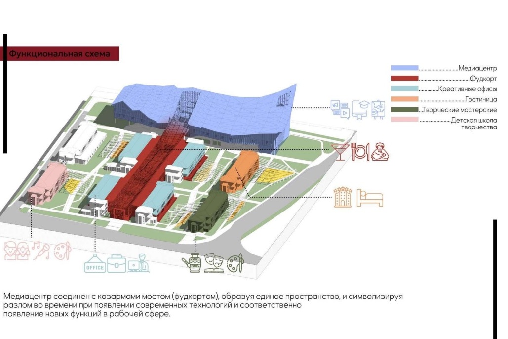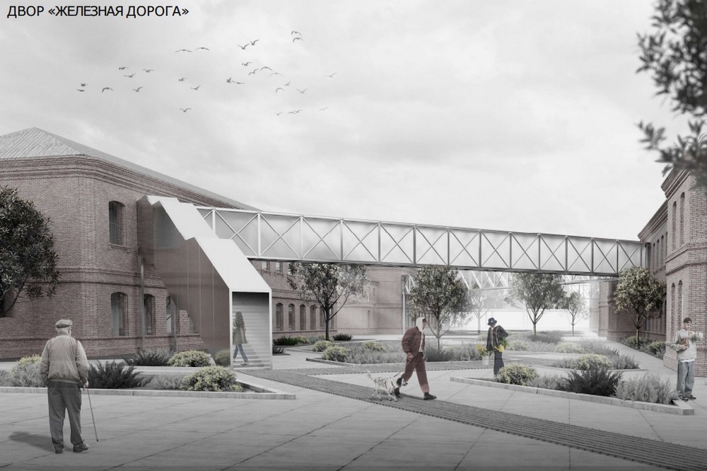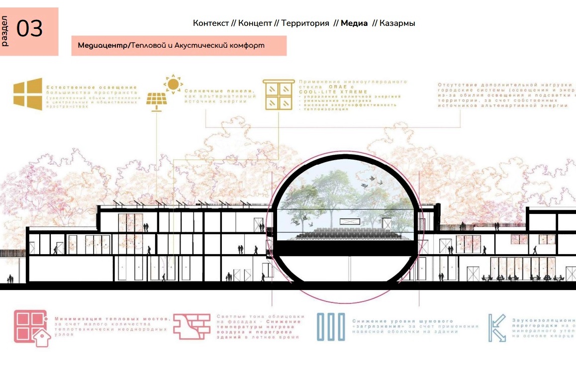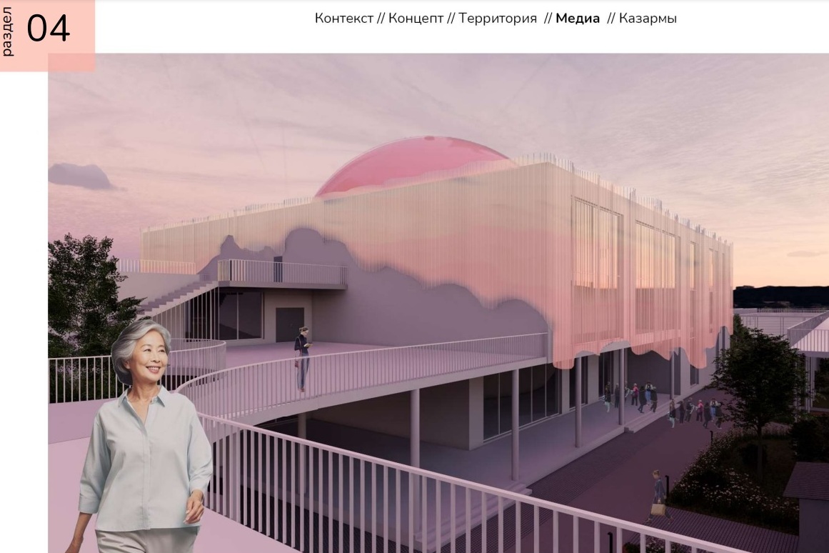 Концепция «История в диалоге с современностью» предусматривает для казарм новый функционал с сохранением образов и силуэтов. Стеклянное здание ломанной формы — это музей и медиацентр. Казармы реконструируют по принципу: сохранение — восстановление — бережное отношение. На территории обустроят прогулочные зоны с игровыми площадками и антивандальными амфитеатрами. Туннельные проезды оформят перголами. В комплекс планируют объединить фудкорт, гостиницу, детскую школу искусств, тёплый бульвар, креативные офисы, здание медиацентра.
