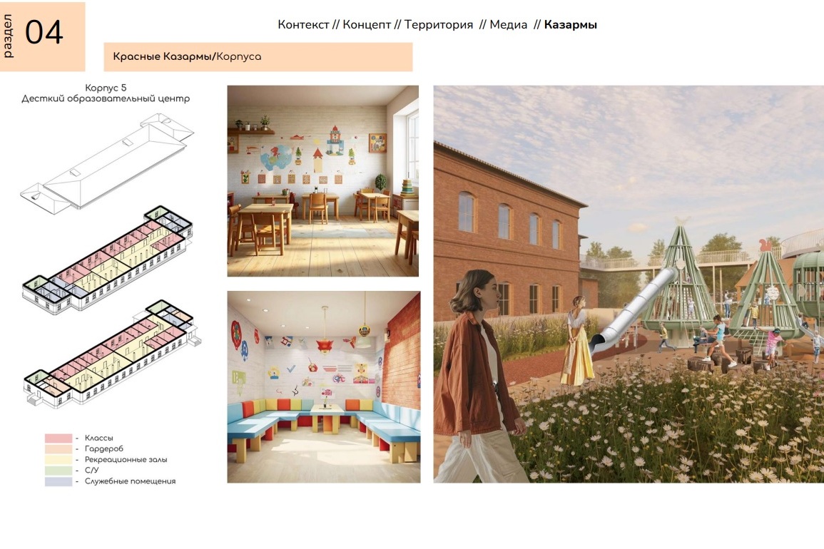 Концепт включает реконструкцию исторических корпусов, строительство медиацентра и двухэтажной подземной парковки, благоустройство территории. В комплексе обустроят центральную аллею с прогулочными зонам и качелями, детскую игровую площадку, скейт-парк, открытый амфитеатр со сценой, летний кинотеатр. Медиацентр станет новым сердцем, которое запускает жизнь в Красных казармах и становится центром, из которого выходят сосуды — аллегория двухуровневых переходов с людьми. Народное искусство пронизывает проект на разных уровнях, начиная от архитектурных деталей, заканчивая элементами декора в интерьерах.