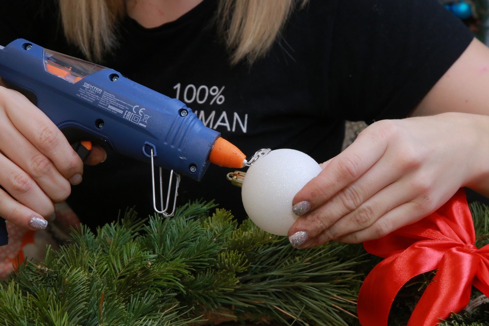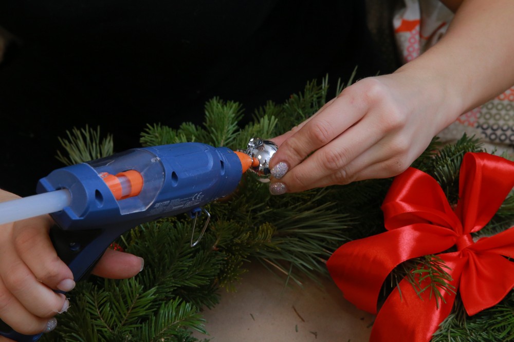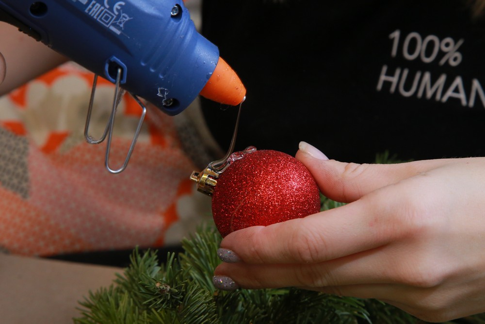 Теперь можно клеить. Выдавите чуть-чуть клея на аксессуар и закрепите его на еловой конструкции. Старайтесь на несколько секунд прижимать элементы к веткам, чтобы они казались единым целым.