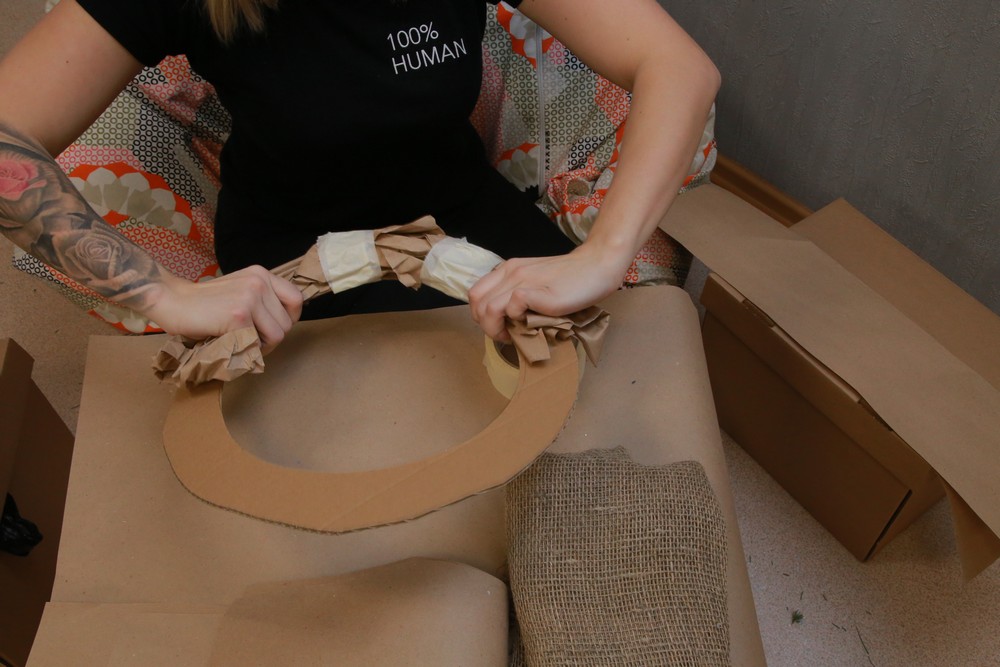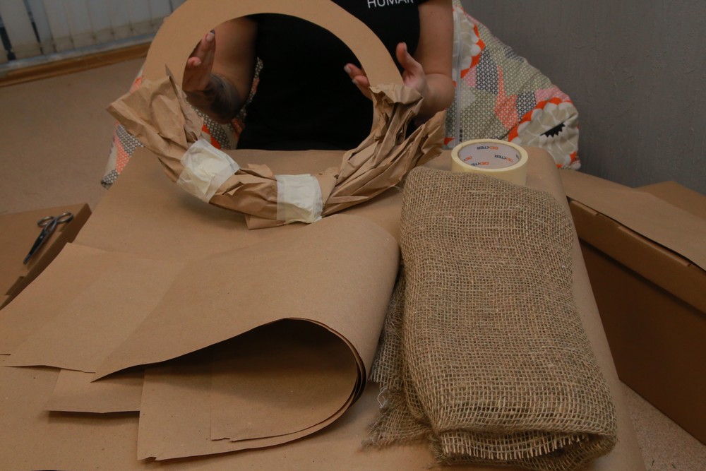 Для придания объёма готовую форму обматываем скотч-лентой и крепим на него мешковину, предварительно порезанную на полосочки. Также можно использовать смятую бумагу, газеты или другой подходящий материал.