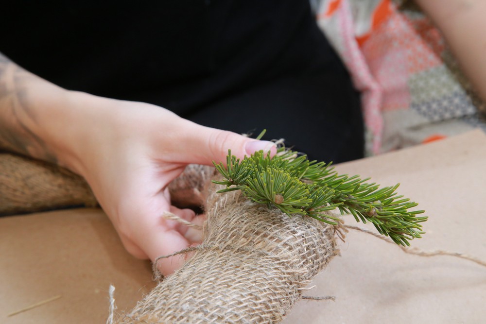 Веточки по 3-4 штучки выкладываем на основу «букетиком» в направлении от себя и обматываем сверху верёвочкой. При этом обрезать её не нужно.