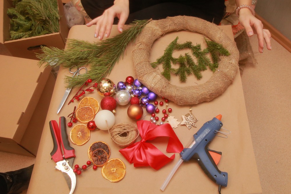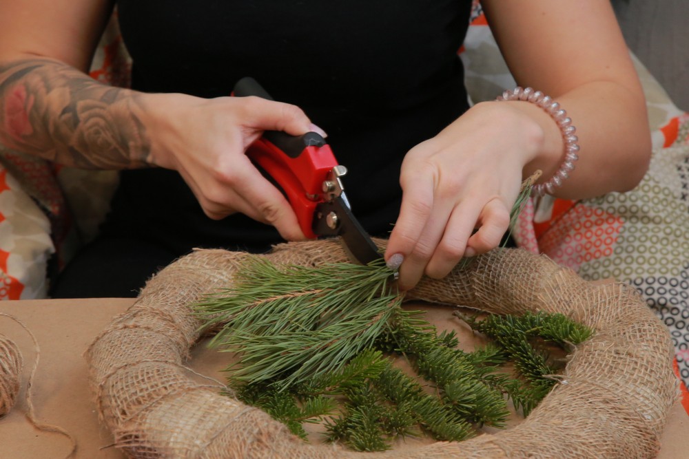 Еловые ветки можно купить в специальных магазинах или на ёлочных базарах. На одно украшение понадобятся две связки веточек. Также для поделки можно купить пихтовые лапки. Именно пихта даёт нам тот самый неповторимый новогодний запах.