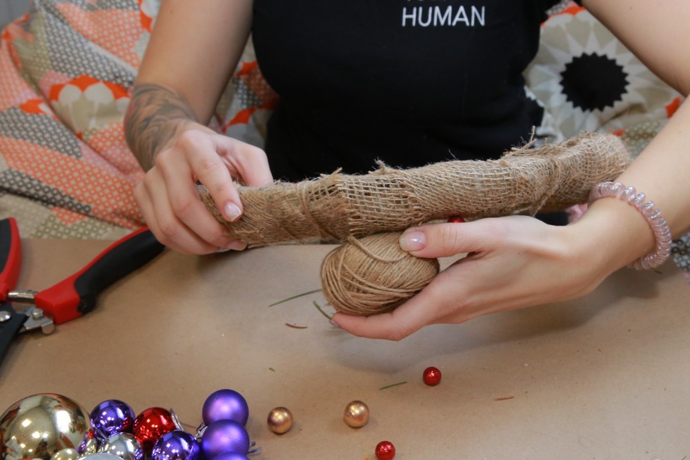 Затем снова добавляем веточки и также обматываем верёвкой через каркас. Таким образом нам нужно пройти весь круг сверху вниз.