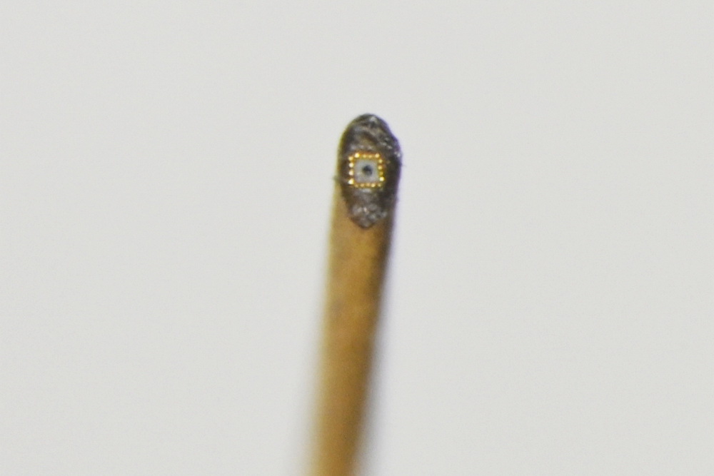 По его словам, появилось крошечное «полотно» так: сначала на торце волоса он поставил пятно белой краски. Когда она подсохла, острым резцом аккуратно оставил только белый квадрат и одним прикосновением тончайшего волоска с краской на кончике нанёс по центру чёрную точку. Рамку вокруг неё сделал из малюсеньких золотых шариков в 3–4 микрона (толщина подковы у блохи). Всего на изготовление маленького произведения художник потратил два дня.