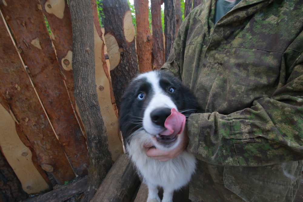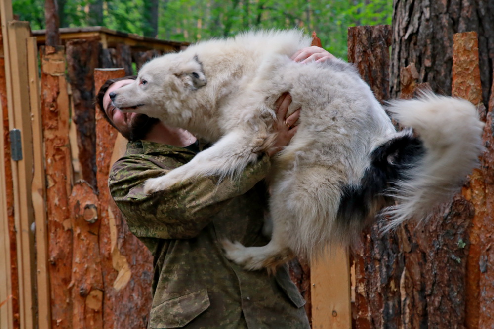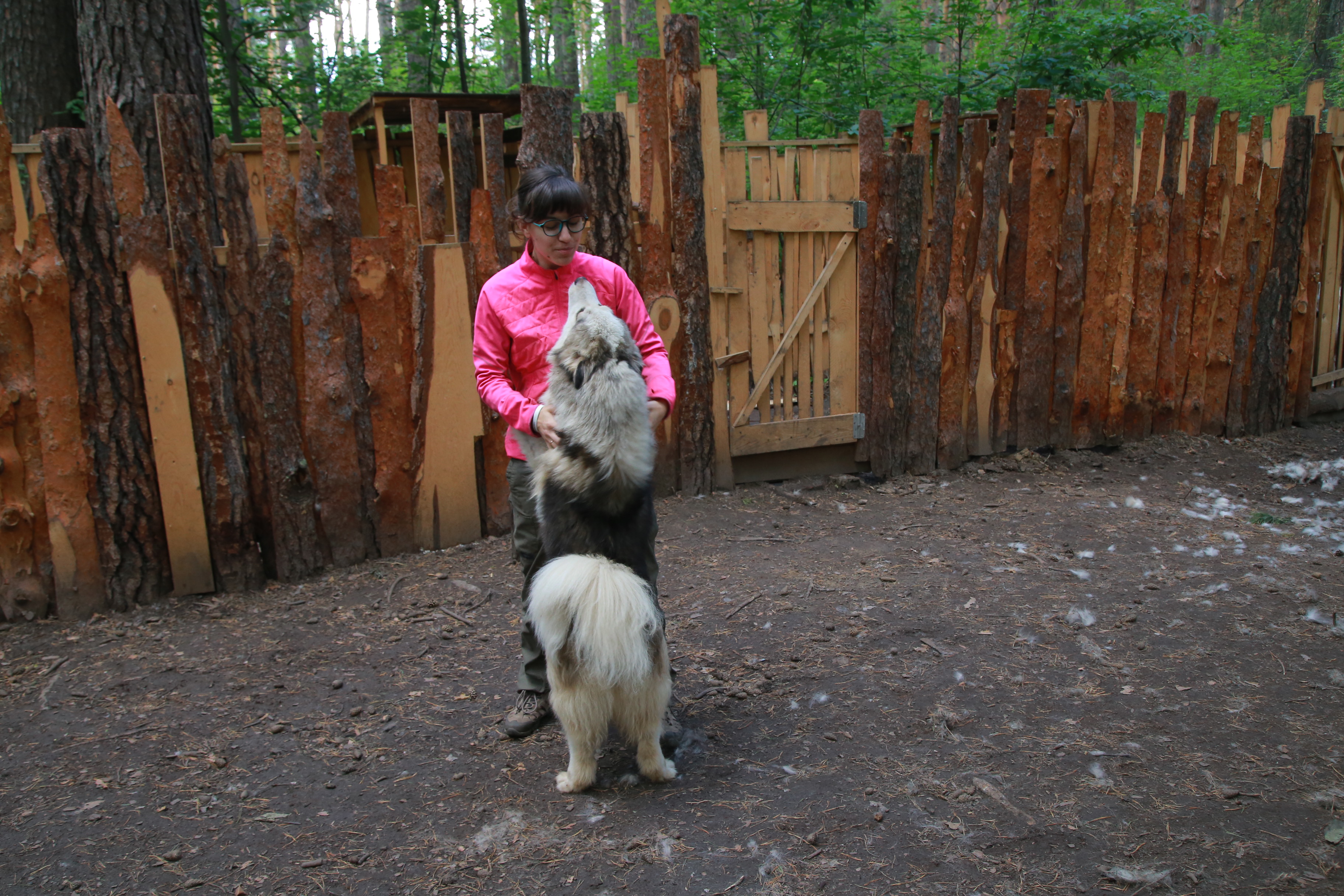 Звезда фермы — лайка по кличке Ляпа — ловко запрыгивает на плечо хозяину. С девушками огромные лохматые псы ведут себя тактичнее, но всё же свою порцию ласк ни за что не упустят.