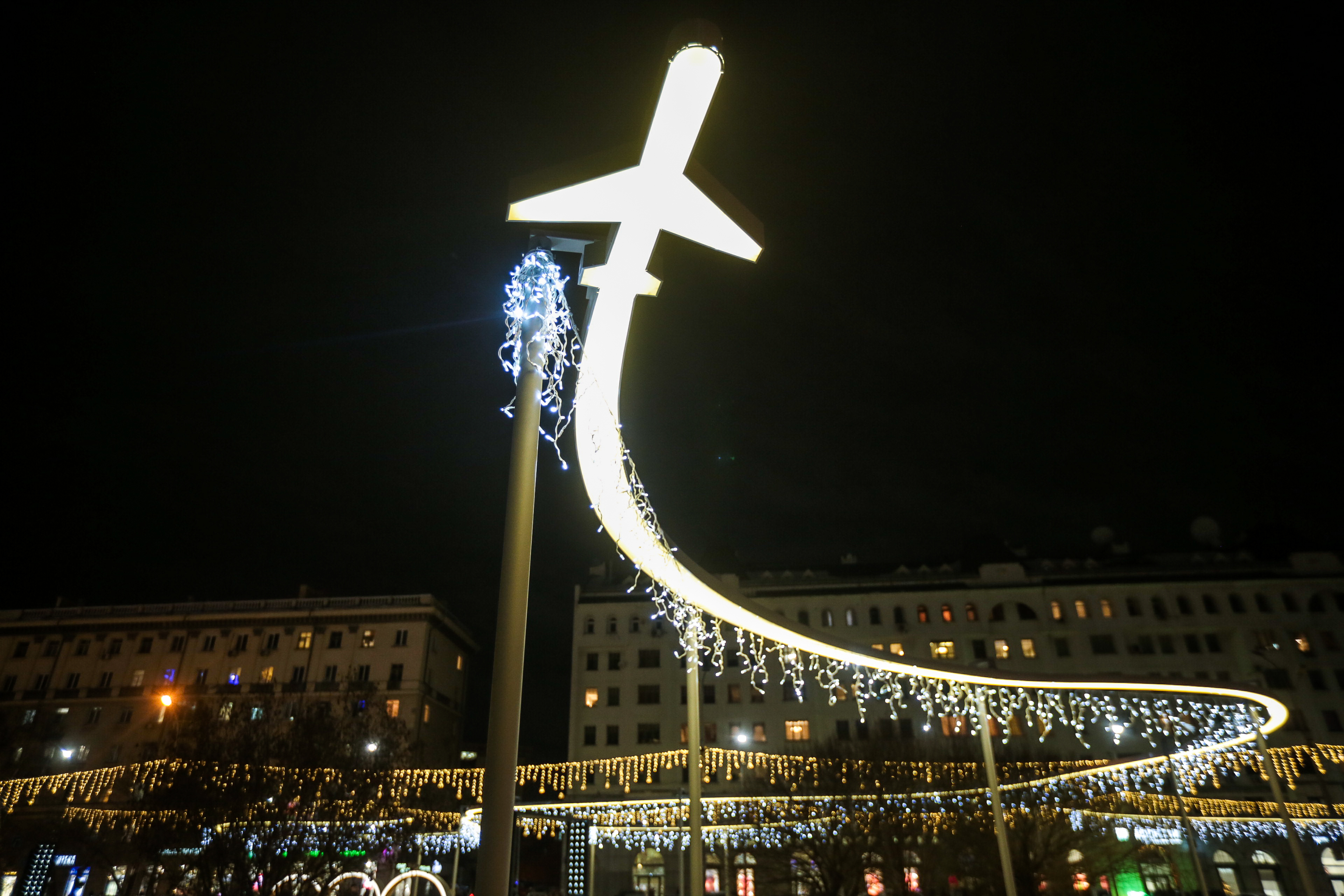 На этой неделе включили иллюминацию в обновлённом сквере «Крылья Сибири» на Орджоникидзе. Здесь можно полюбоваться необычными композициями в виде следов от взлетающих самолётов, оценить подсветку оригинальных лавочек и качелей.