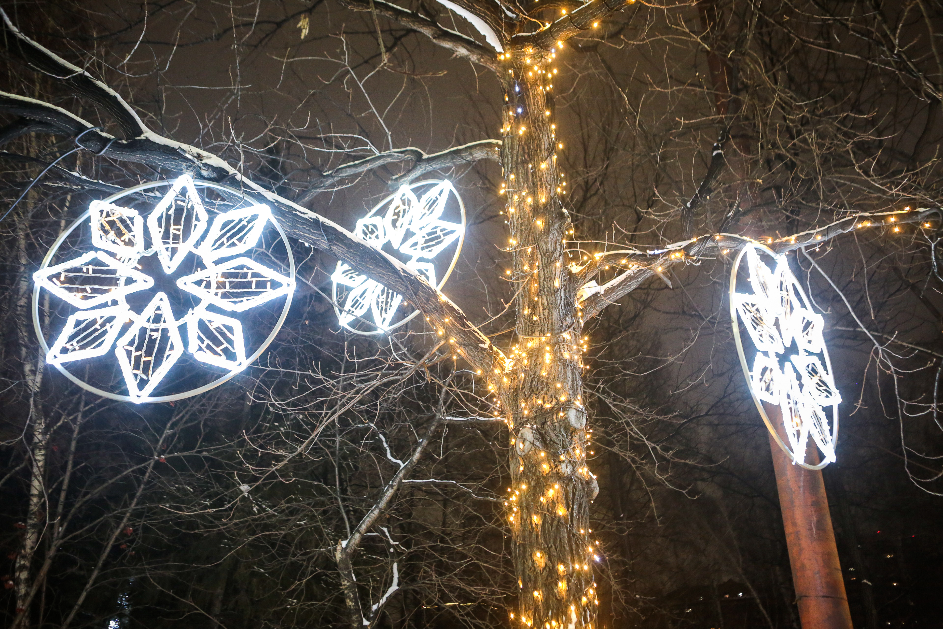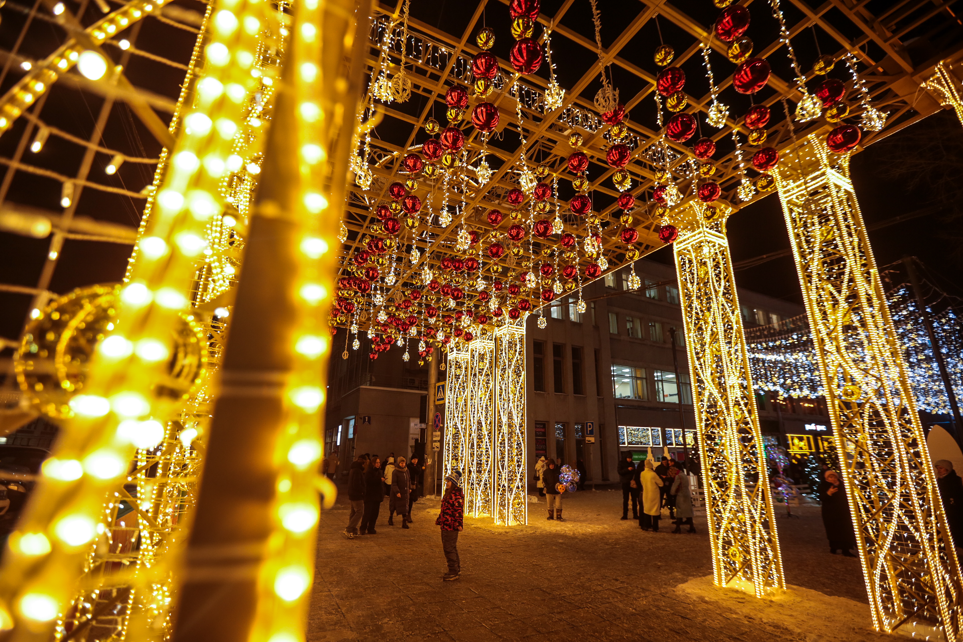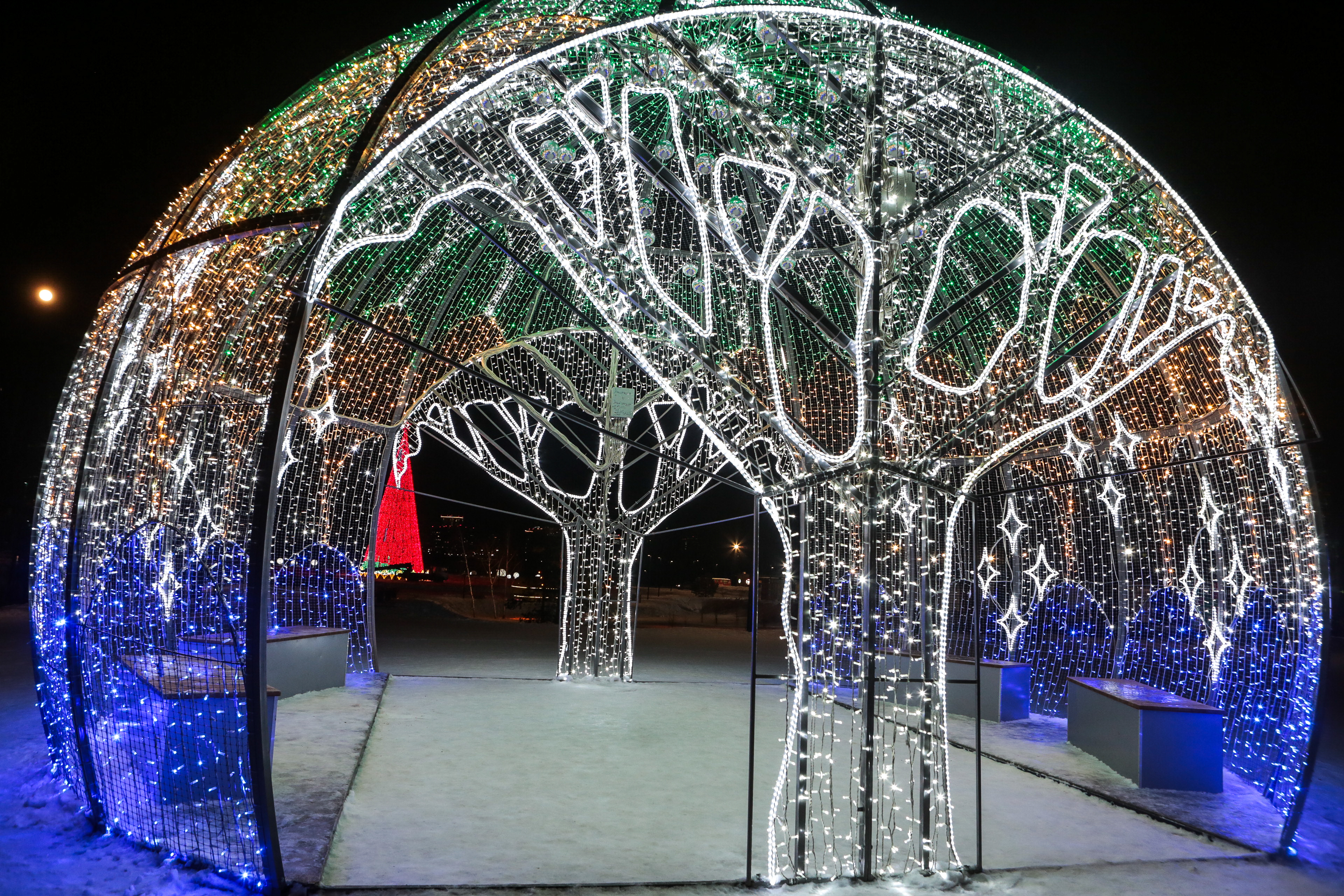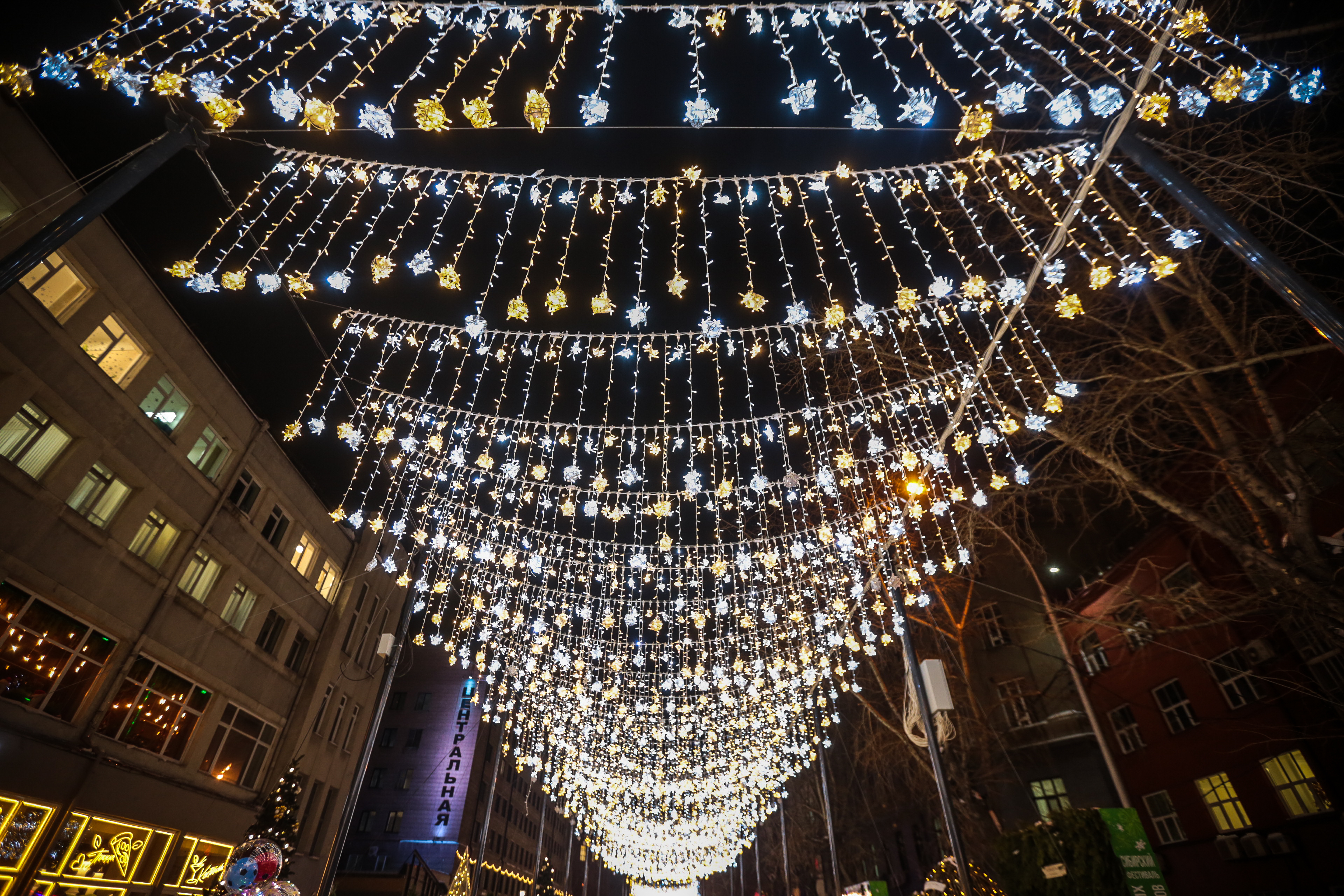Сияющий световой потолок разместили на центральной аллее — от входа с улицы Мичурина до музыкального театра. Прошлой зимой эта конструкция украшала пешеходную улицу Ленина на отрезке от Советской до Урицкого. В новом сезоне этот участок дороги не стали перекрывать на праздники — решили ограничиться только одним кварталом, поэтому часть гирлянд там уже не понадобилась. Её решили перенести в Центральный парк.