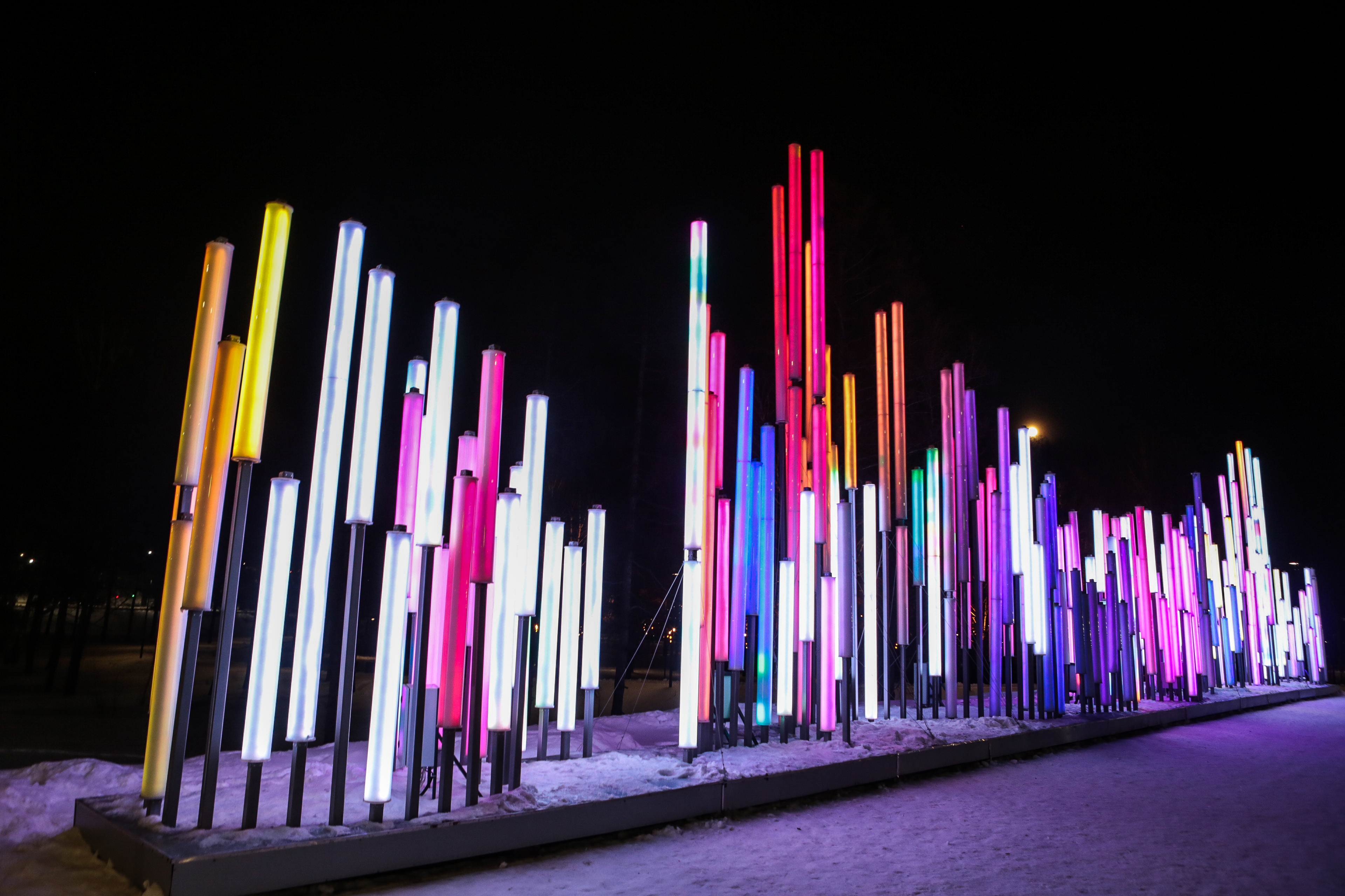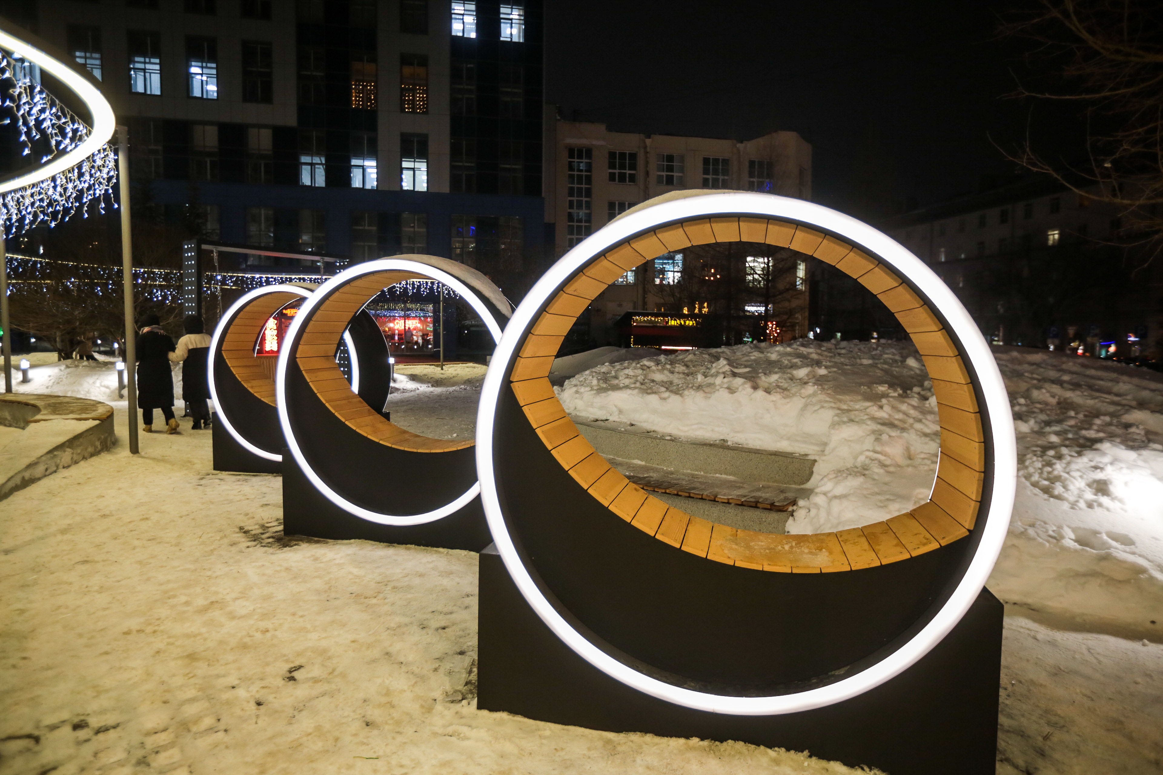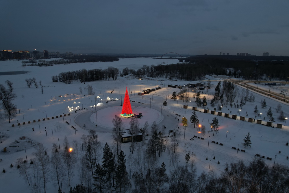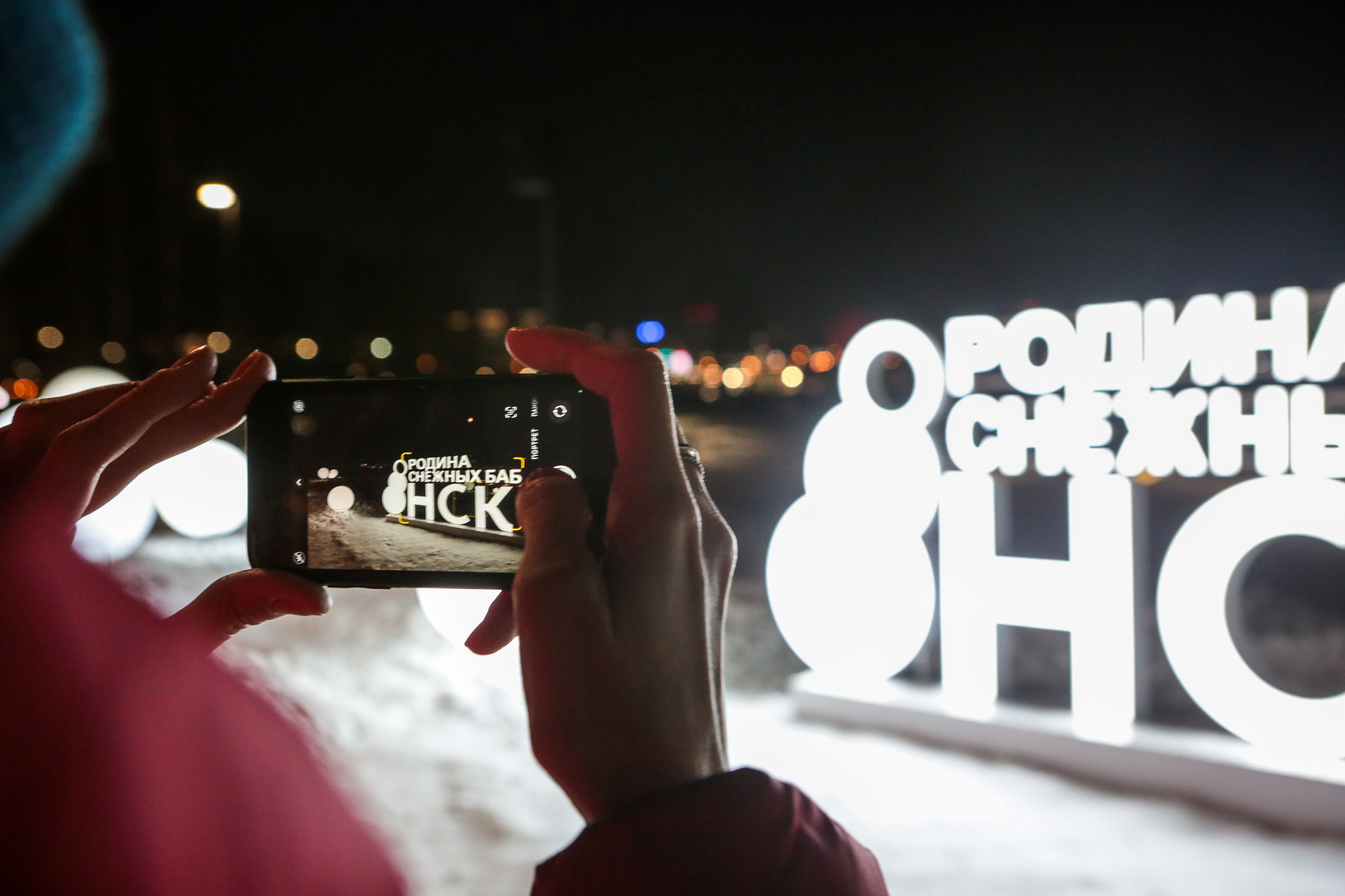 Принарядился и самый новый парк Новосибирска — возле ЛДС «Сибирь-Арена». Помимо уже знакомых всем цифровой ёлки, сверкающей беседки и инсталляции, имитирующей северное сияние, здесь появилась композиция, оповещающая прохожих о том, что наш город — родина снежных баб.