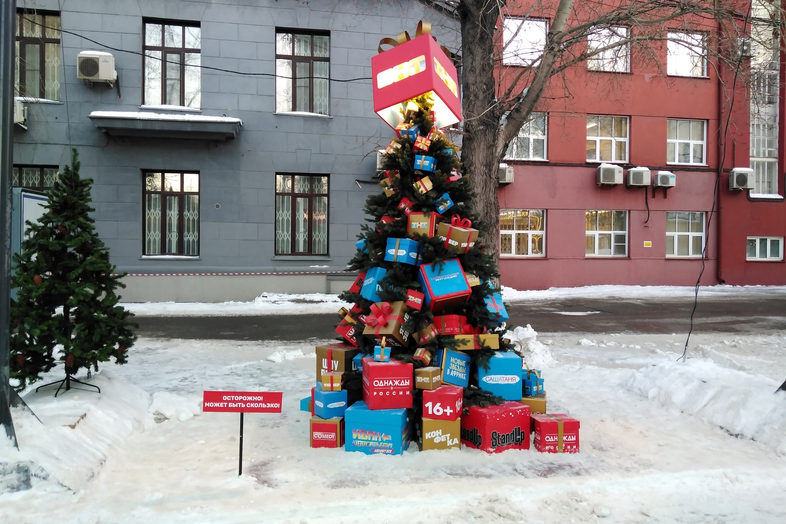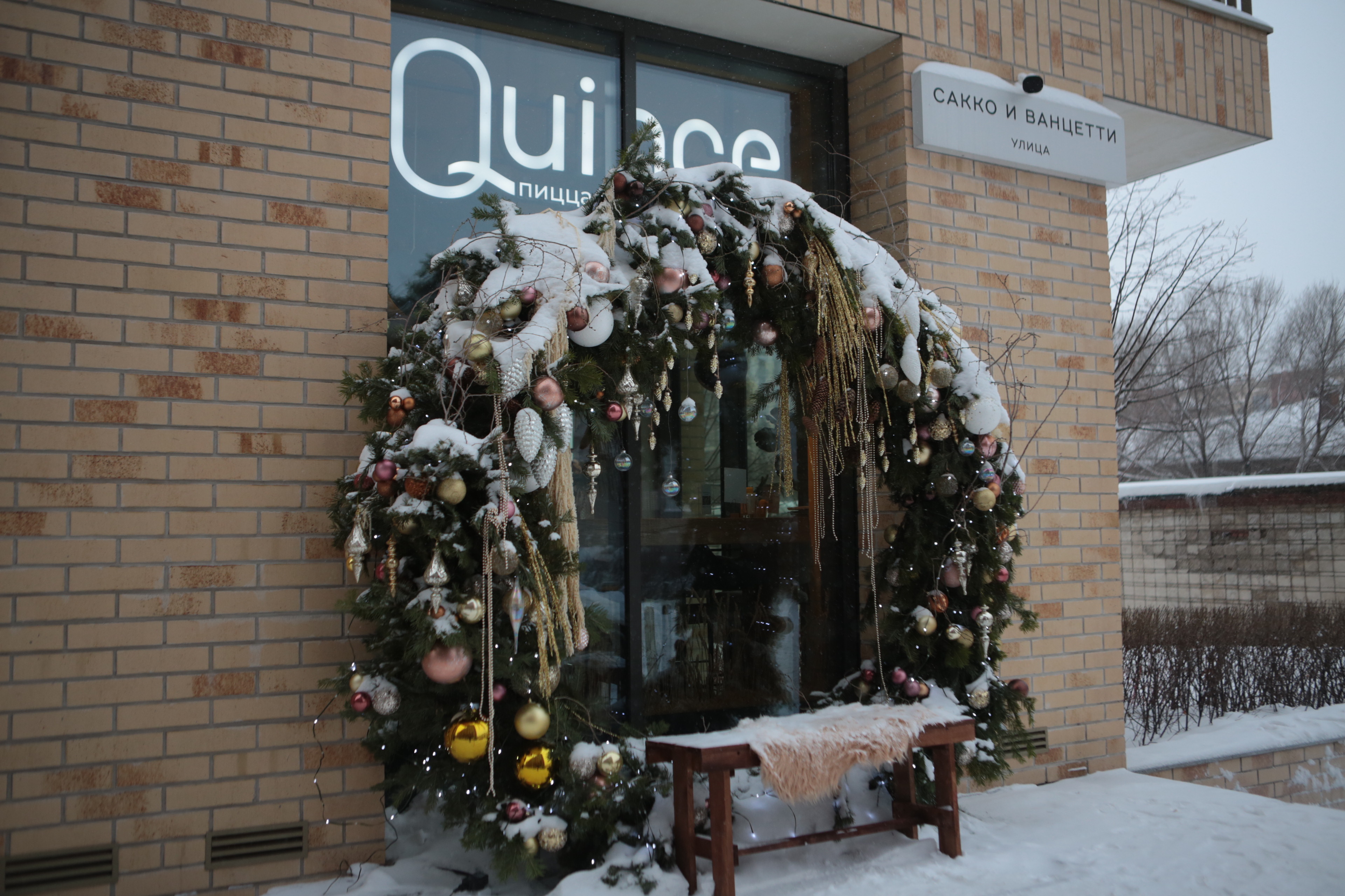 Симпатичная инсталляция возвышается рядом с входом в кафе у дома №25/1. Все, кто проходит мимо, обязательно садятся под хвойную арку, чтобы загадать желание.