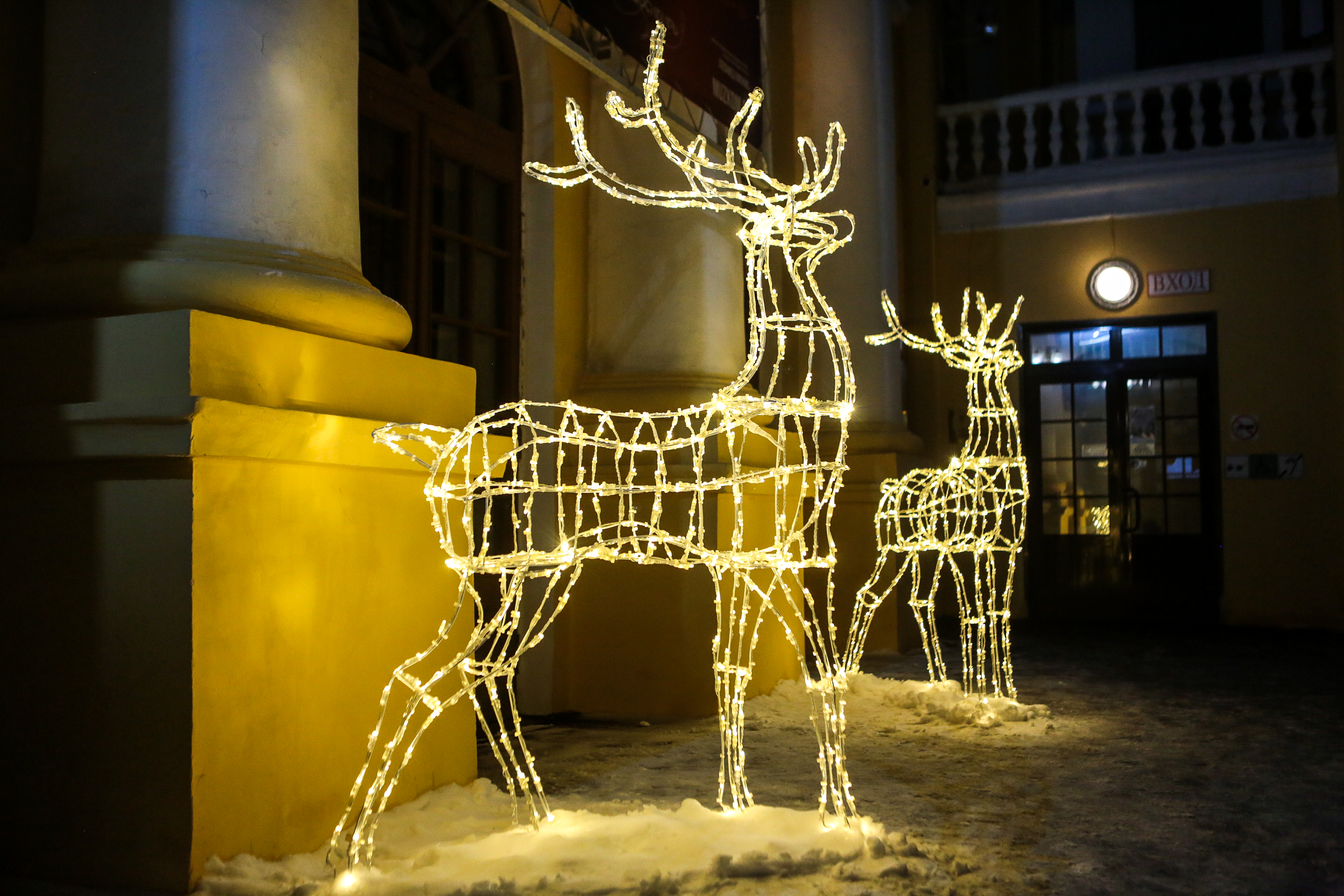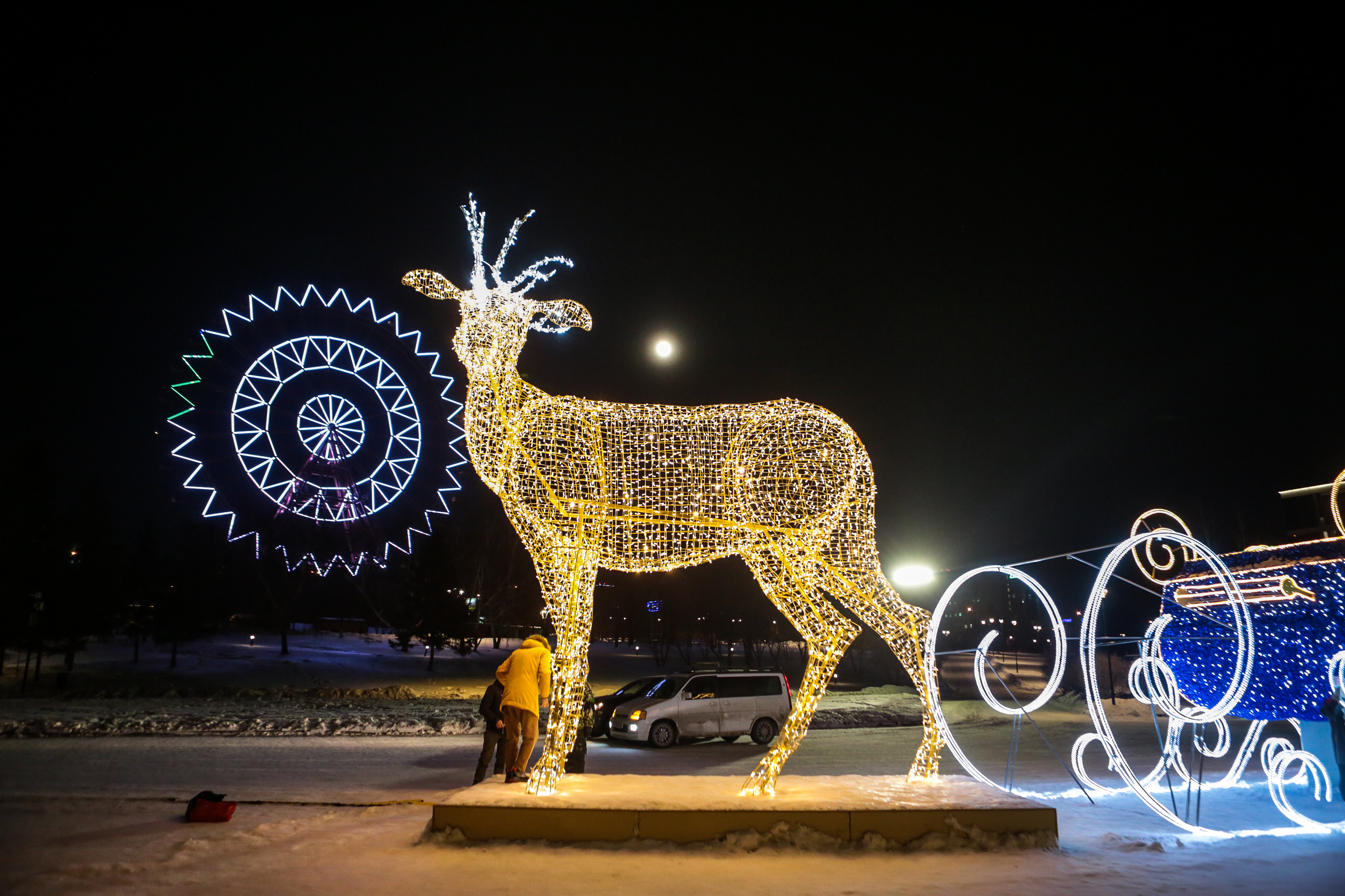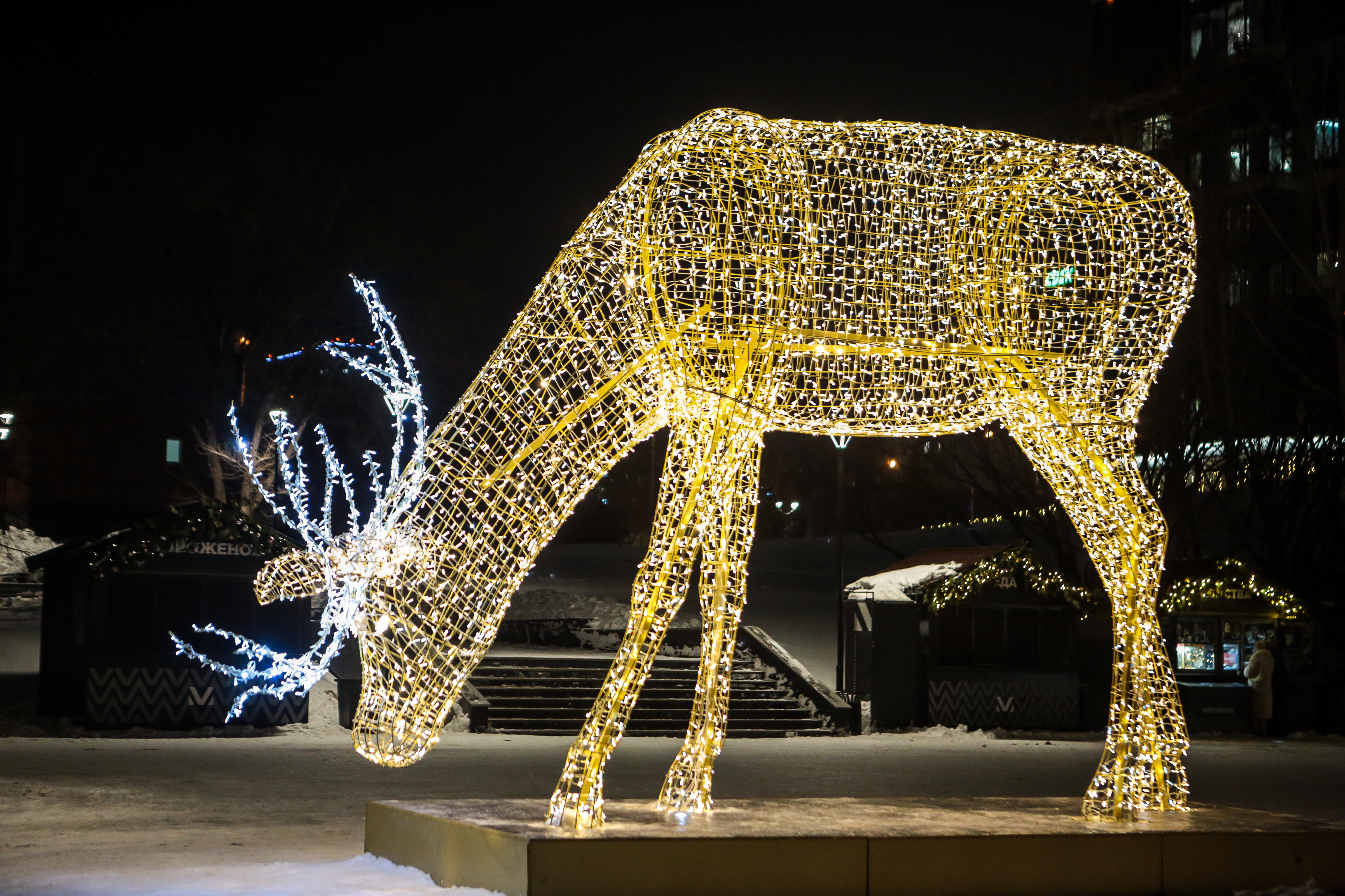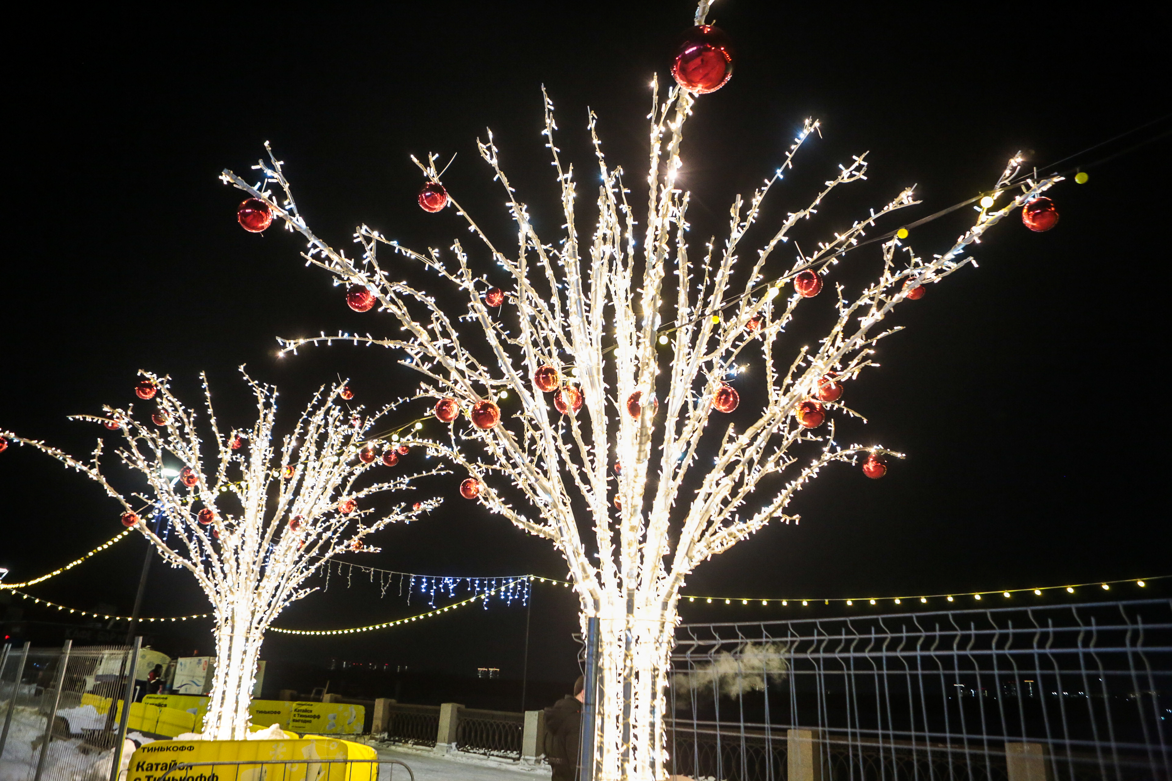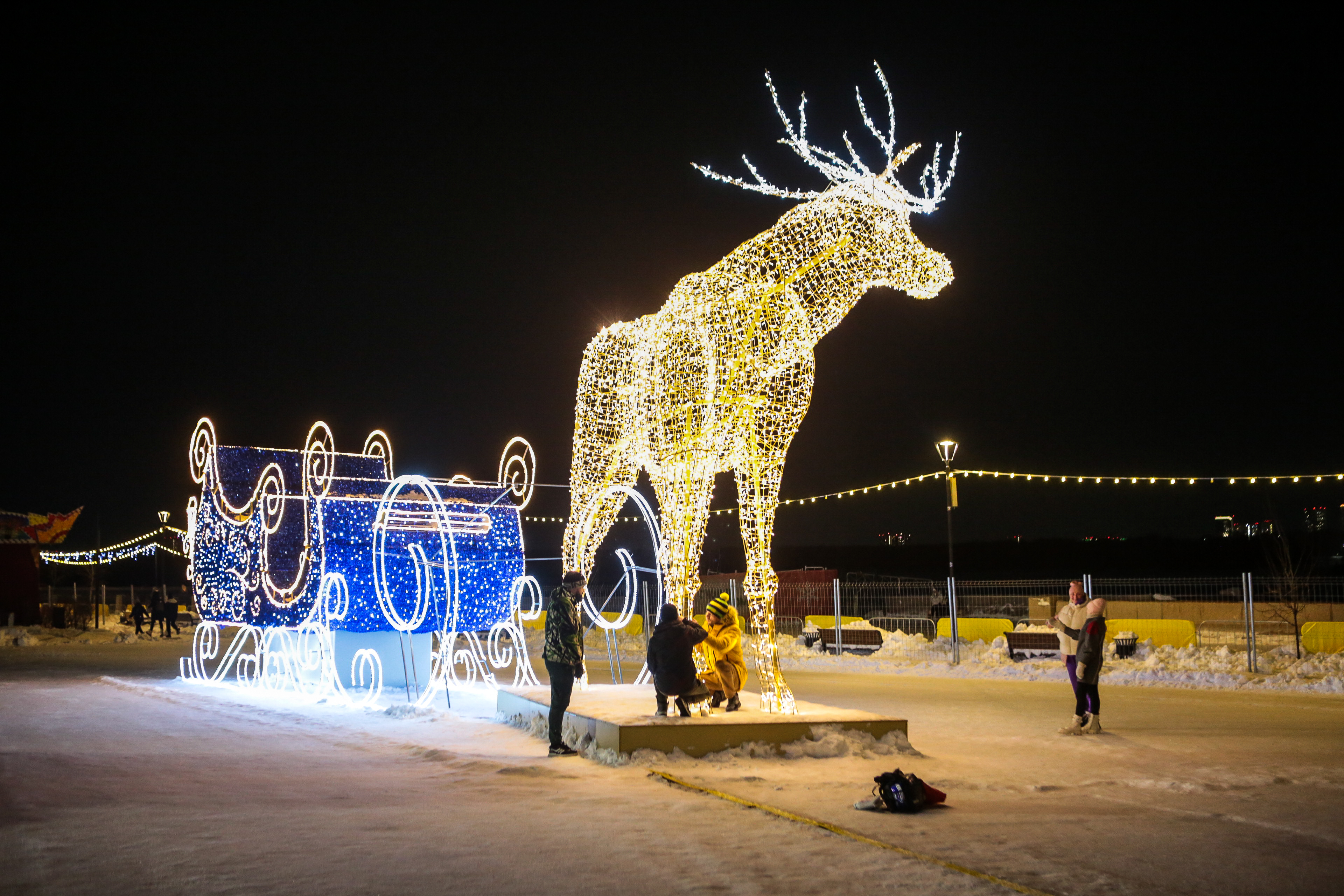 Светящиеся деревья по традиции украшают главную аллею вдоль Оби. Кроме того, в этом году на набережную переехали сияющие инсталляции в виде оленей, прошлой зимой стоявшие в Первомайском сквере. Кто ещё не успел сфотографироваться на фоне волшебной повозки — вам сюда.