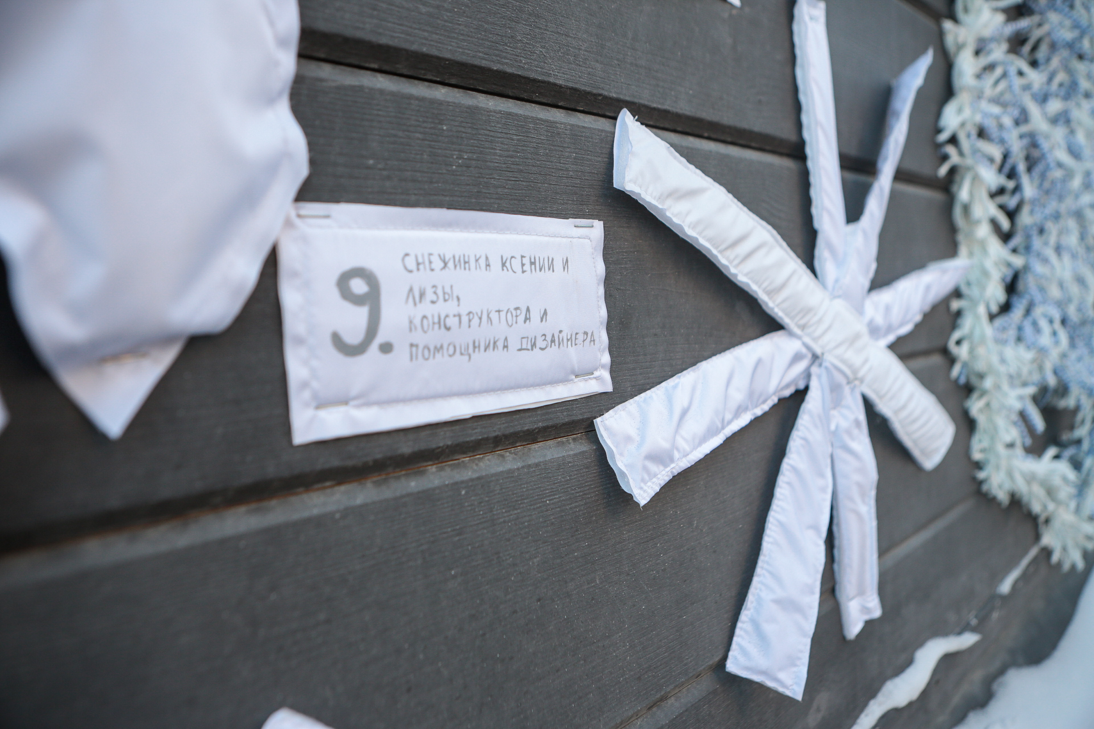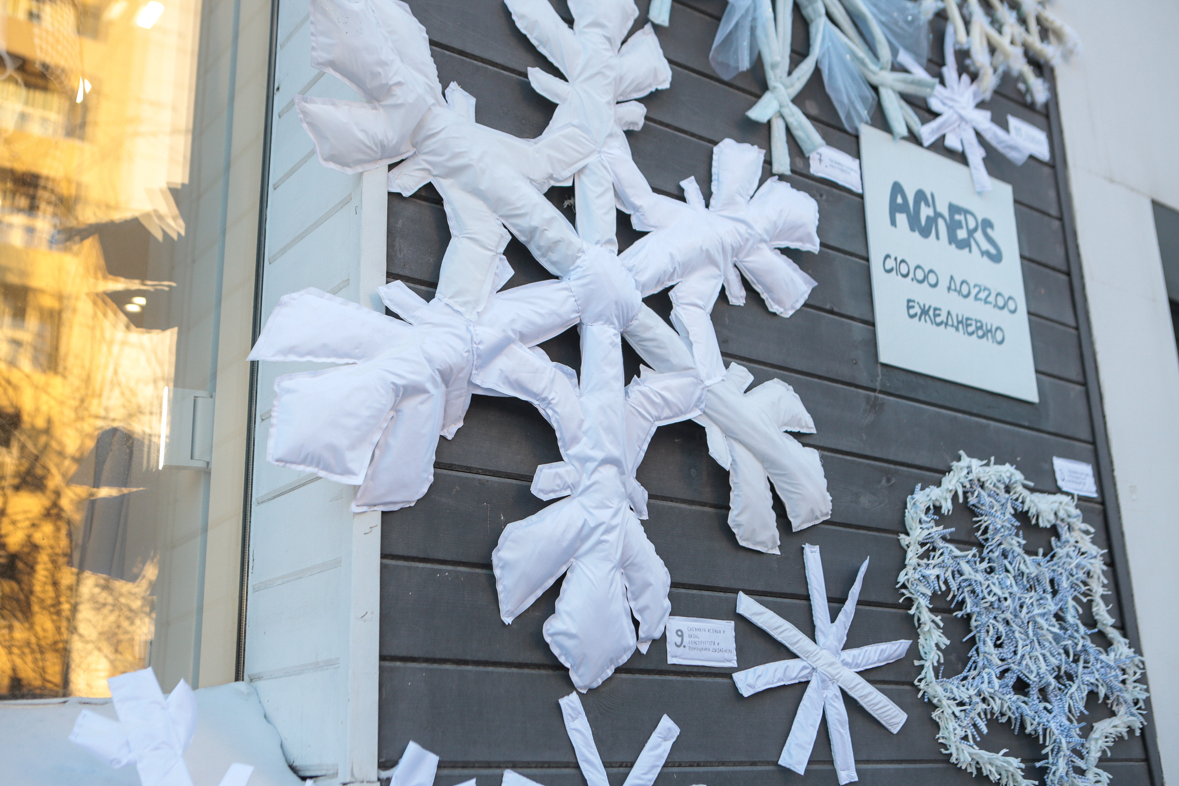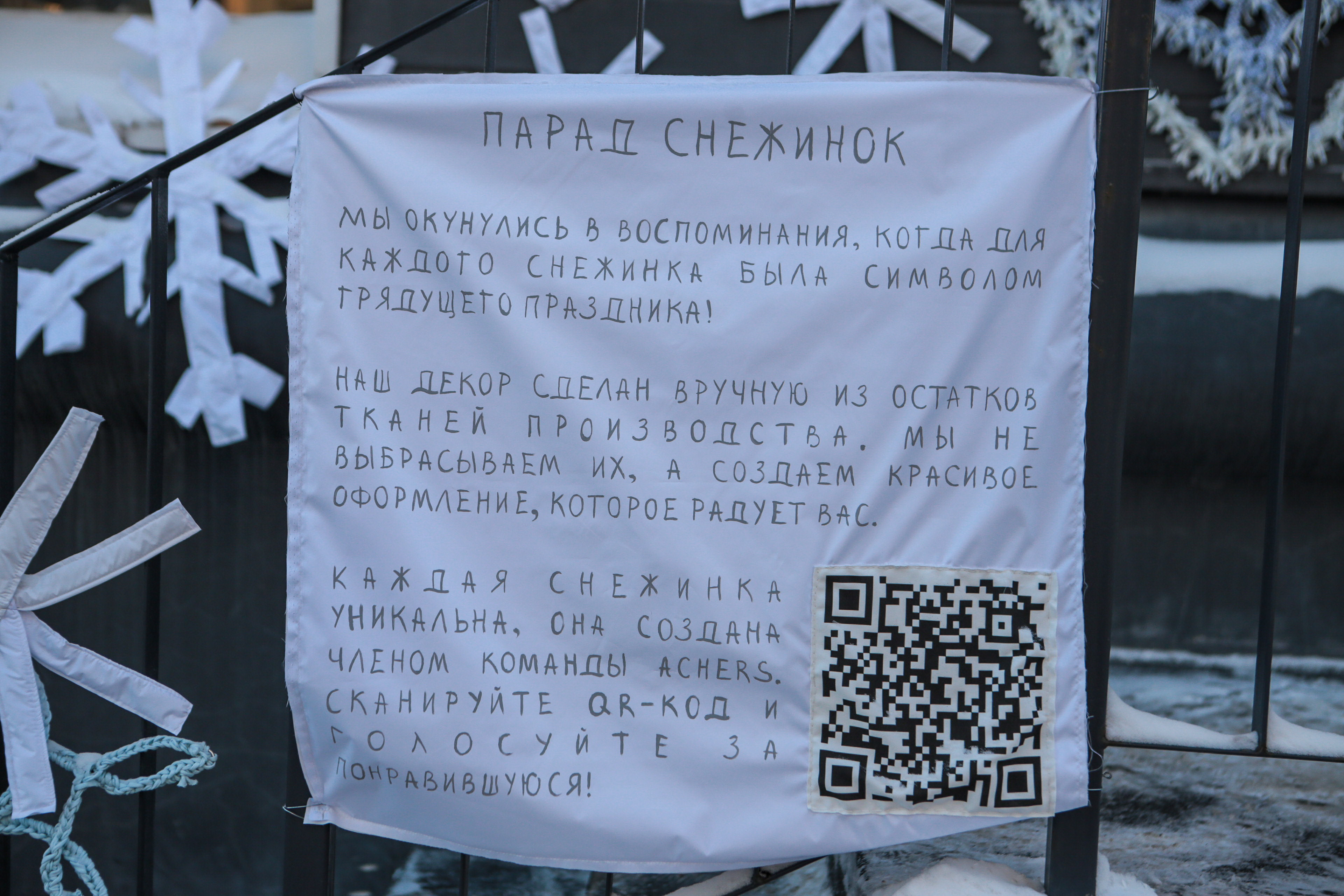 У магазина с одеждой на Ленина, 9 — парад снежинок. Все они сделаны вручную из остатков тканей с производства. Можно отсканировать QR-код и проголосовать за понравившуюся.