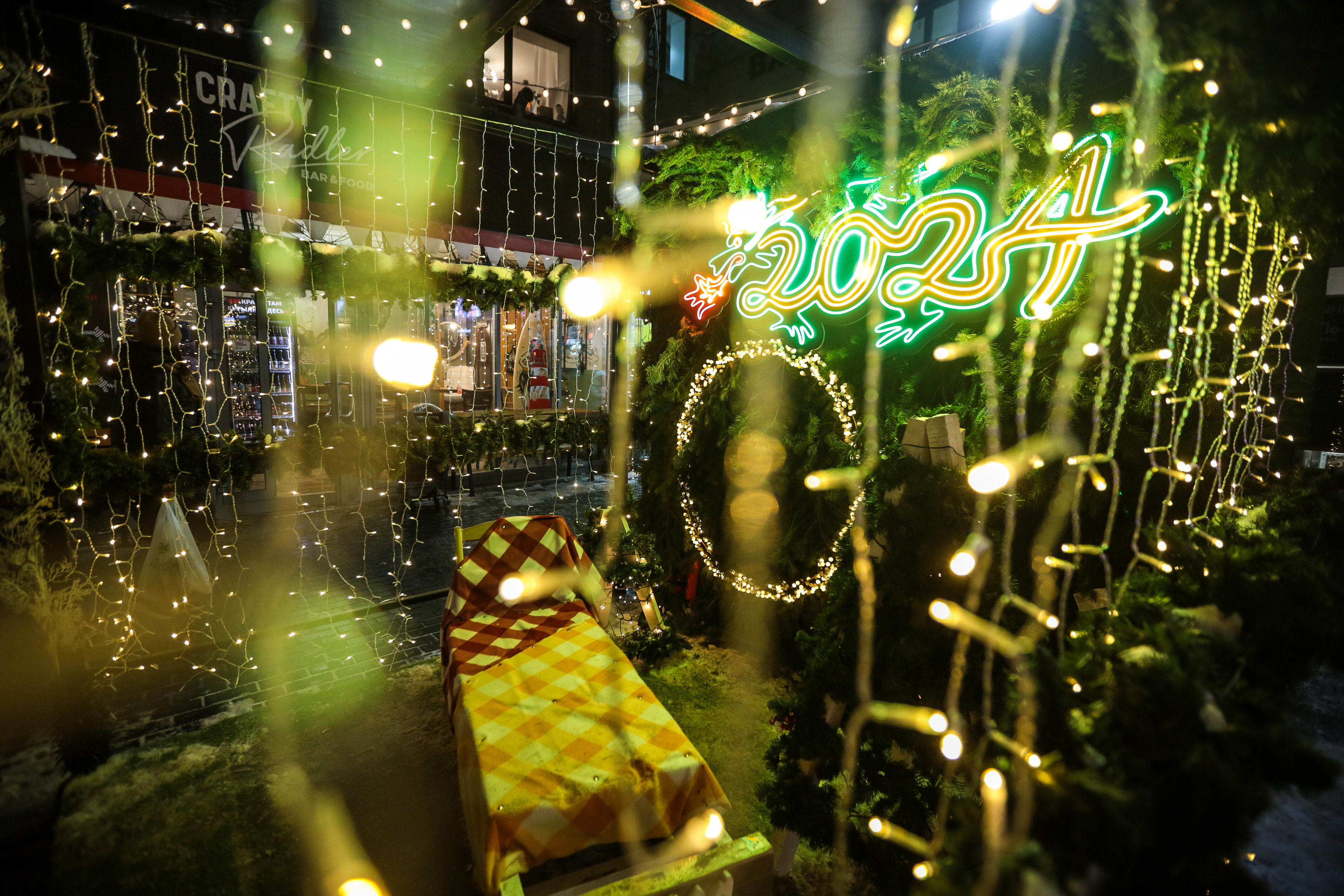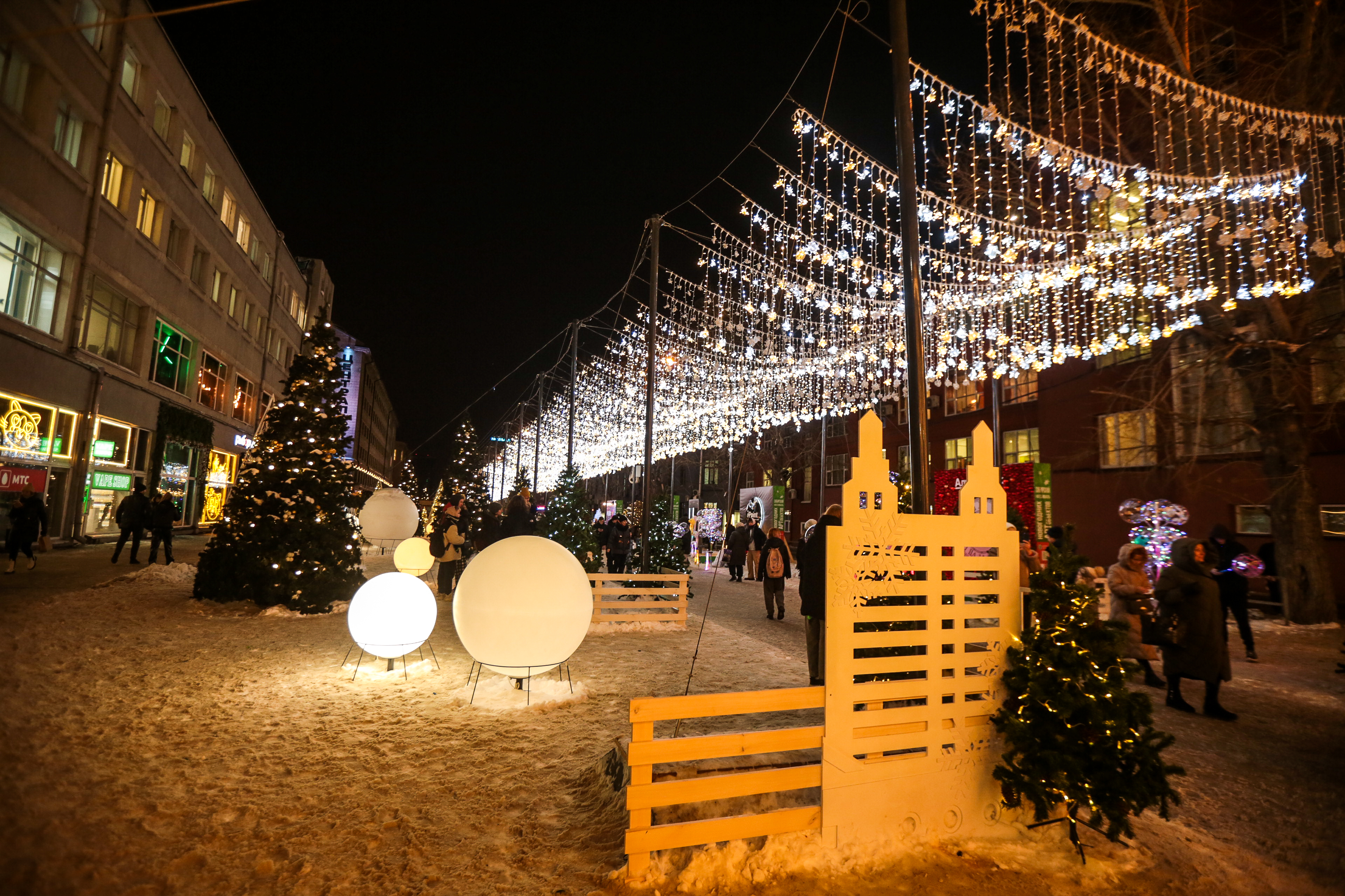 Пешеходная улица Ленина, как всегда, эпицентр праздника. В этом году там расставили необычные арт-объекты. У здания Госбанка всех встречает котик с монеткой. Говорят, если её потереть — обязательно станешь богатым. Очень нарядно выглядит подвесной потолок из гирлянд. Попробуйте навести фотокамеру снизу — кажется, что находишься в огромном сверкающем куполе. Привлекает знакомая всем локация с качелями и надписью «Всё сбудется» на веранде у дома №6. Хорошая традиция — загадывать желания.