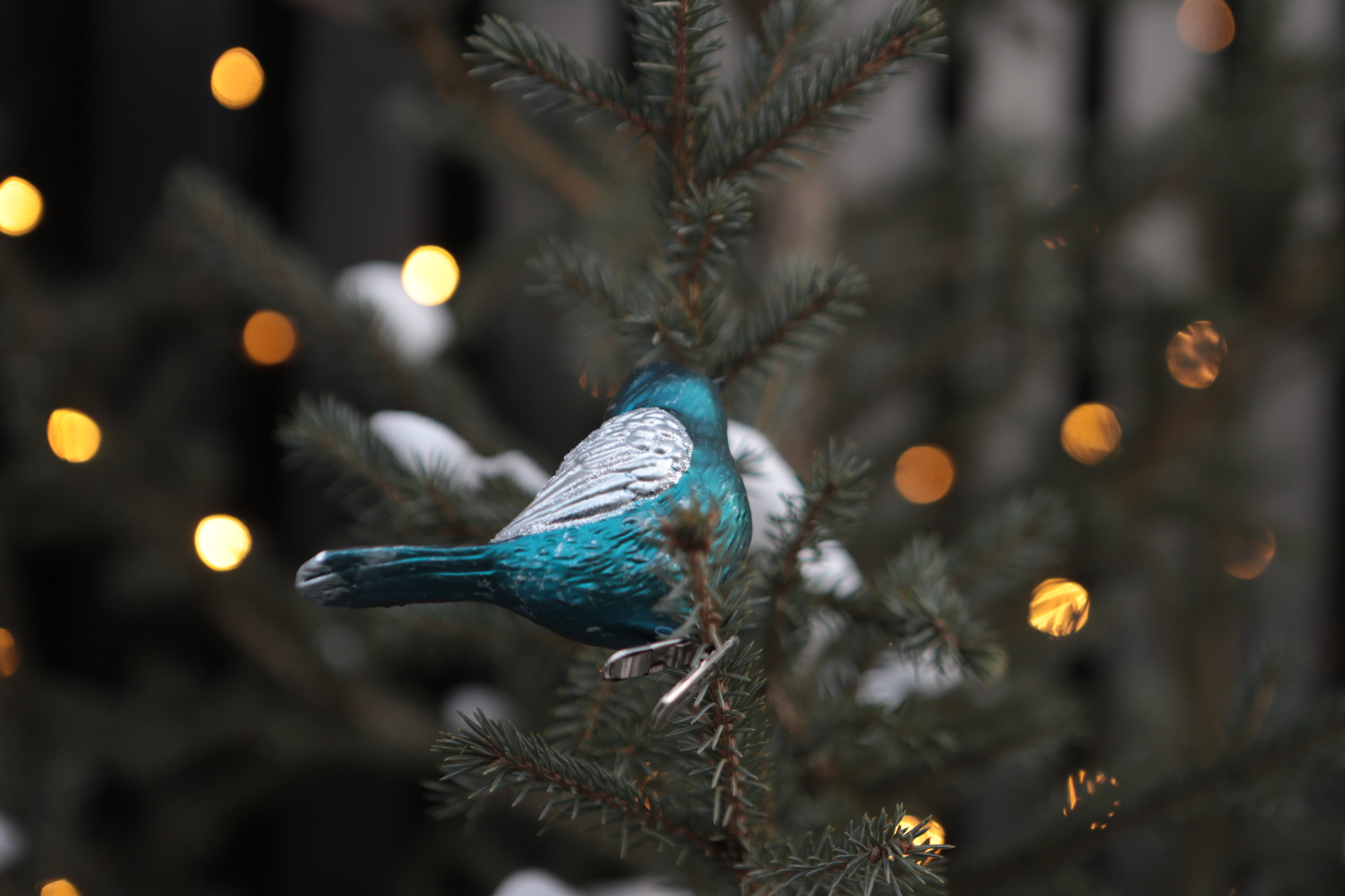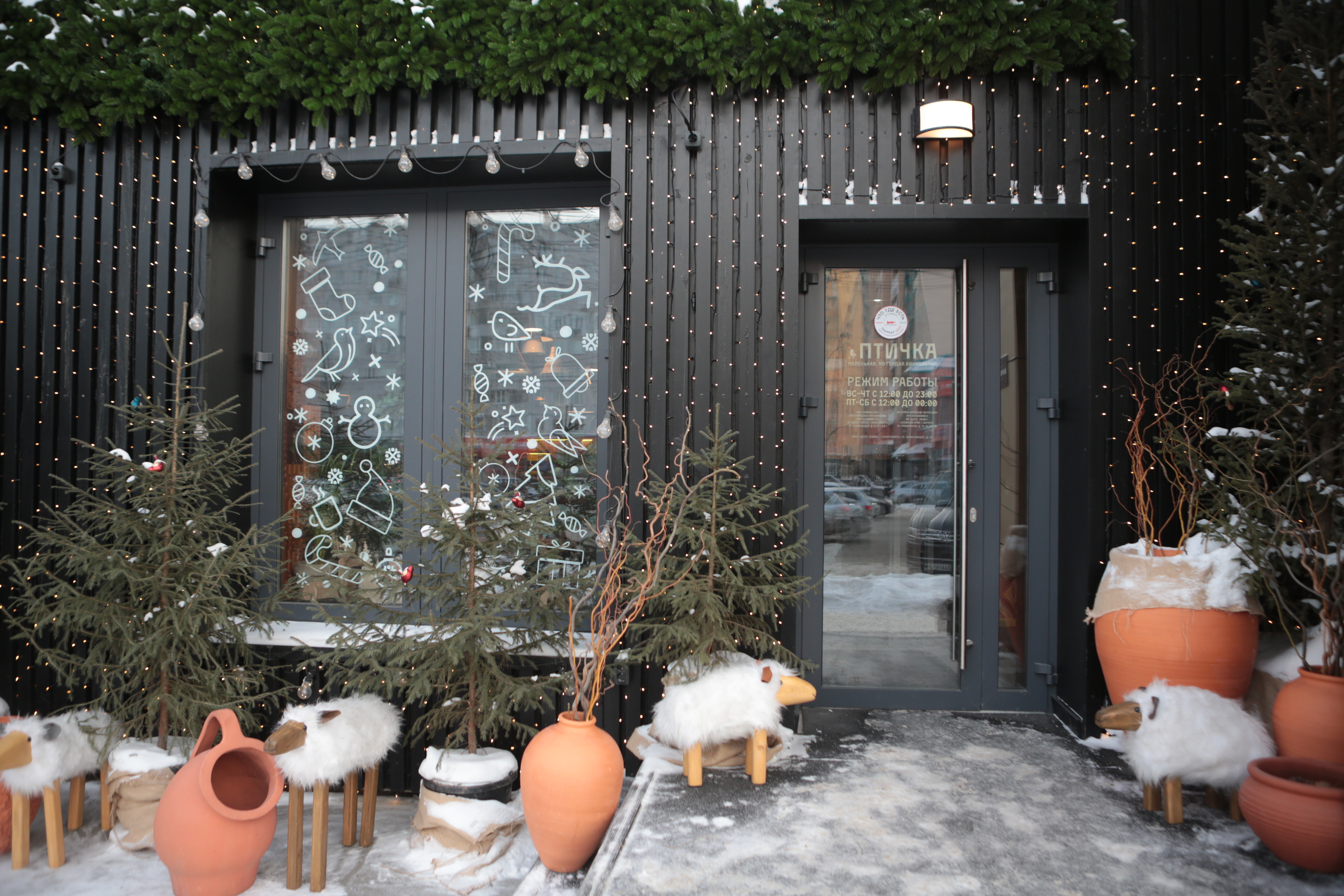 Забавные птички поселились на ёлках возле хинкальной, которая делит здание с Новосибирским цирком. Особенно красиво композиция выглядит вечером, когда включают крошечные фонарики.