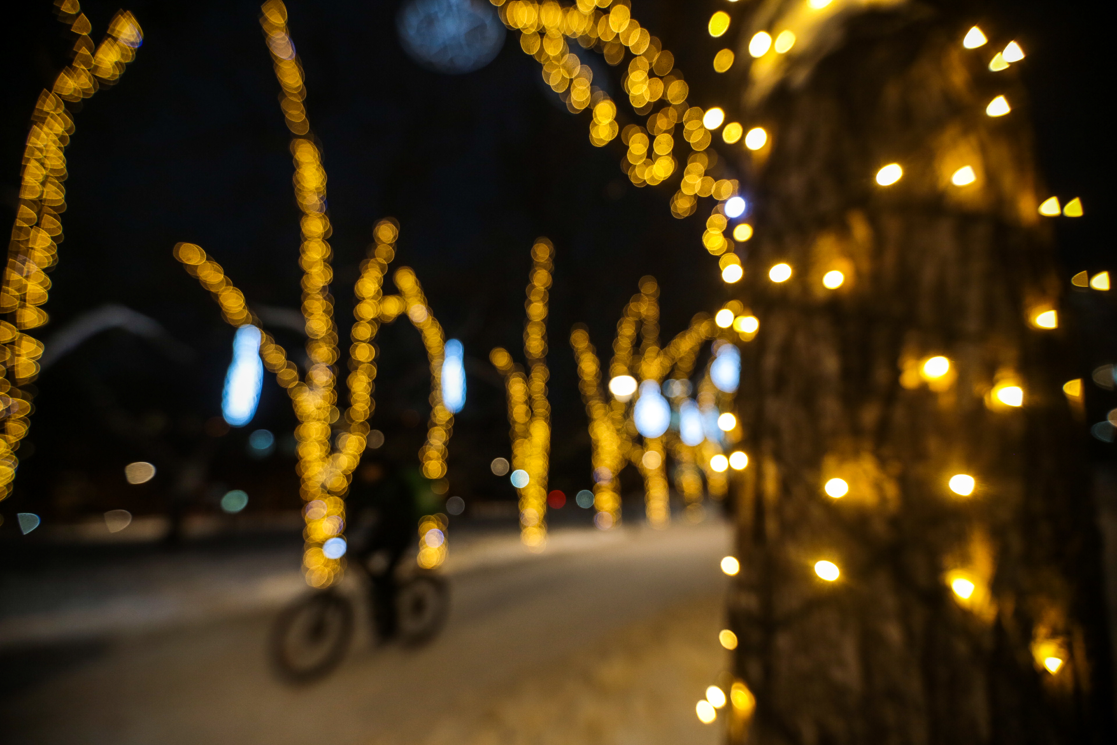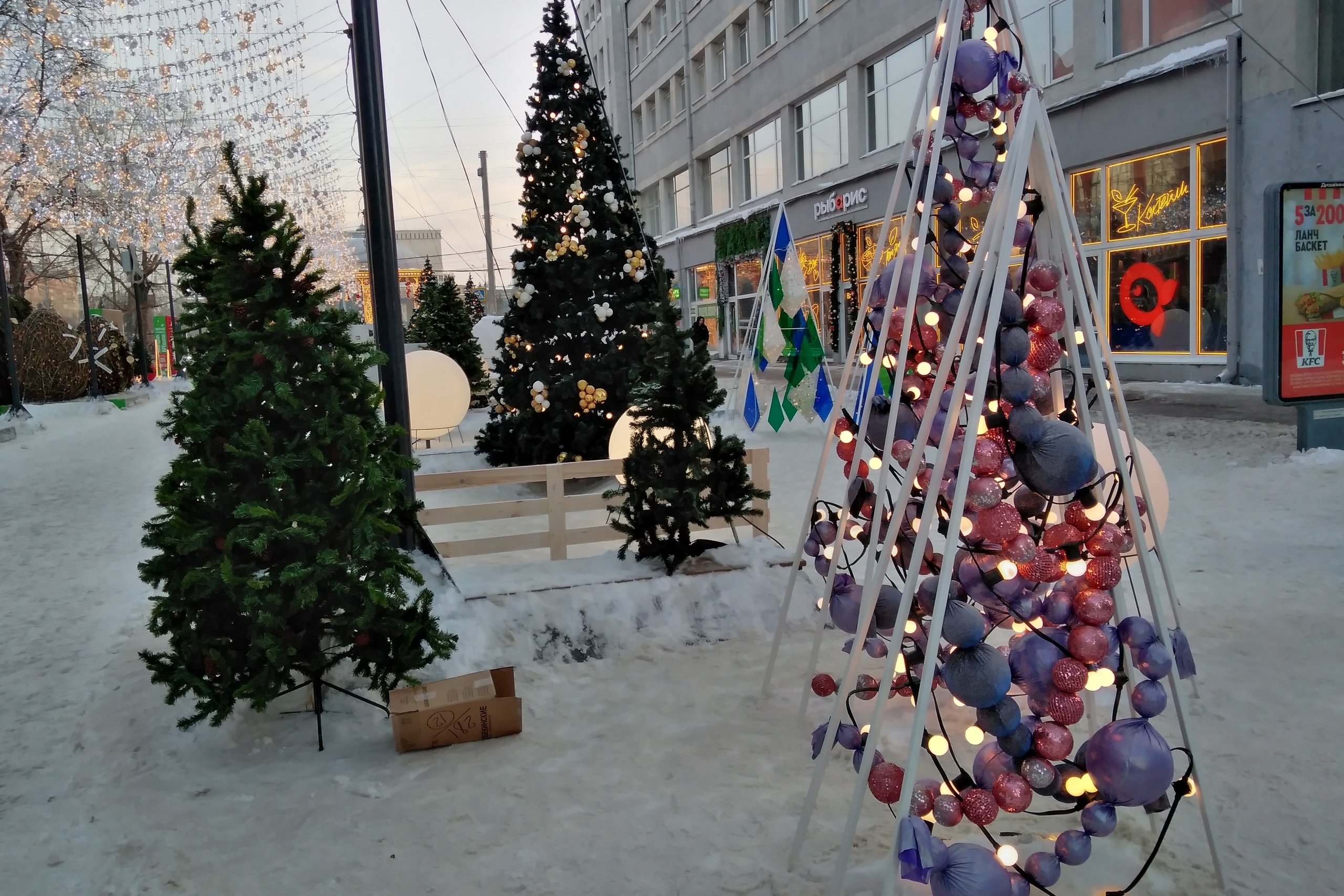 Также в нём можно заметить прошлогоднюю иллюминацию из Первомайского сквера: большие шестигранные снежинки и ёлочные игрушки.