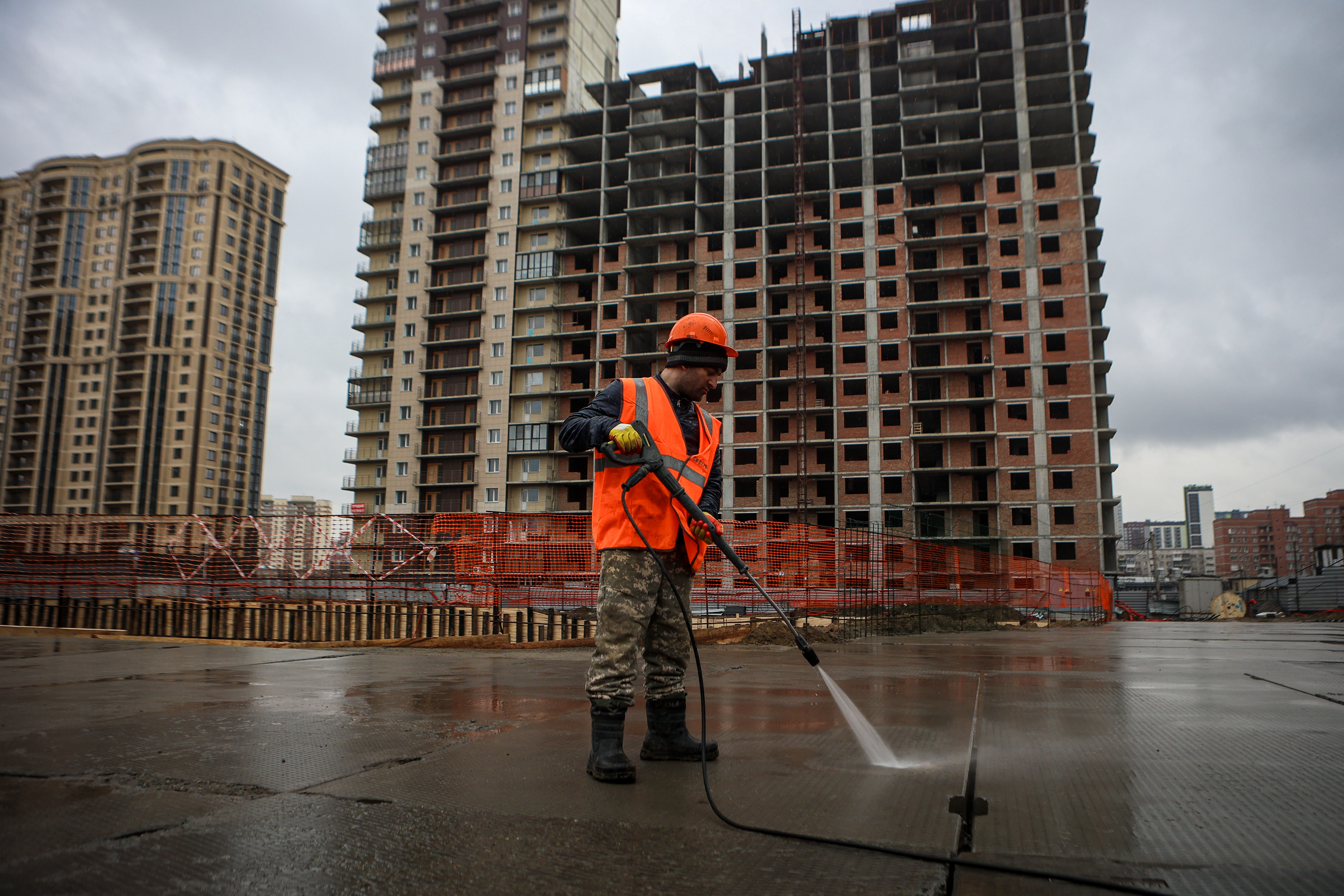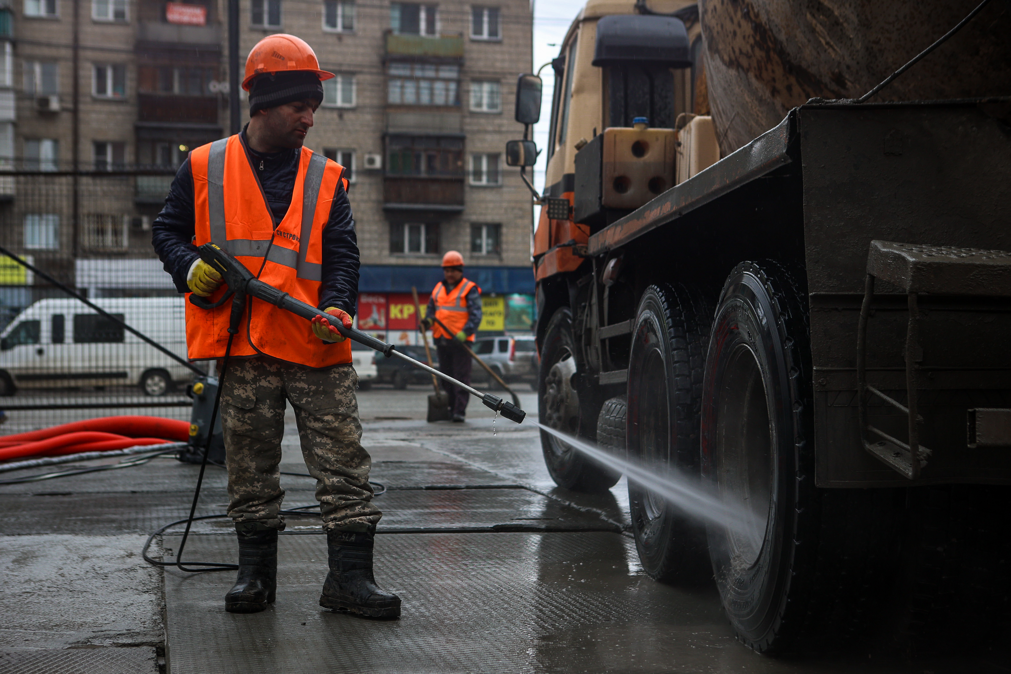 Специалисты осматривают машины, покидающие стройплощадку. У всех грузовиков должны быть чистые колёса, чтобы не разносить грязь по городским улицам. Для этого на выезде с участка нужен пункт для мытья.