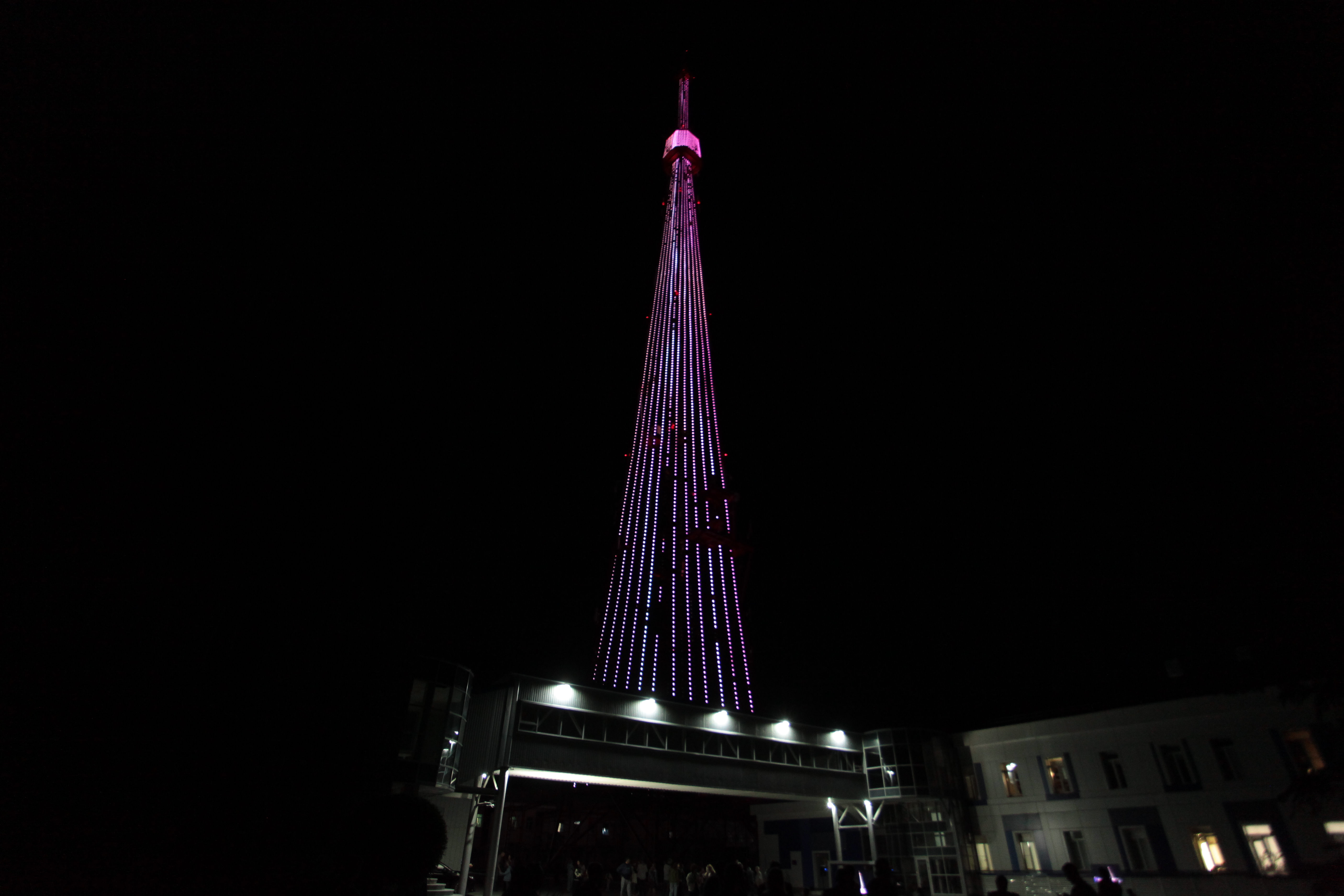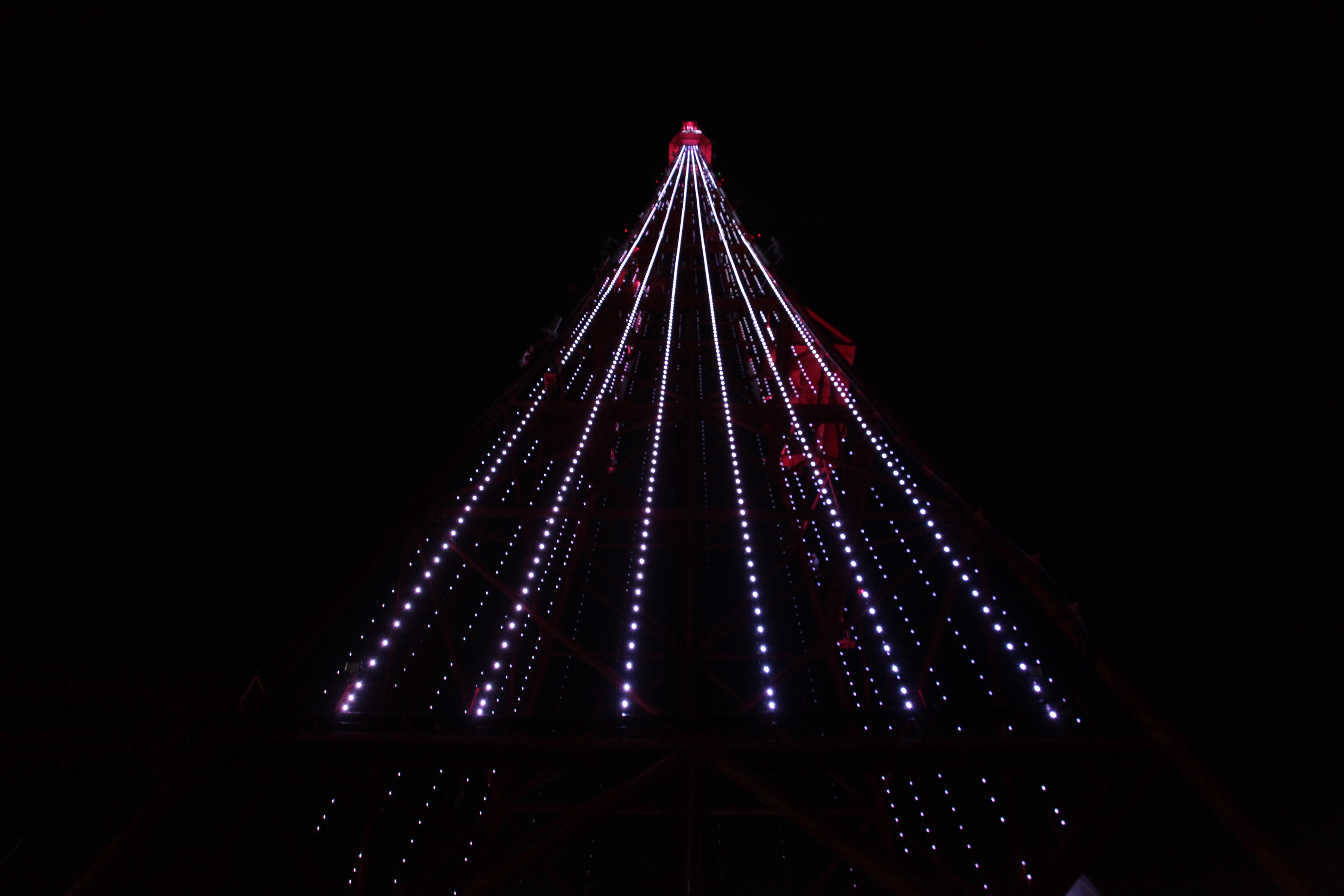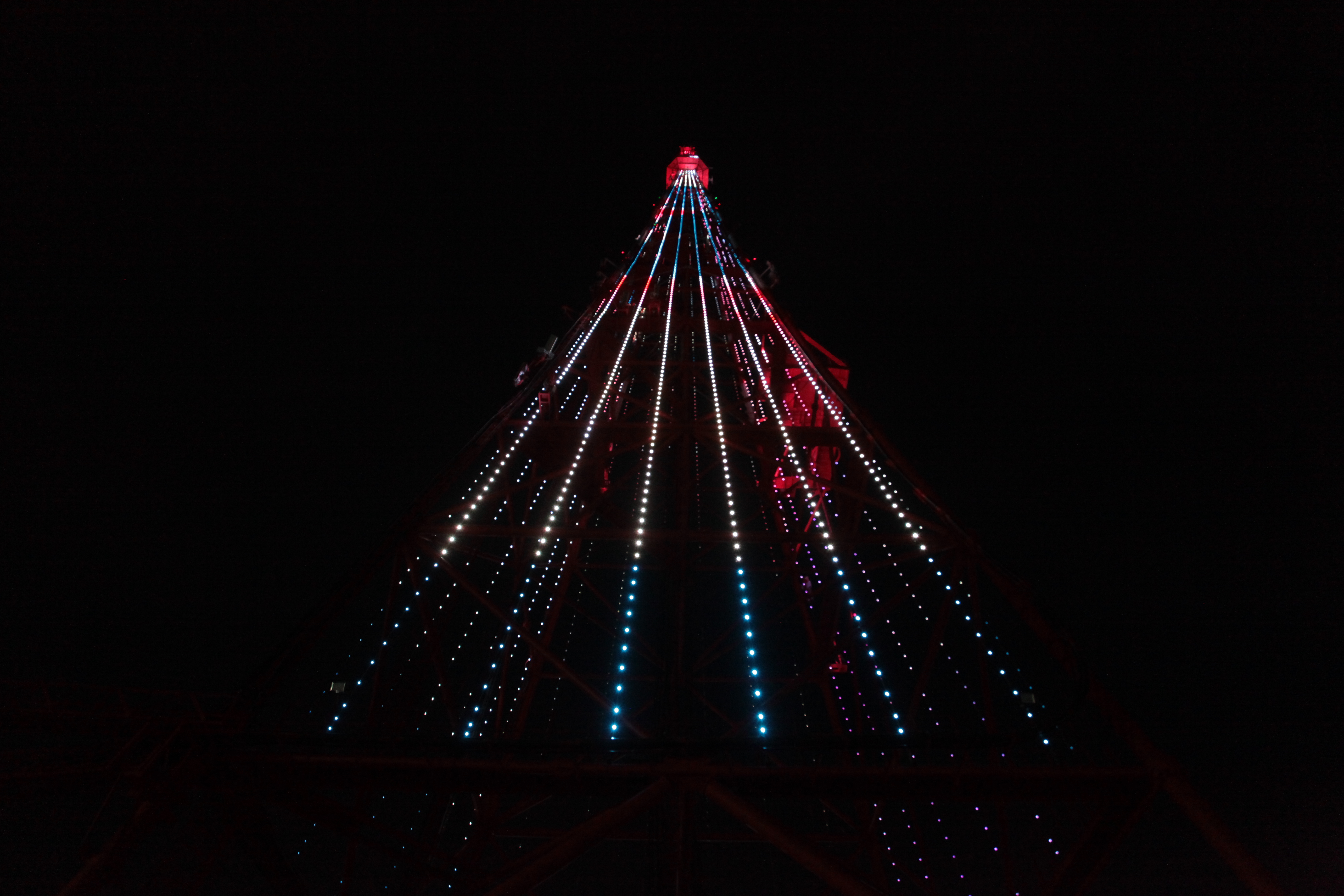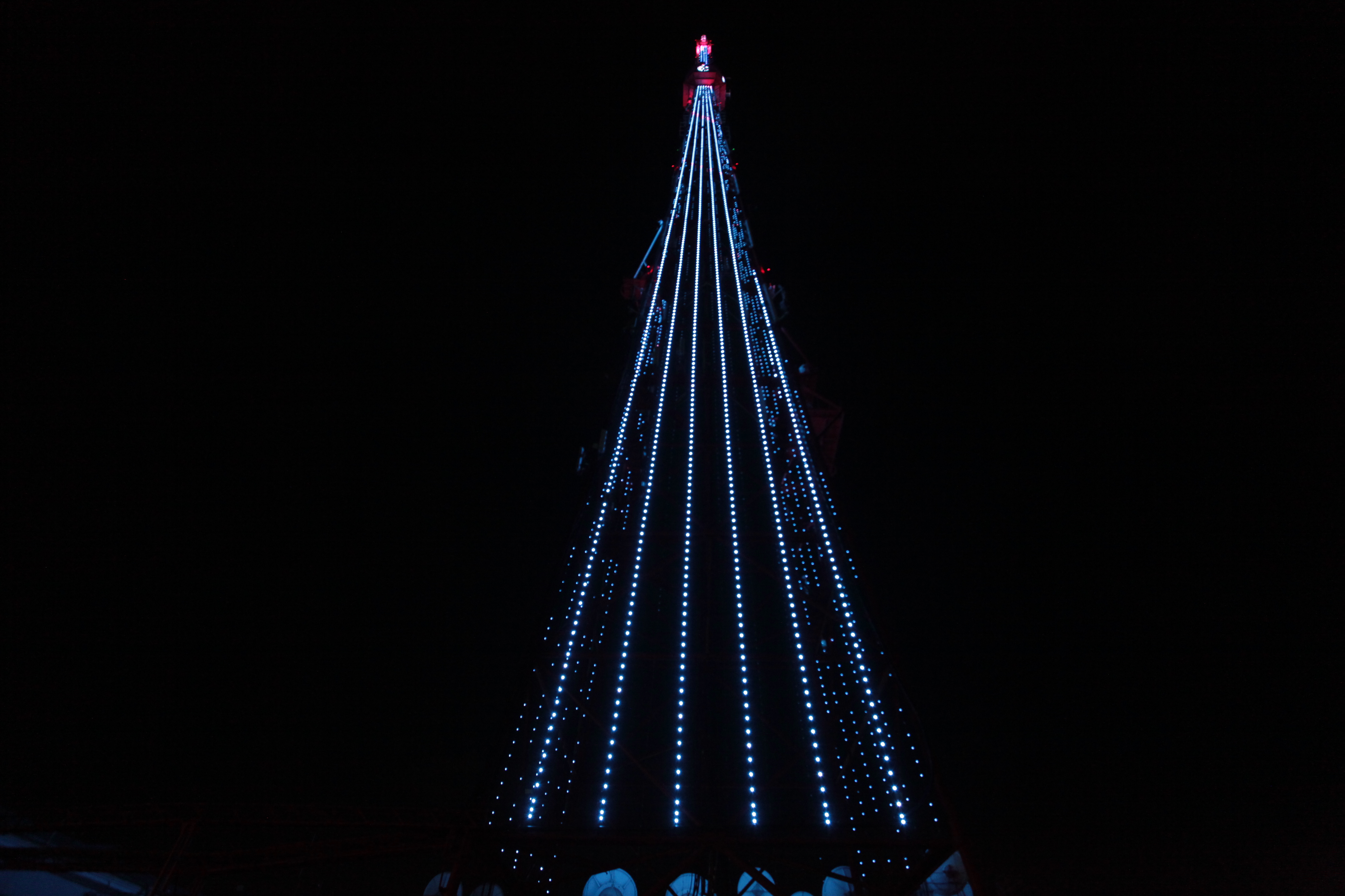 Ещё до начала монтажа филиал РТРС провёл большую подготовительную работу: в 2022 году башню покрасили, обследовали и рассчитали несущую способность. Этим летом с середины июля специалисты устанавливали новое оснащение. На 196-метровой вышке разместили 9060 светодиодных пиксельных светильников, шесть прожекторов и медиафасад на отметке от 140 до 148 метров. Расположенные на такой высоте надписи с экрана будут видны даже на большом расстоянии.