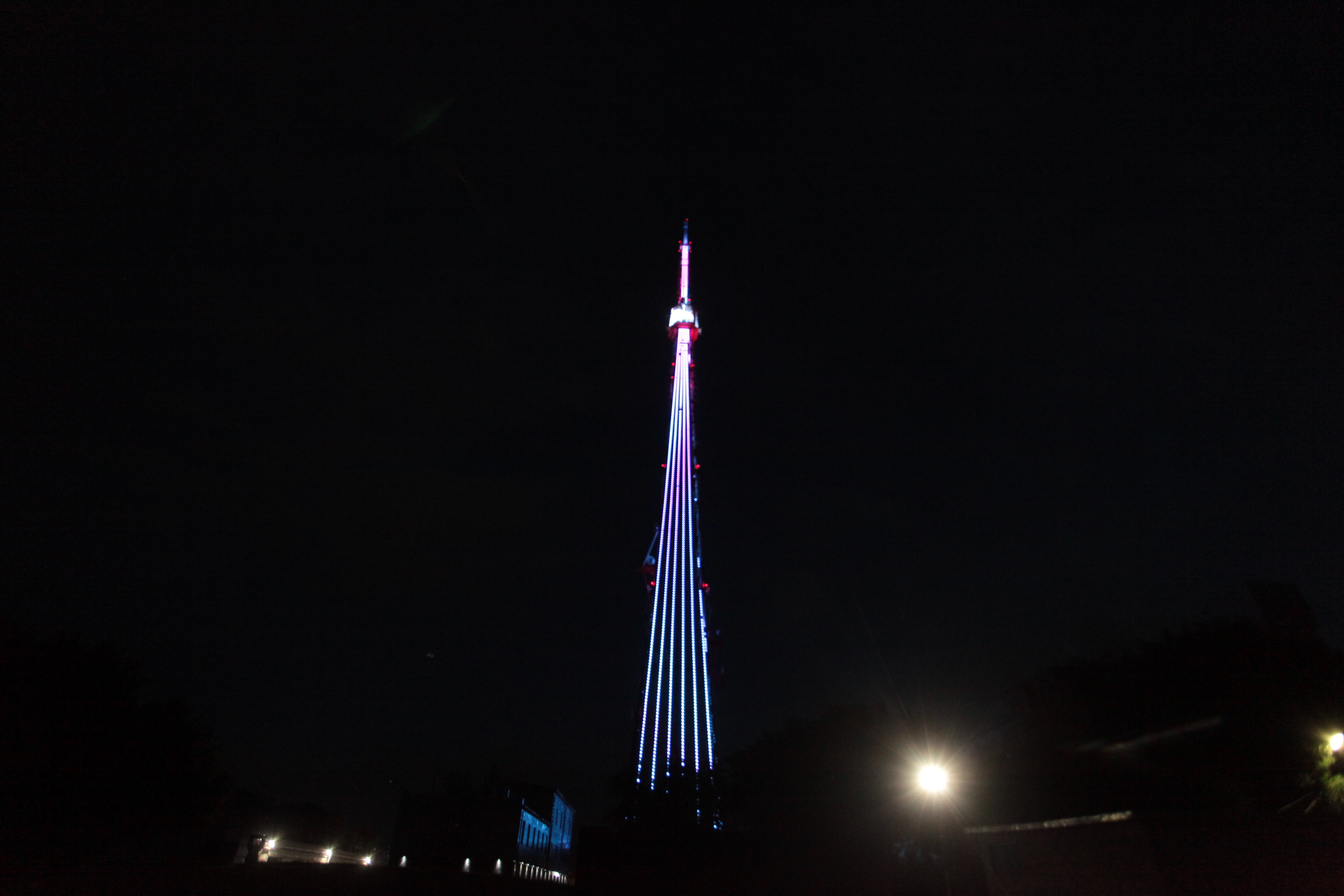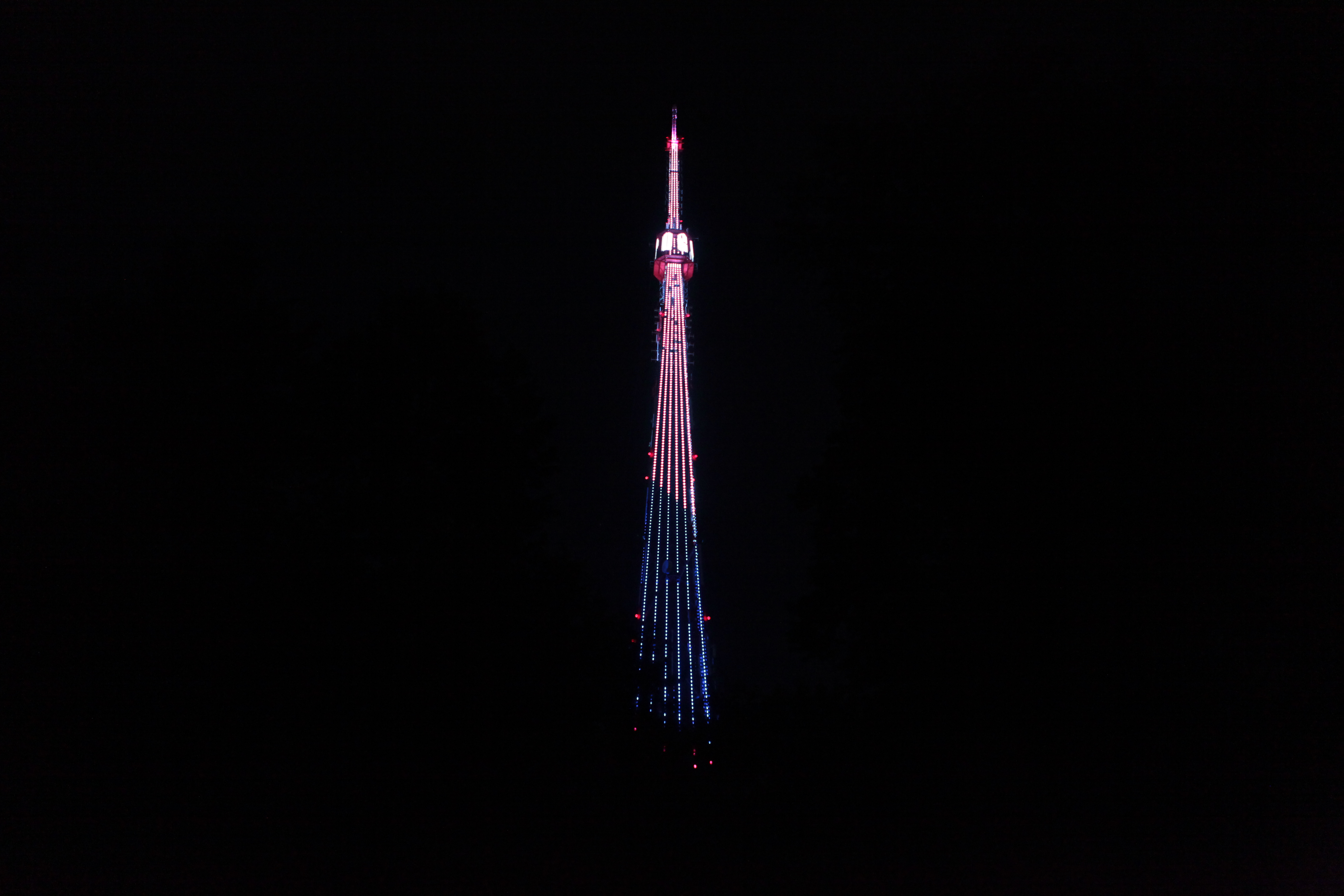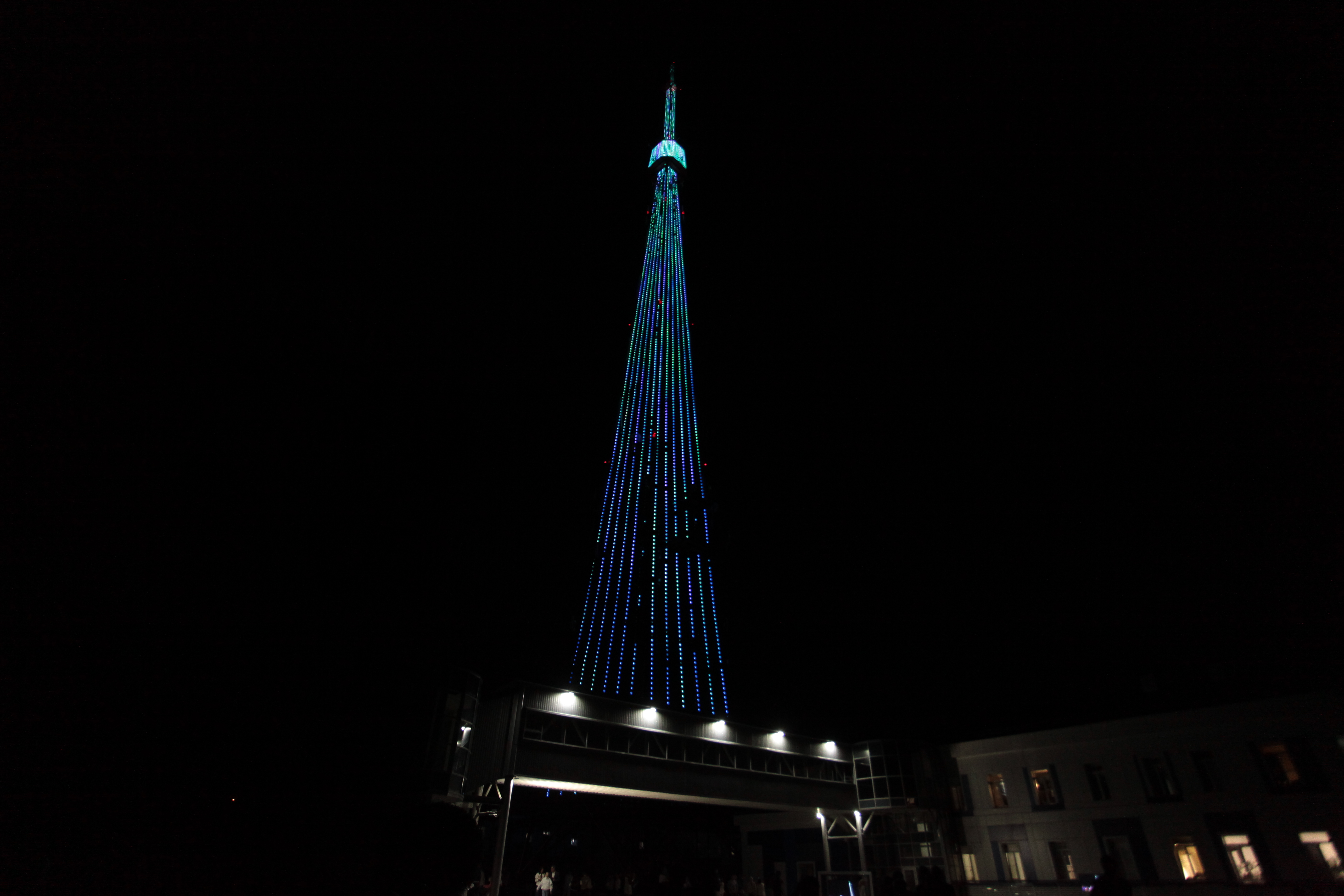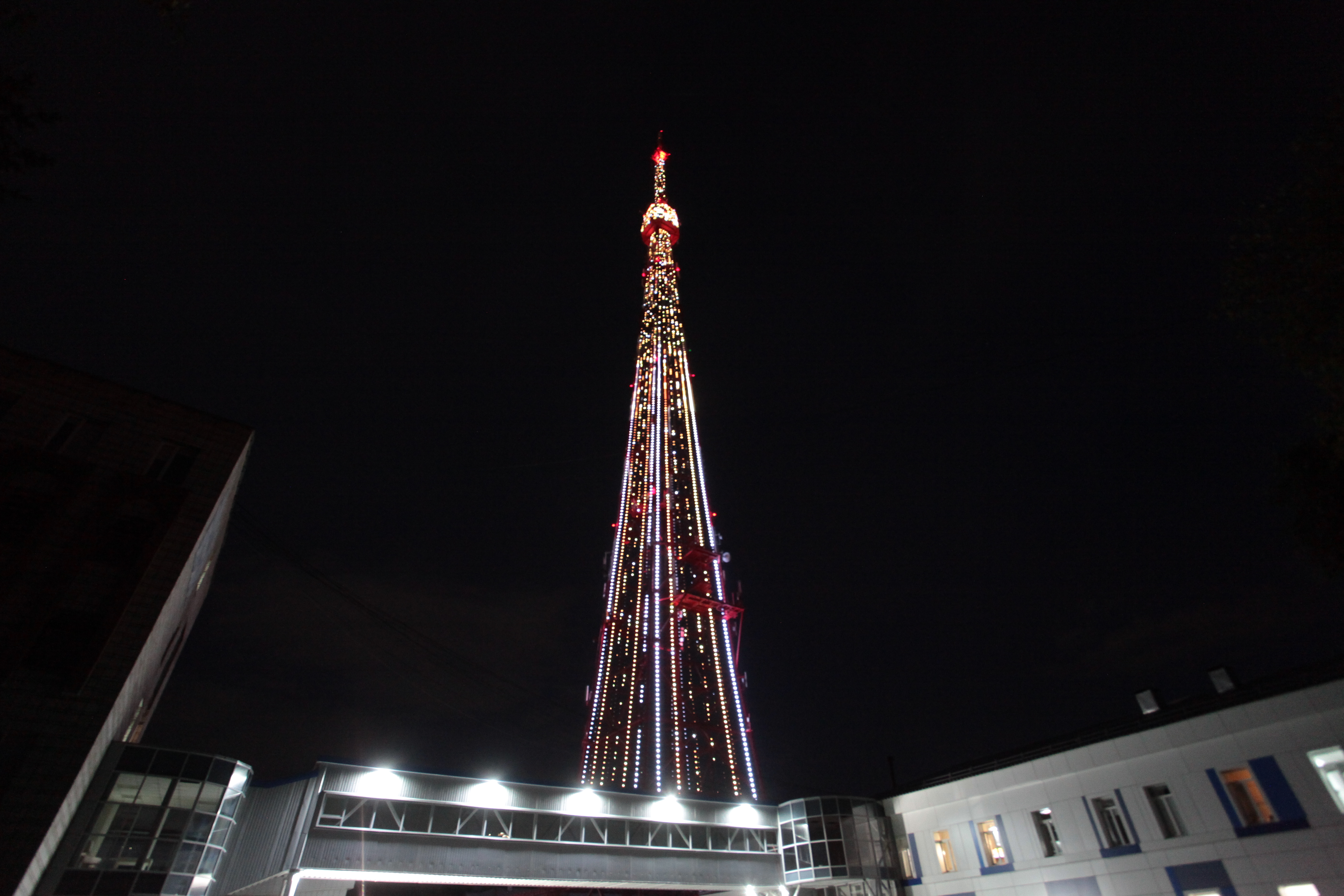 Ещё до начала монтажа филиал РТРС провёл большую подготовительную работу: в 2022 году башню покрасили, обследовали и рассчитали несущую способность. Этим летом с середины июля специалисты устанавливали новое оснащение. На 196-метровой вышке разместили 9060 светодиодных пиксельных светильников, шесть прожекторов и медиафасад на отметке от 140 до 148 метров. Расположенные на такой высоте надписи с экрана будут видны даже на большом расстоянии.