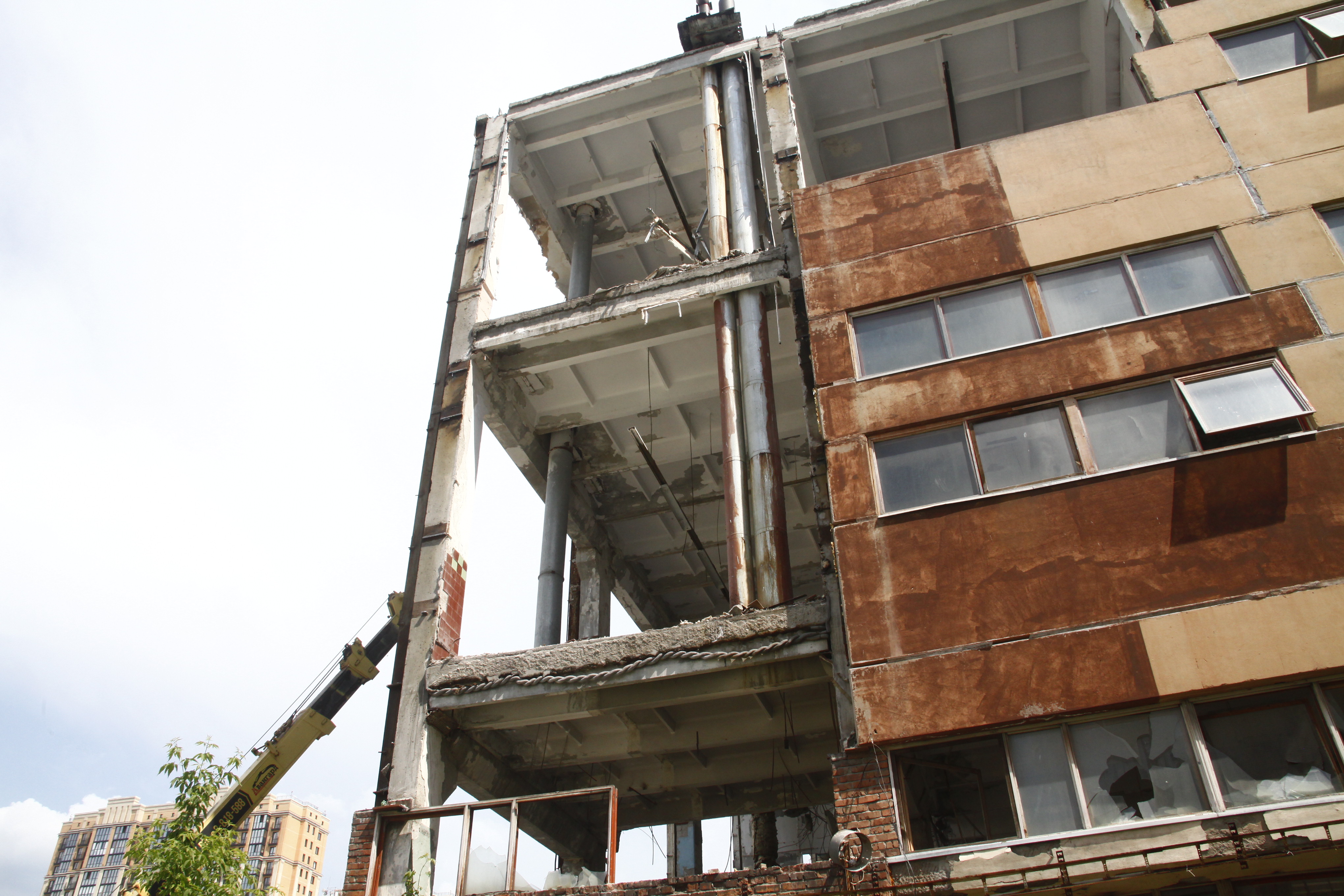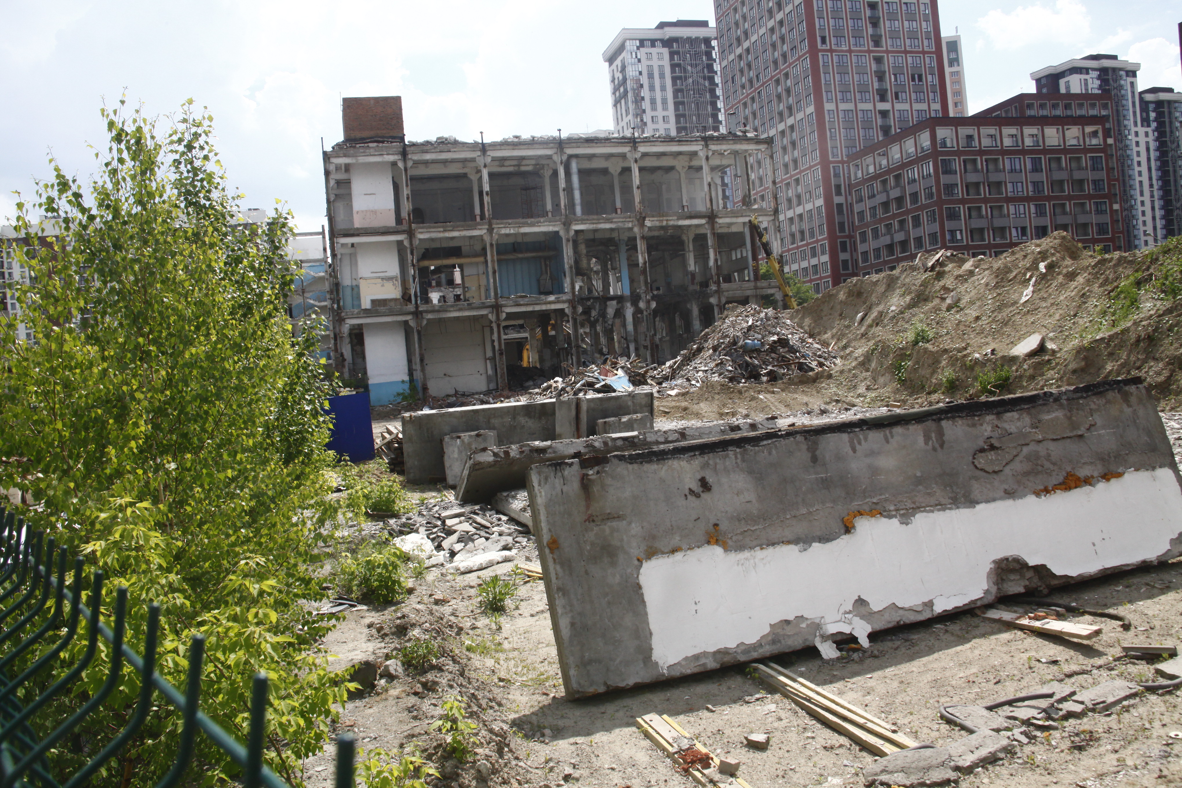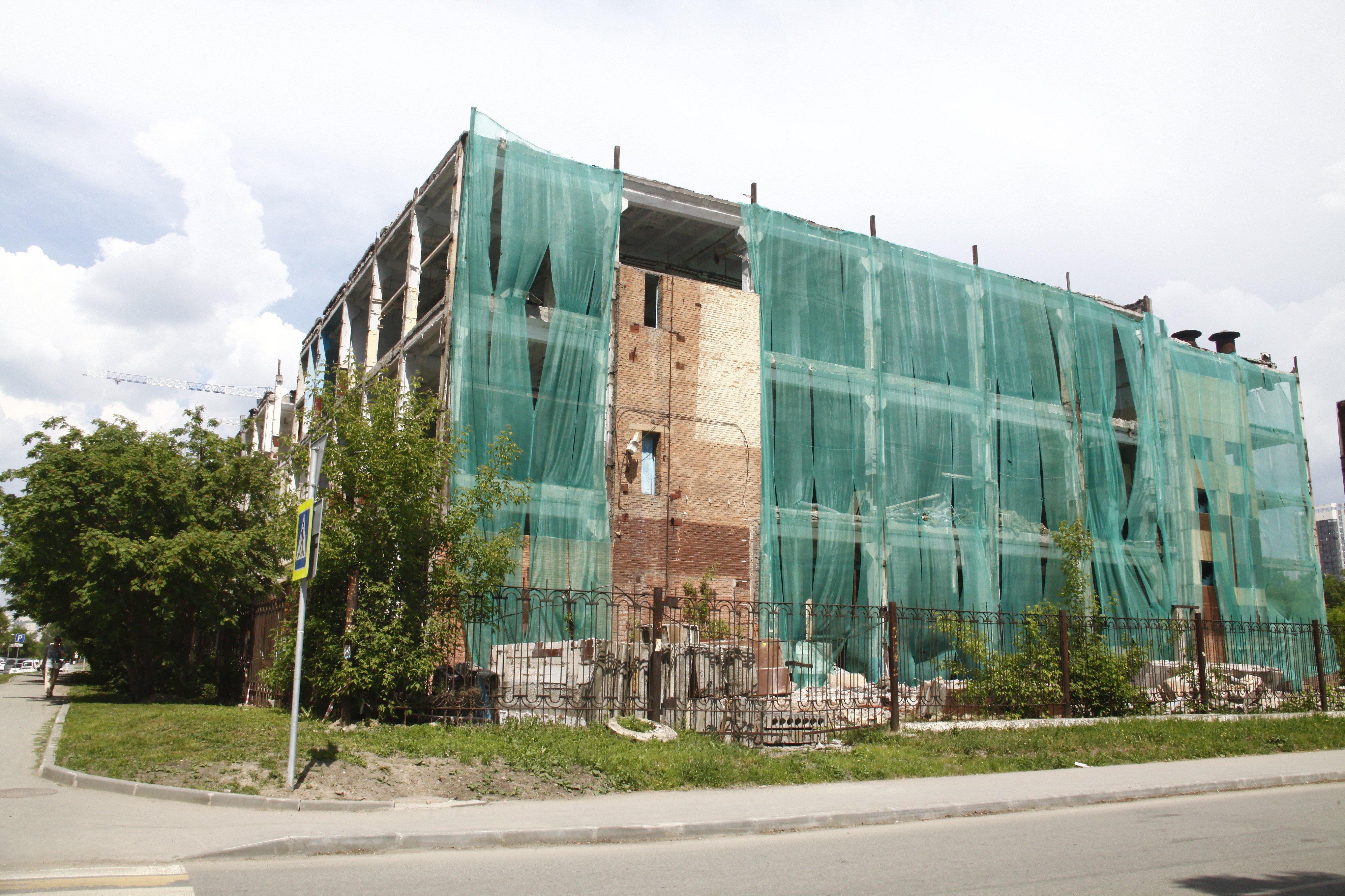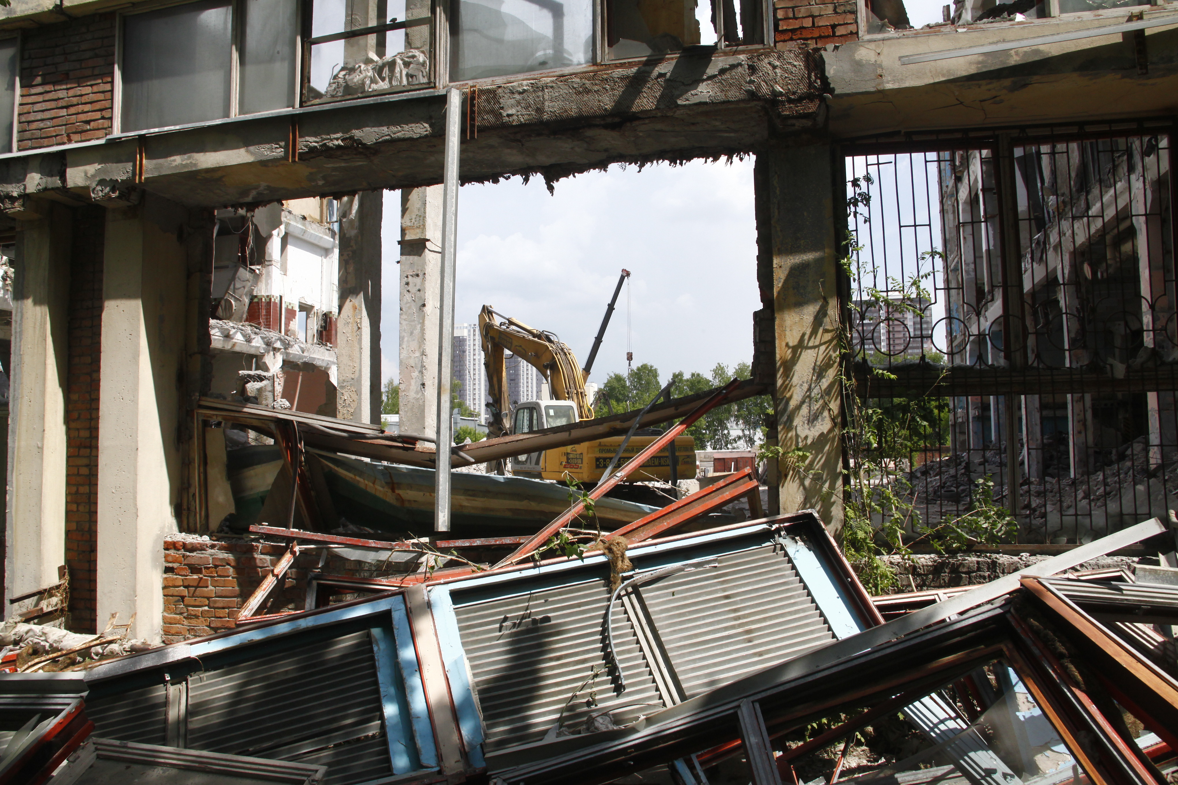 В центре Новосибирска завершается снос пятиэтажного корпуса жиркомбината. Пустовавшее несколько лет здание разбирают с помощью спецтехники с начала мая.