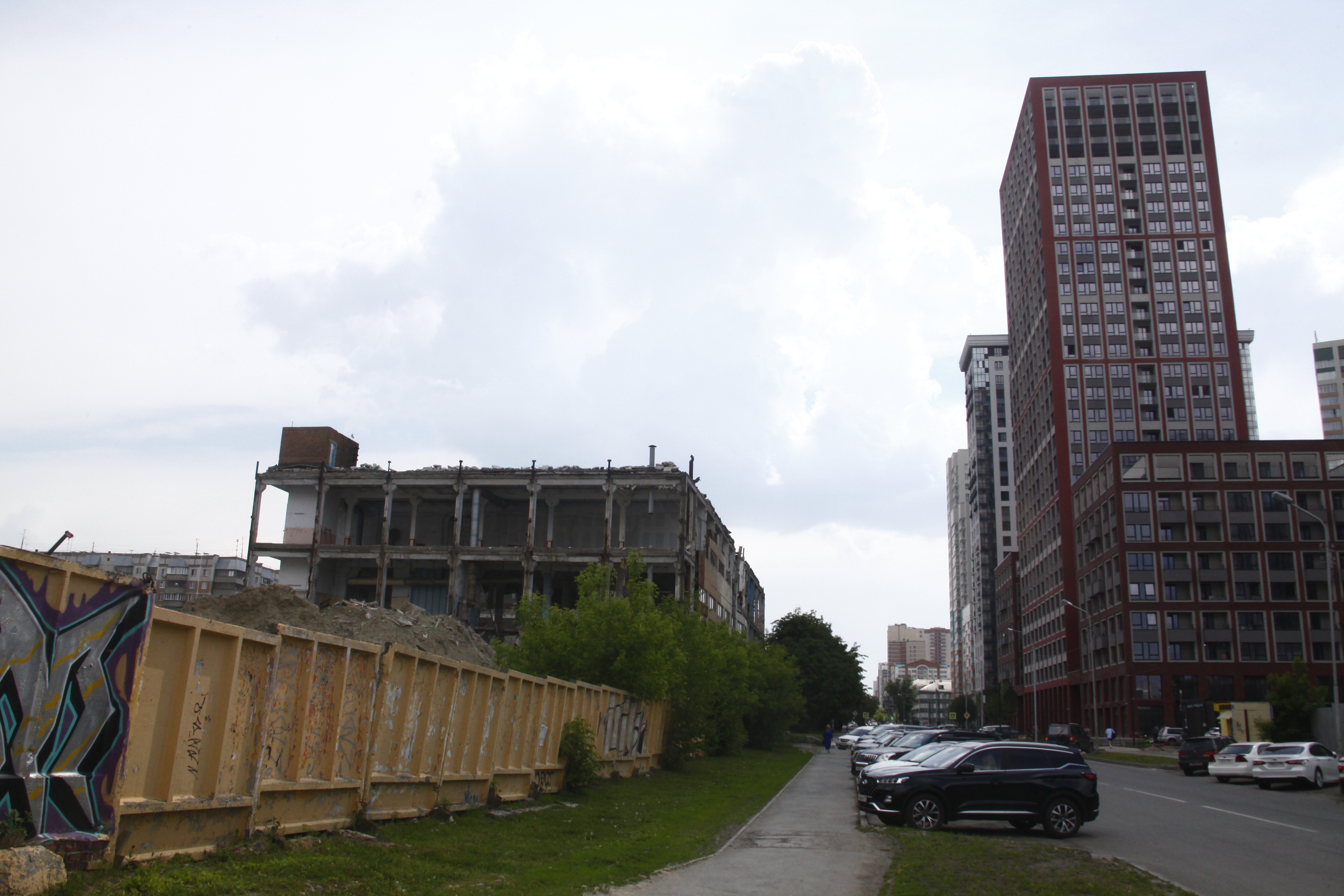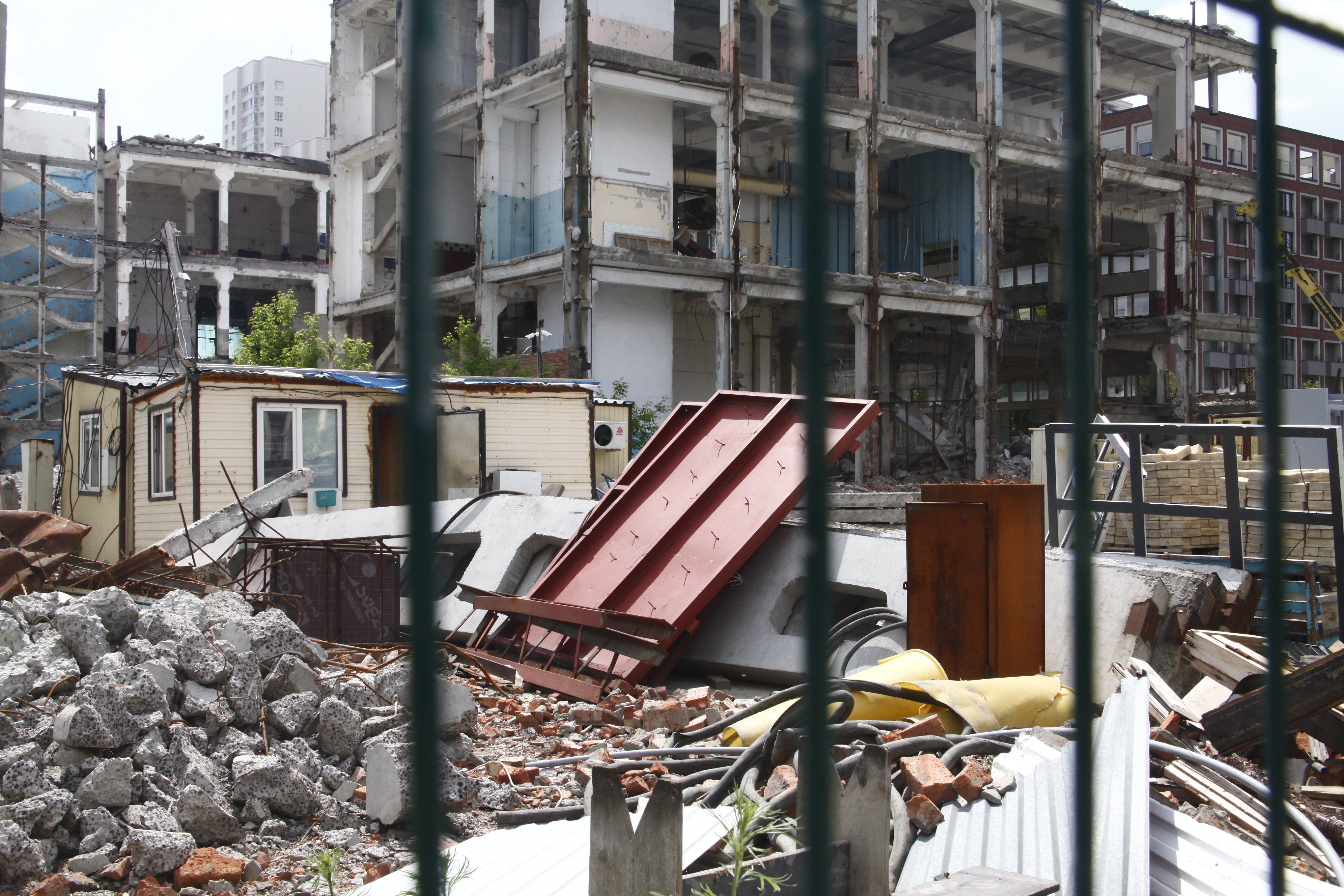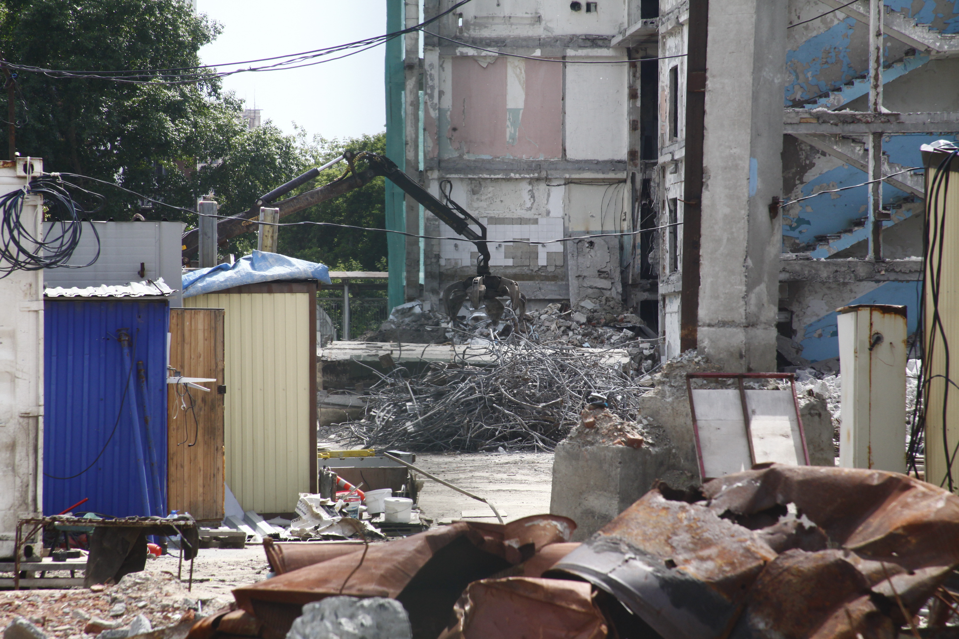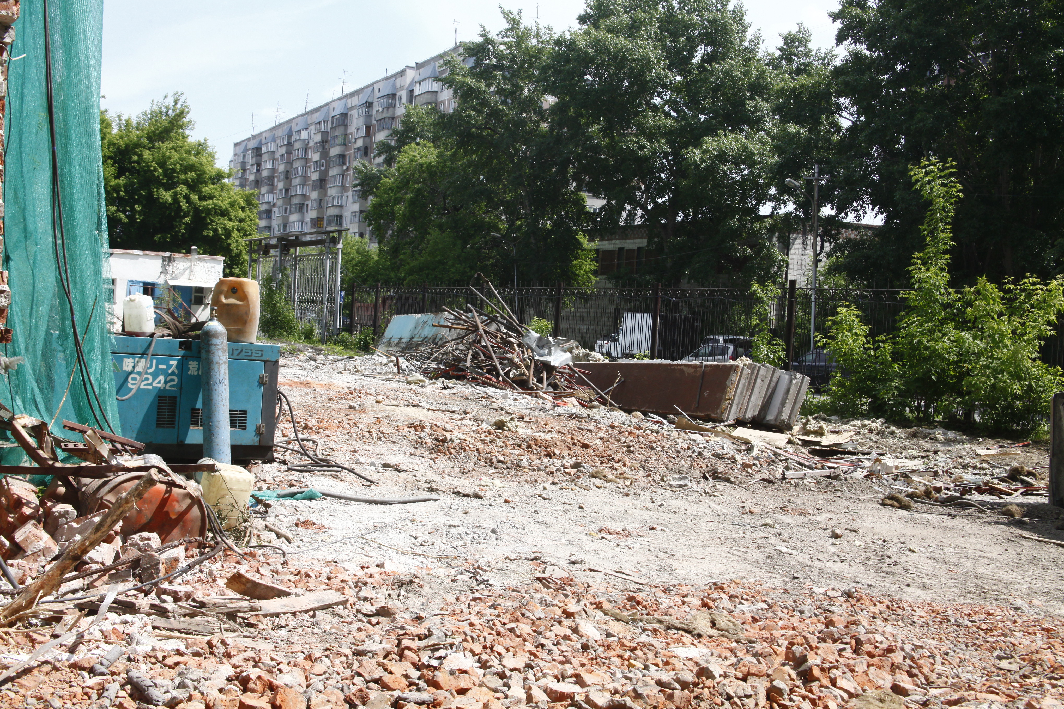 В центре Новосибирска завершается снос пятиэтажного корпуса жиркомбината. Пустовавшее несколько лет здание разбирают с помощью спецтехники с начала мая.