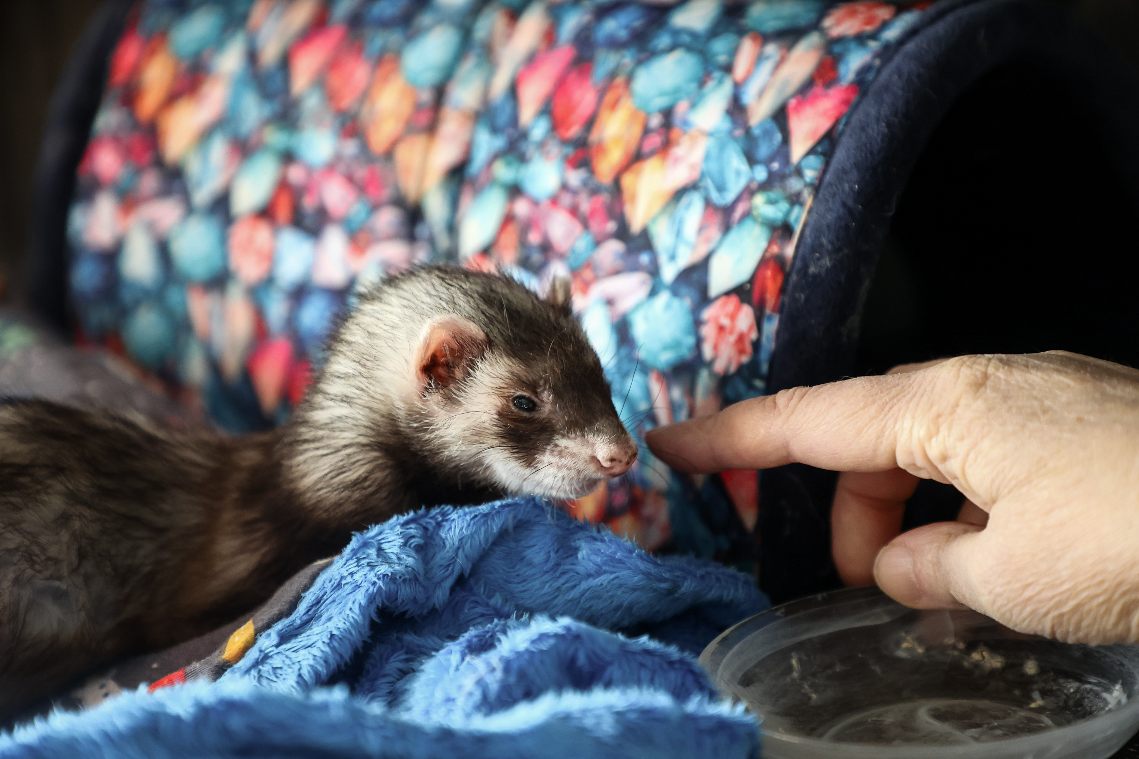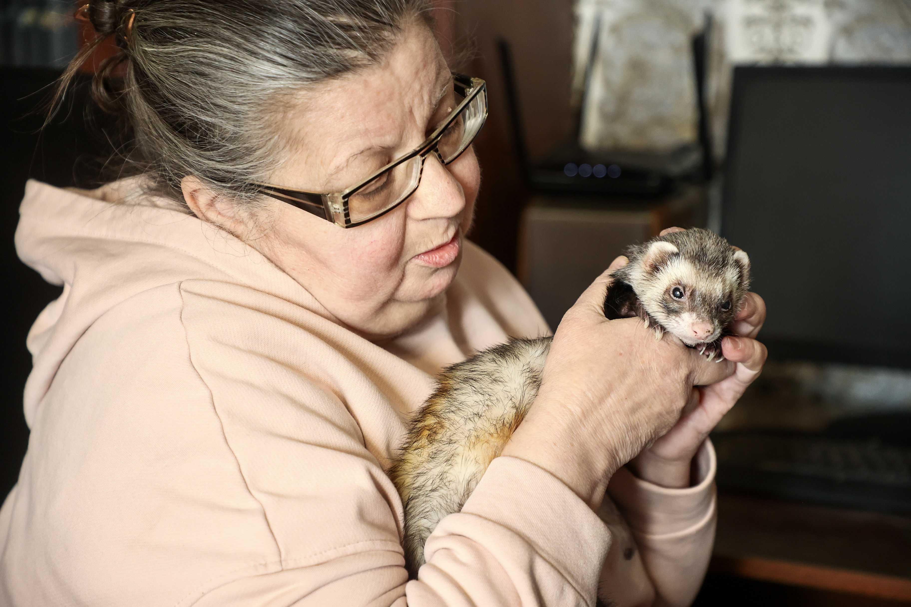 «Они ласковые, хорошие, но очень сложные в содержании. Пища хорька должна состоять из высокого количества животного протеина: это мыши и крысы. Тишу я так кормлю два раза в день: две крыски — утром, пара мышек — вечером», — рассказывет хозяйка хорьков Елена-Эльга Журавлёва.