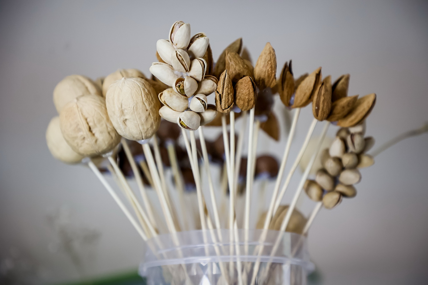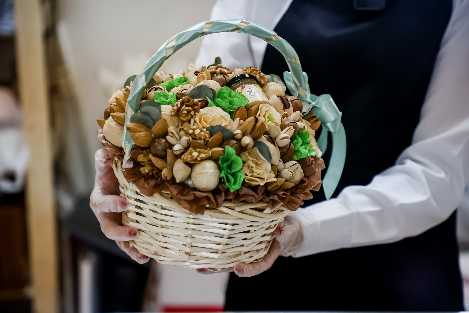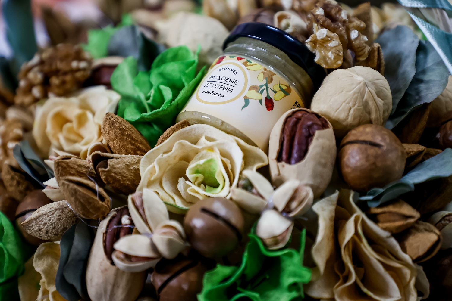 «Ореховые букеты — самые кропотливые и дорогие. Каждый орех нужно приклеить, но получается красота», — описывает кондитер творческий процесс.