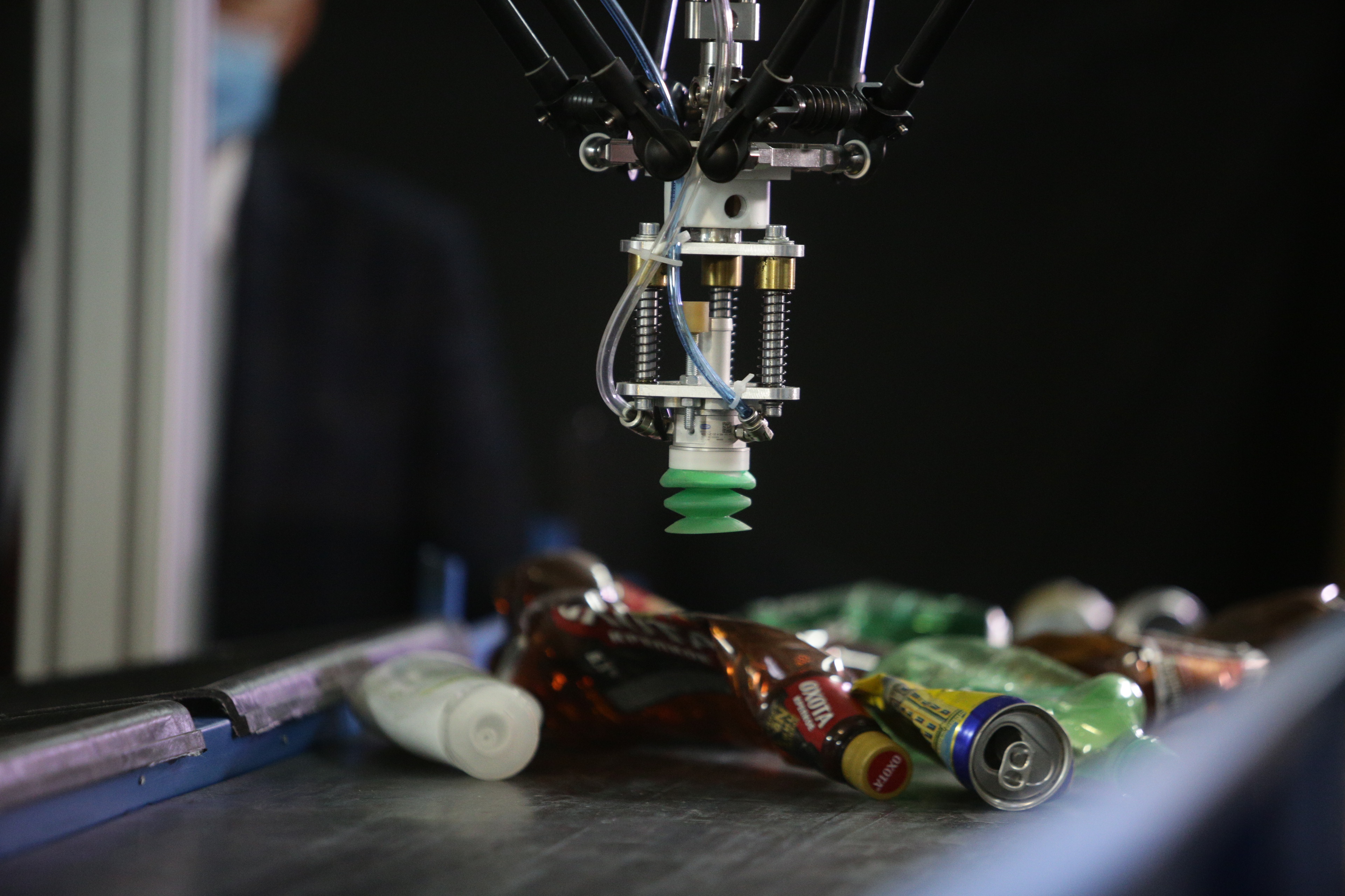 Эту линию создали в институте теплофизики. Сначала разработали нейросеть — компьютерную программу, способную самостоятельно «обучаться». Нейросети показали 60 000 фотографий — банки и бутылки, смятые по-разному, сделанные из пластика и металла. Сейчас она умеет распознавать три вида упаковки — две разновидности полиэтилена и алюминий. «Видит» их через камеру и направляет присоску робота.