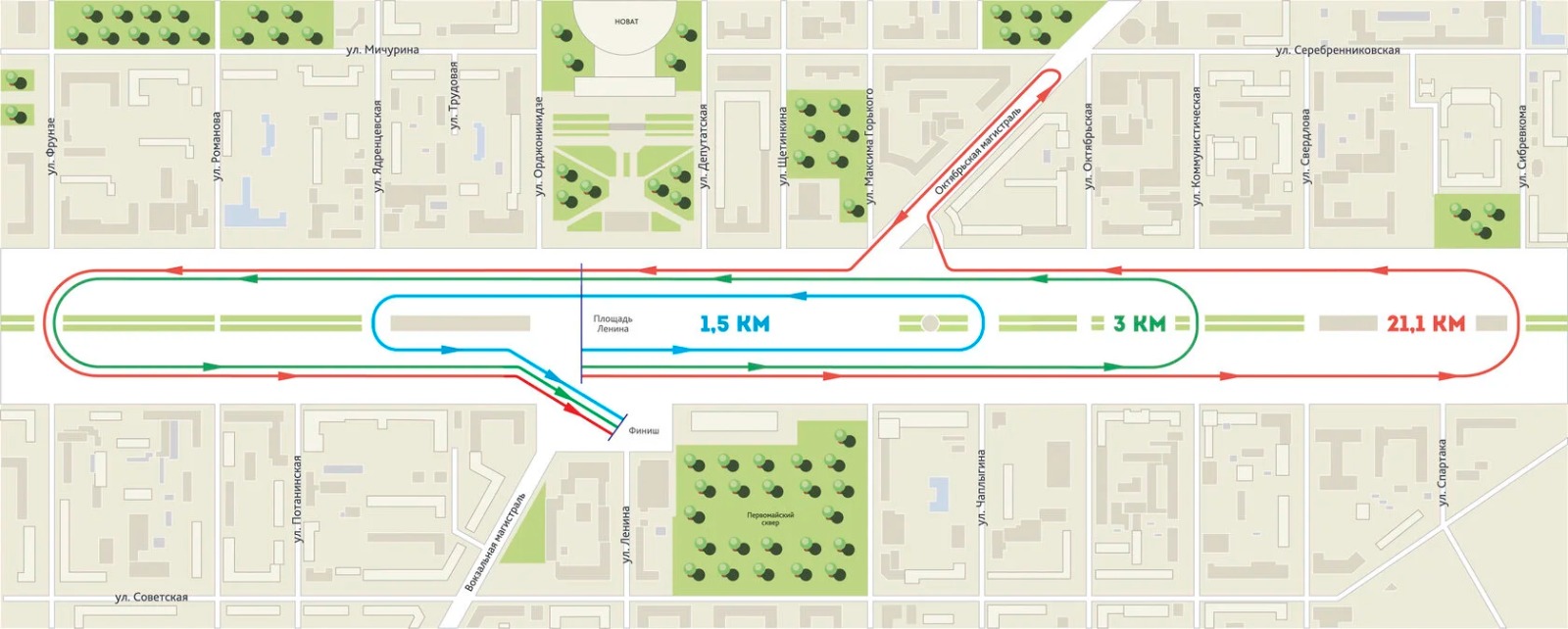 Классическая дистанция полумарафона — 21,1 километра. Конечно, такой протяжённостью Красный проспект не располагает, хоть и считается самой длинной прямой улицей в мире. Полумарафонцам предстоит пробежать пять кругов по 4,2 километра (красные линии на схеме).