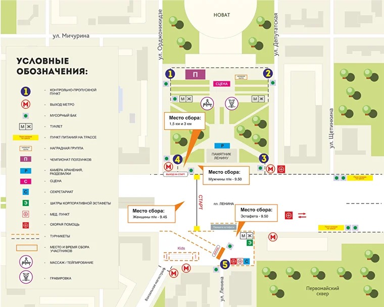Также, если вы решили бежать, заранее ознакомьтесь со схемой стартово-финишного городка на площади Ленина. Так будет проще сориентироваться в день фестиваля.