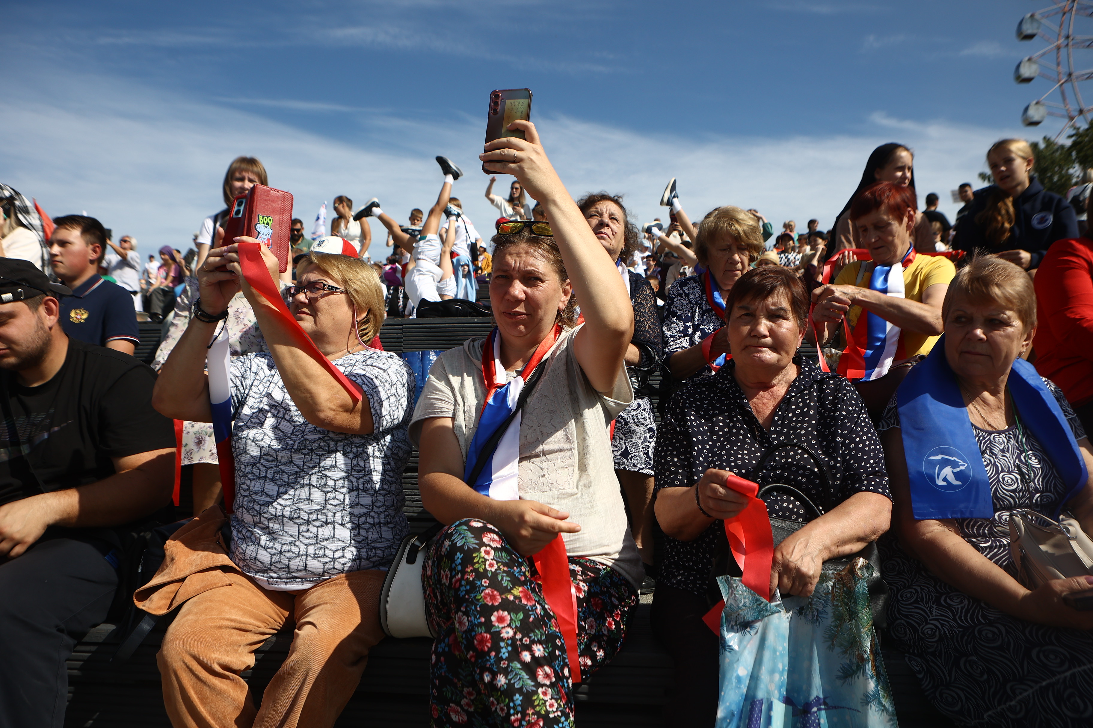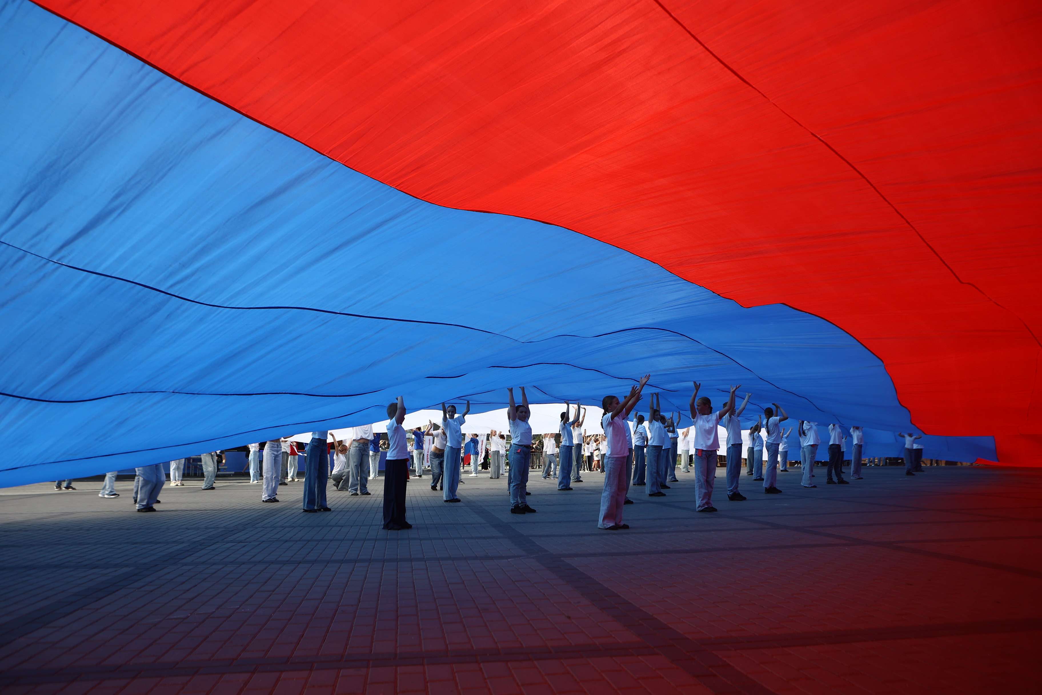 Для зрителей подготовили патриотический концерт и театрализованное представление. А в финале развернули огромный триколор.