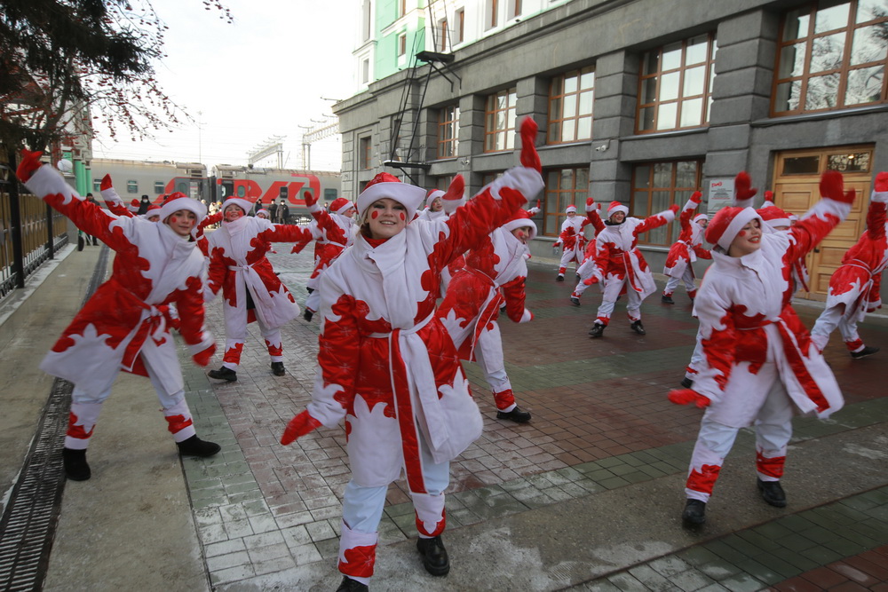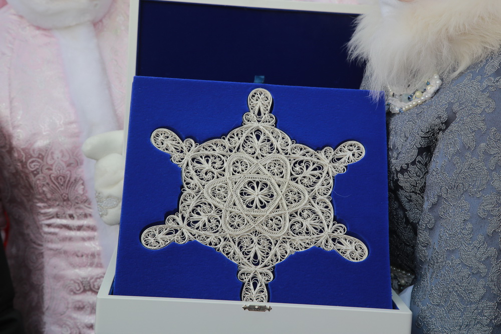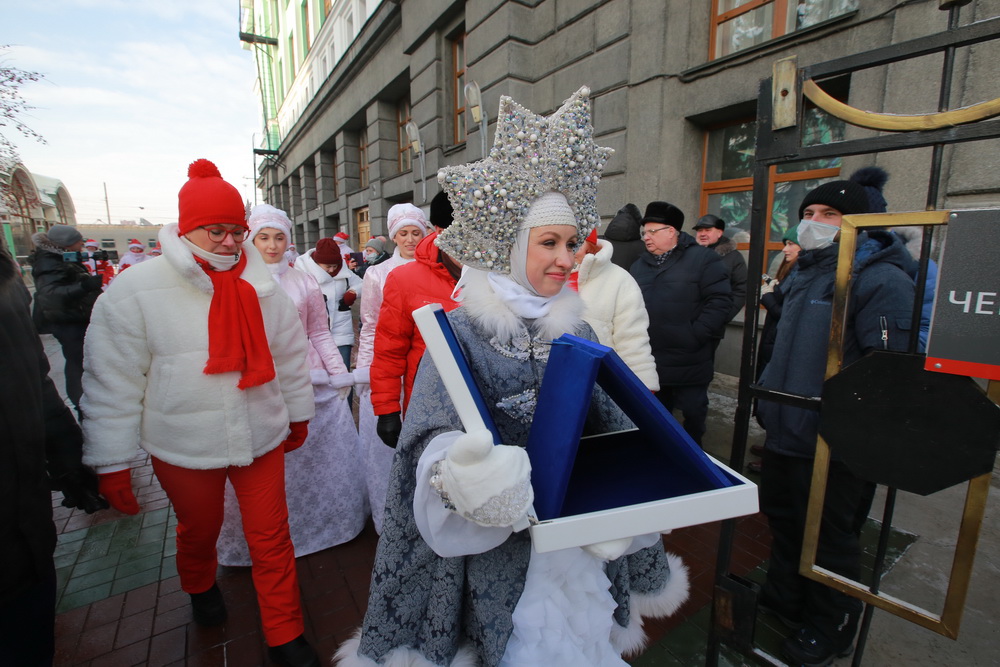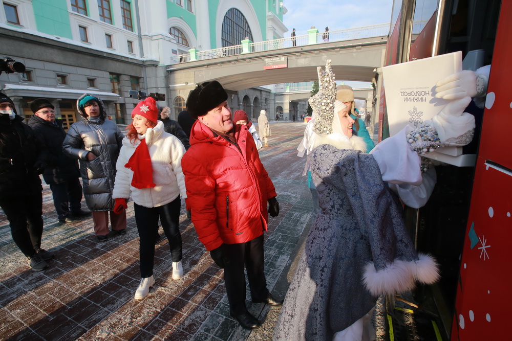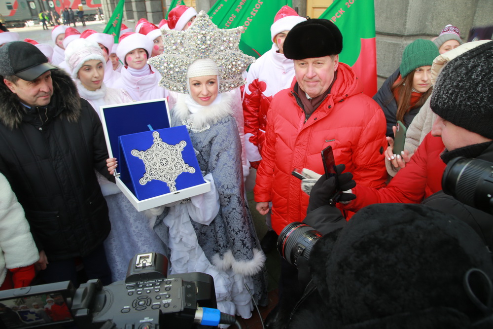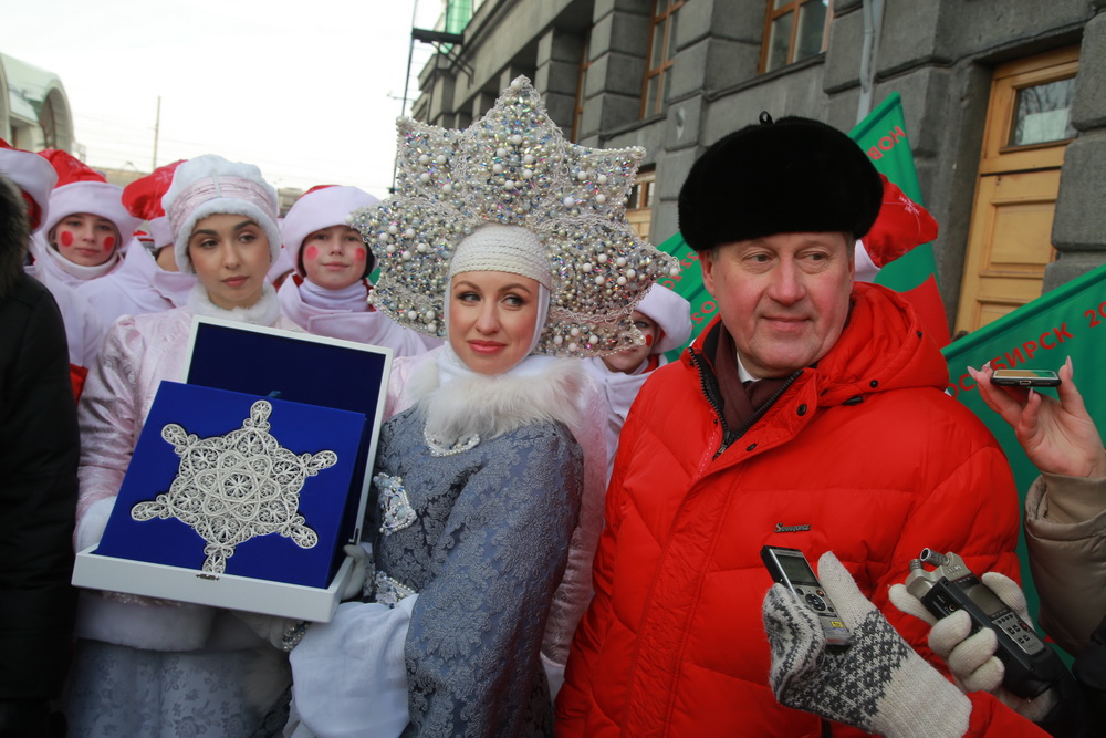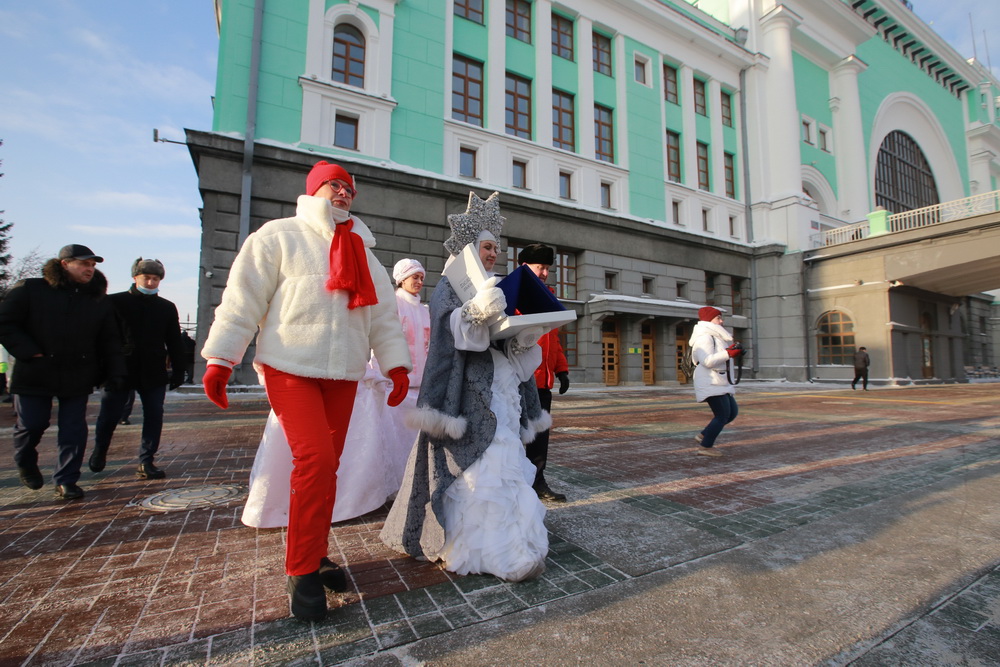 Утром на вокзале как почетного гостя встретили Новосибирочку. Она хранительница снежинки — главного символа новогодней столицы России. Фигурка, изготовленная нижегородскими мастерами в технике казаковской филиграни, навсегда останется в Новосибирске.