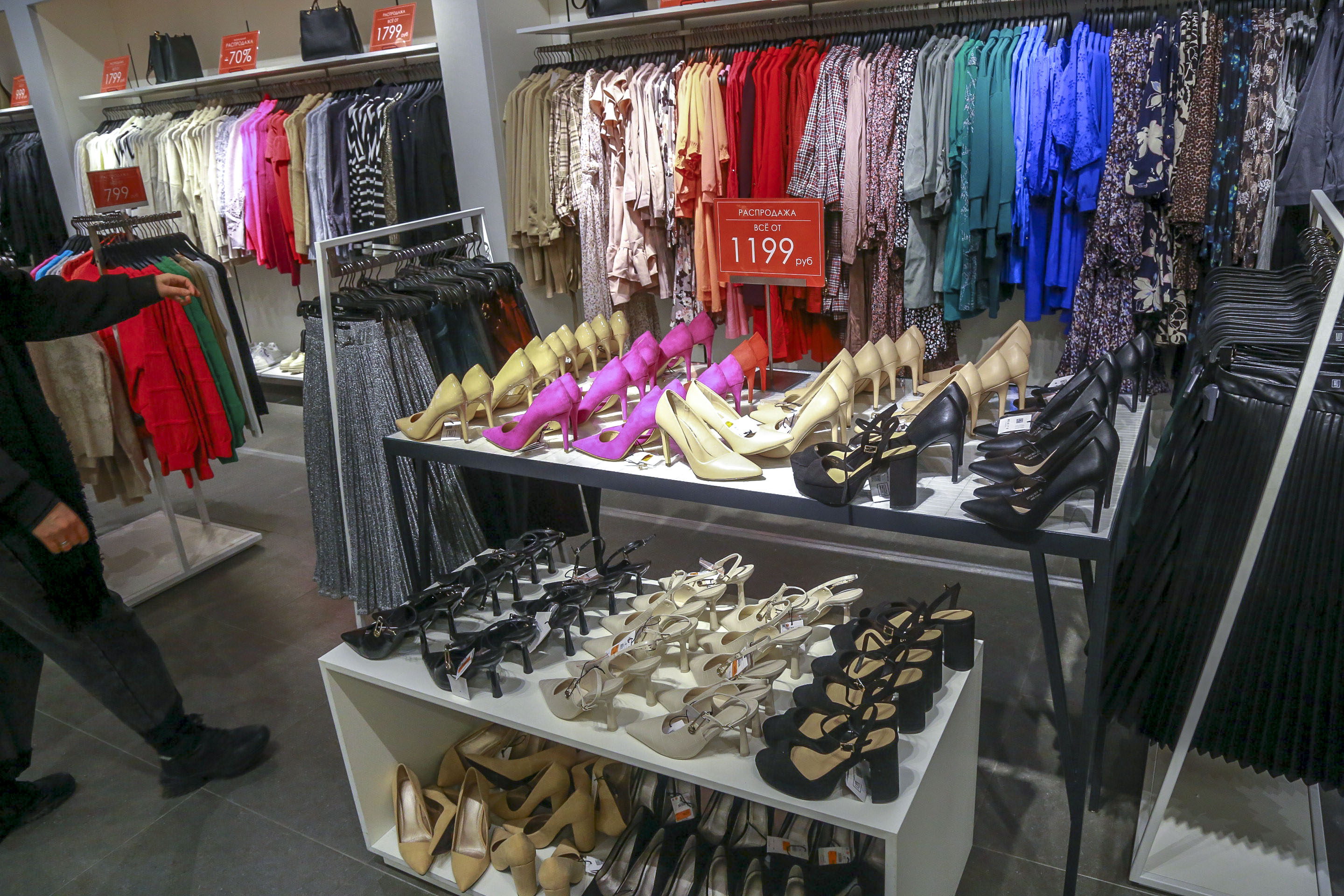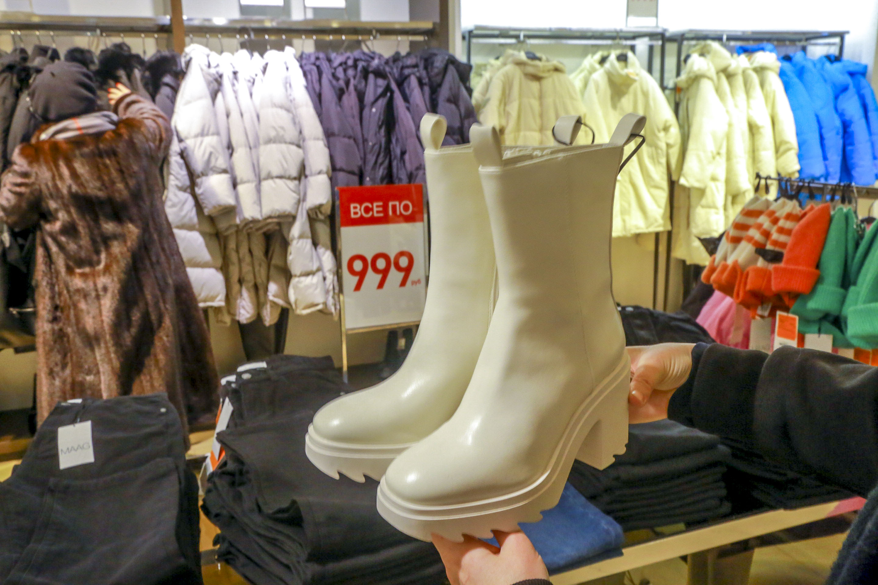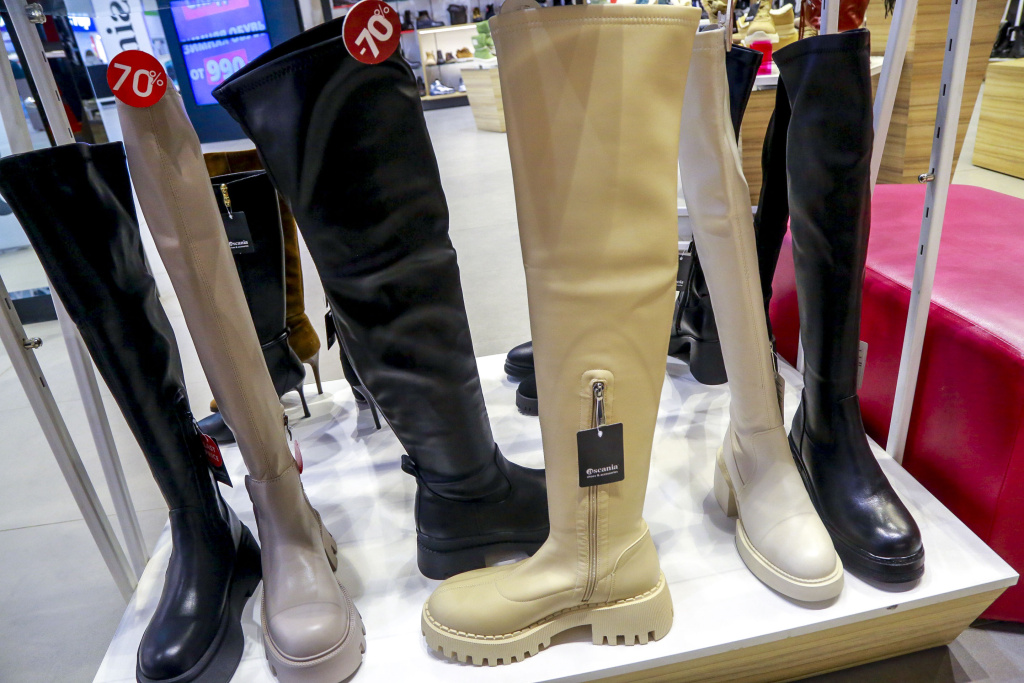 Чаще всего тотальные скидки в 50-70% касаются только части ассортимента. Дисконт в 80% вообще, как правило, точечный — на отдельные модели. Это относится как к верхней одежде, так и к обуви. Например, светлые сапоги-ботфорты, стоившие полгода назад 11 490 рублей, сейчас можно купить за 2300 рублей.