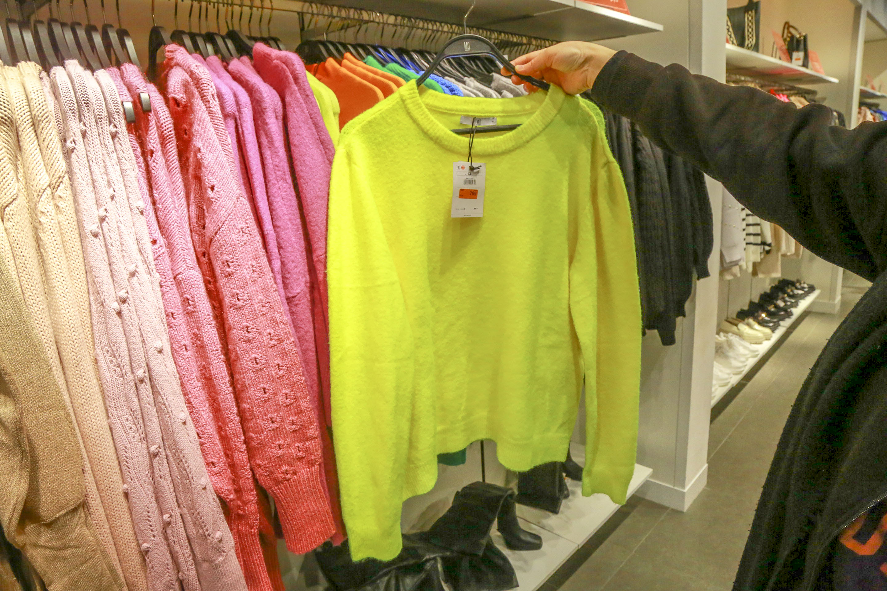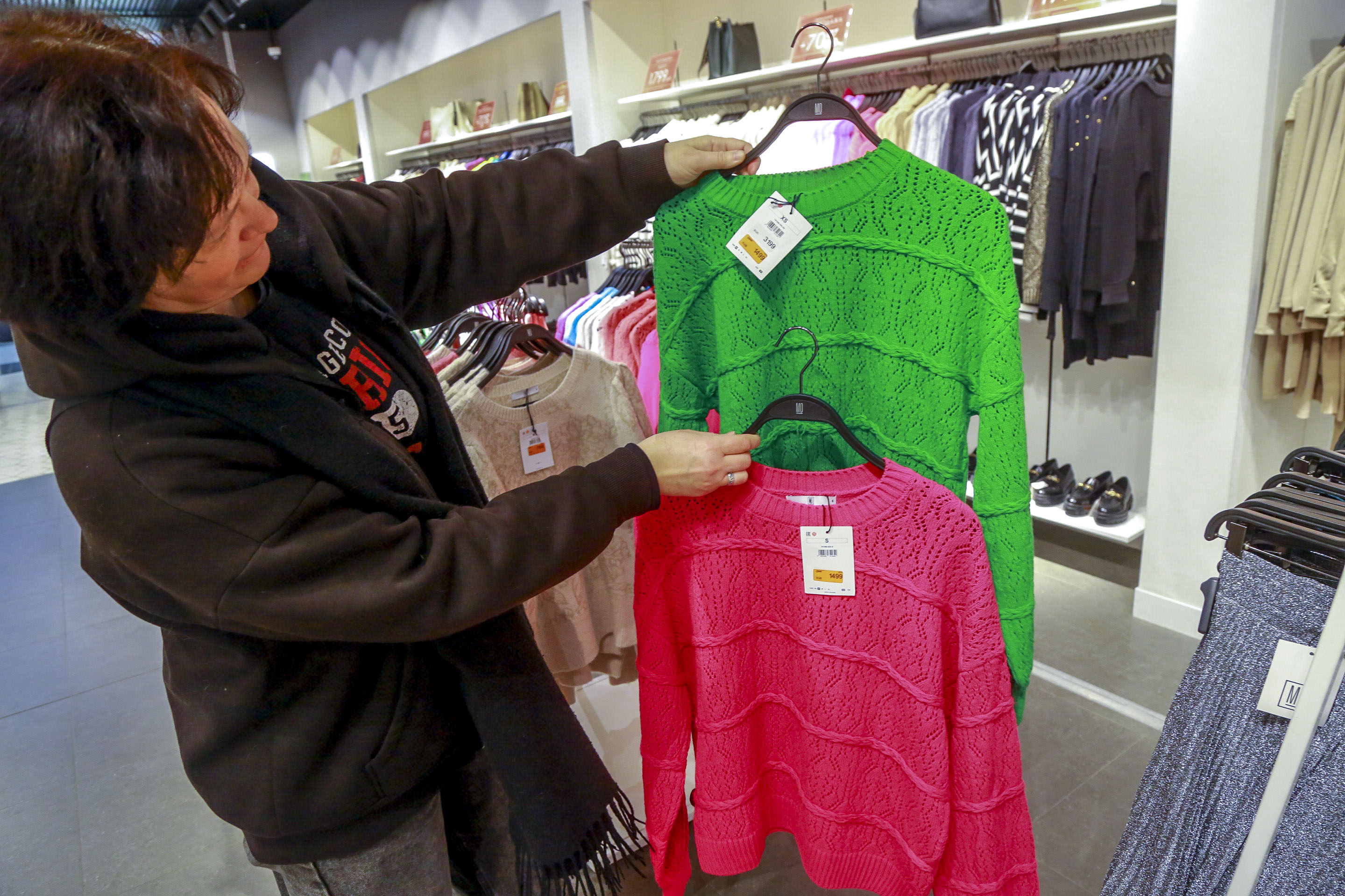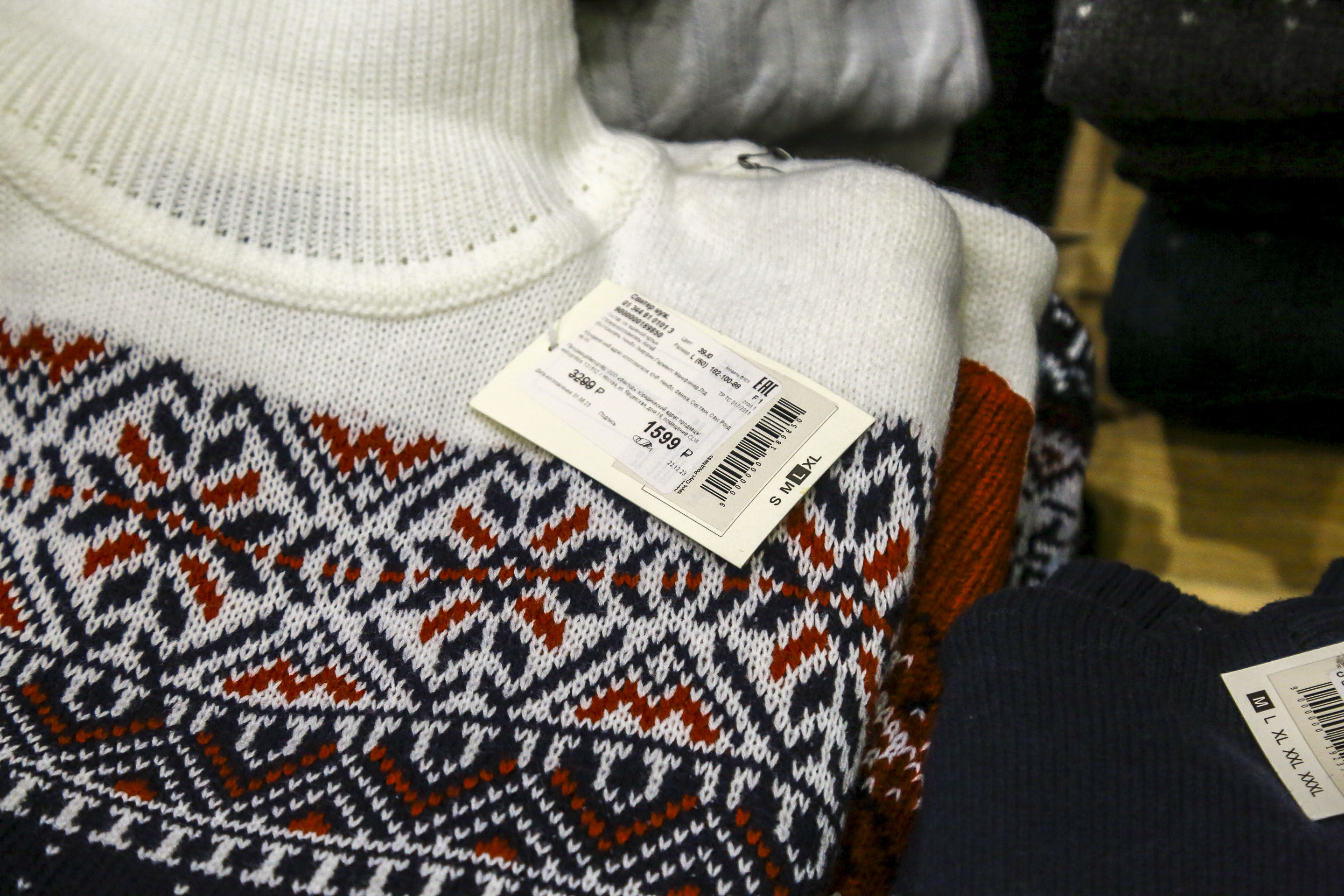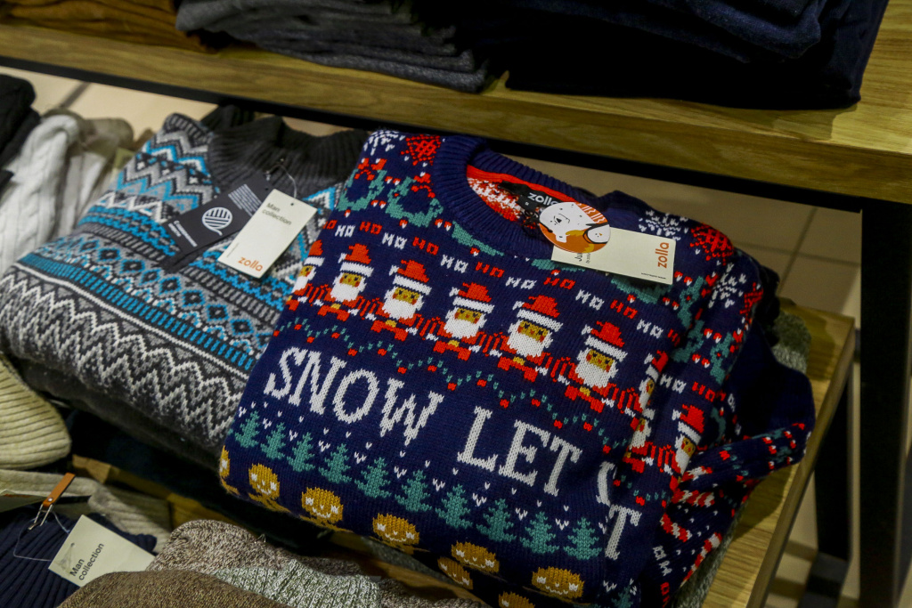 В отдельном ряду стоят кофты с новогодним декором — оленями, белыми медведями, снежинками и снеговиками. Цены на них тоже дружно пошли вниз. До праздников такой свитер продавали по 2600 рублей, сейчас его можно приобрести за 1300 рублей.