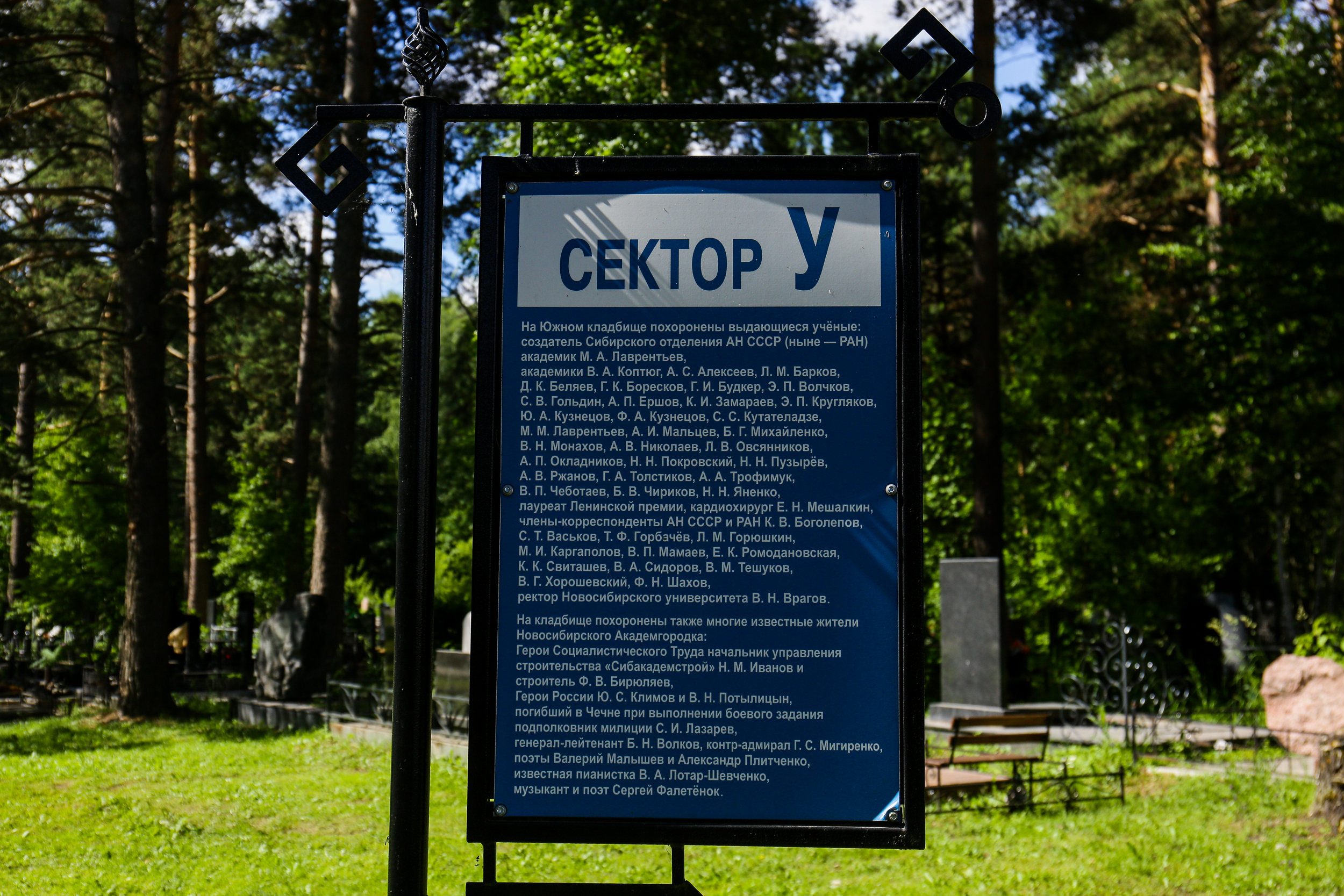 Кладбище Академгородка разделено на сектора. В секторе «У» похоронены учёные Сибирского отделения АН СССР, в секторе «В» — военные. Здесь покоятся великие академики, отцы сибирской науки: математик, механик, один из разработчиков первого атомного заряда Михаил Лаврентьев, химик, вице-президент РАН, председатель Сибирского отделения РАН Валентин Коптюг, физик, профессор, основатель и первый директор института ядерной физики Герш Будкер, всемирно известный кардиолог Евгений Мешалкин. Кроме учёных, на Южном кладбище нашли последний приют музыкант Сергей Фалетёнок и поэт Александр Плитченко. У первого памятник в виде фигуры с гитарой. У второго — простой крест из белого мрамора.