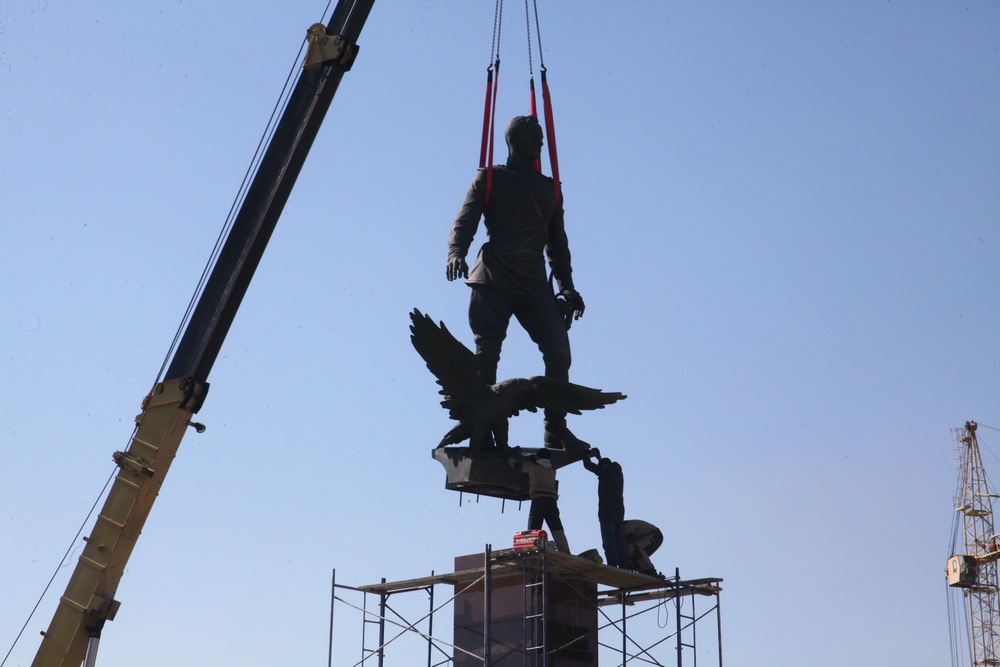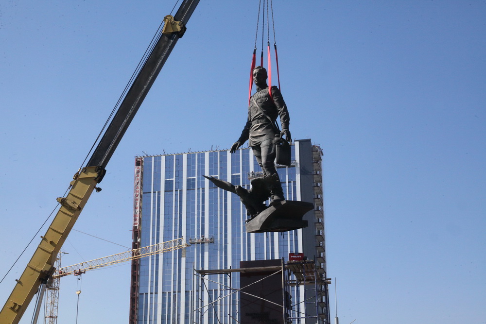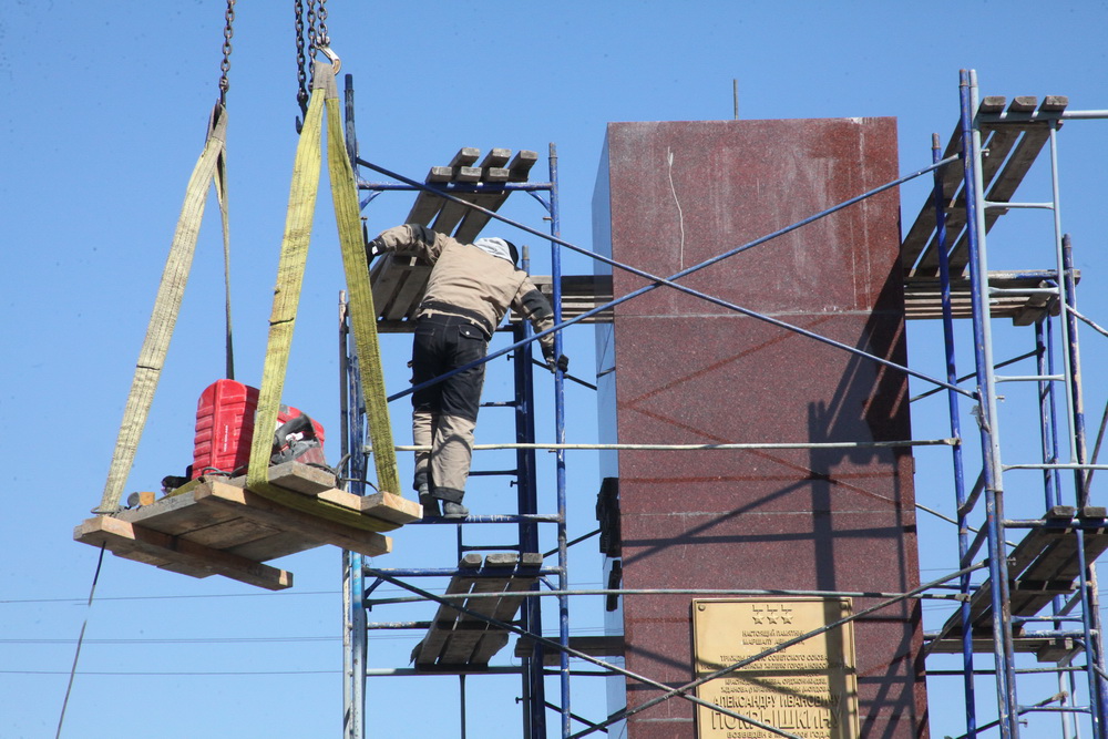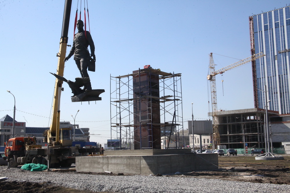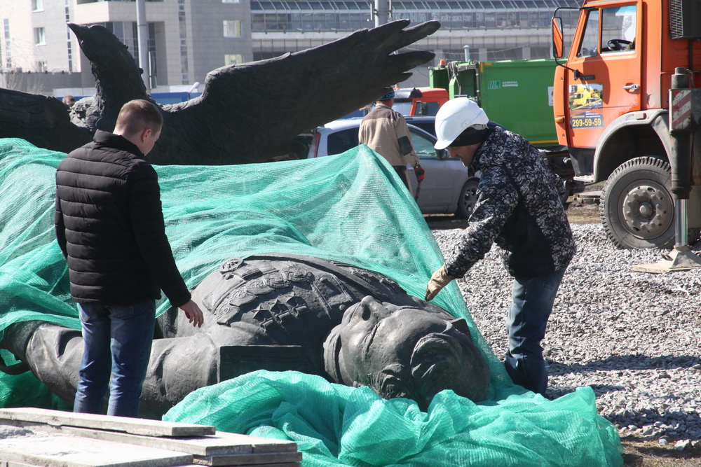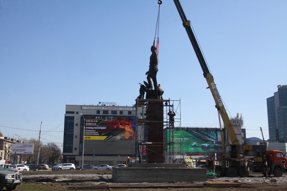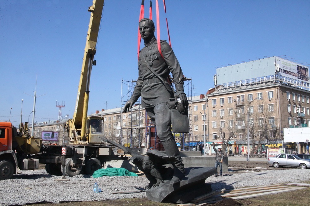 Фигуру поставили на постамент и тщательно закрепили. Привести в порядок территорию вокруг должны к 9 Мая.