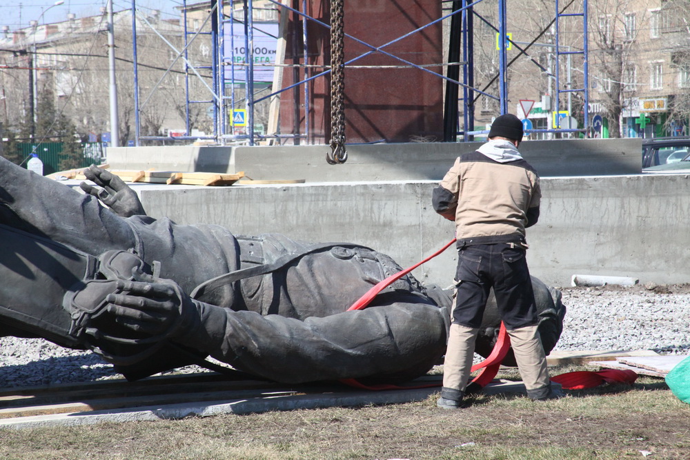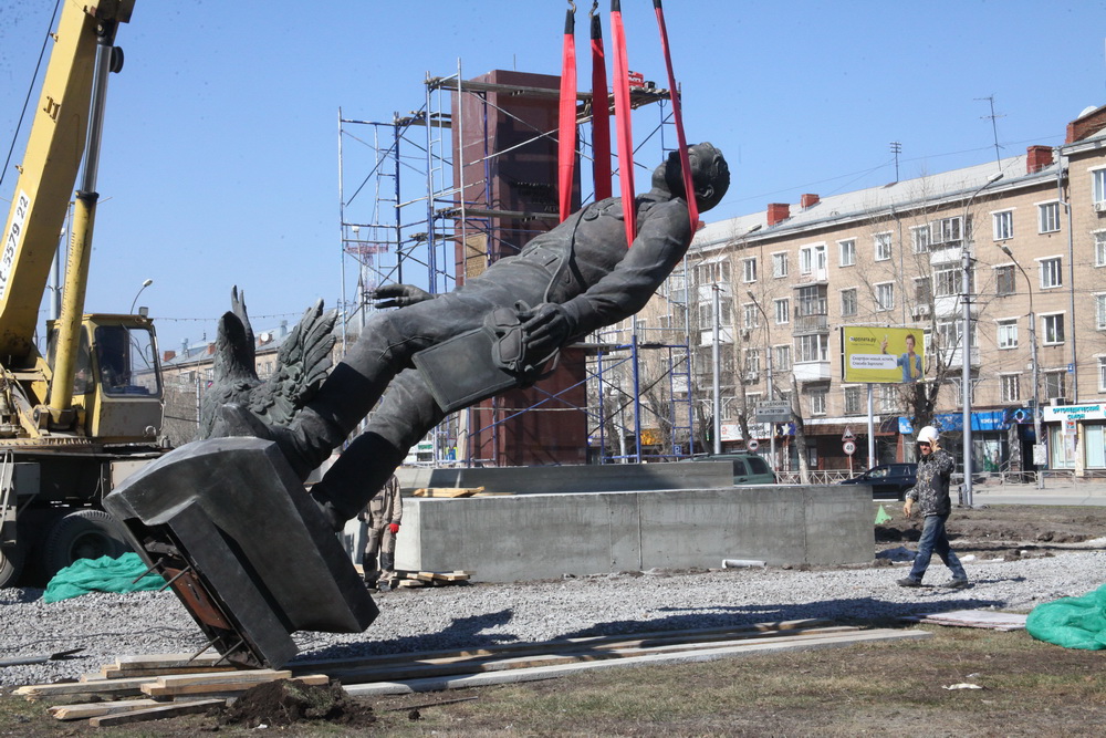 Неделю назад бронзовую скульптуру легендарного лётчика сняли с постамента возле ДК «Сибсельмаш». Потом памятник уложили на землю на огороженной территории по соседству и отмыли с помощью щелочного раствора. А сегодня привезли на новое место — в центр транспортного кольца, где уже подготовили основание: залили бетонную площадку и установили пьедестал.