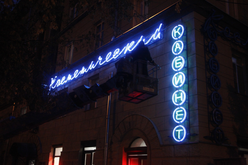 «Мы не стали менять стеклянные трубки на новый гибкий неон из диодов, потому что если реставрировать, то делать как было, а не создавать имитацию», — рассказывал Любим Любаев в процессе работы.