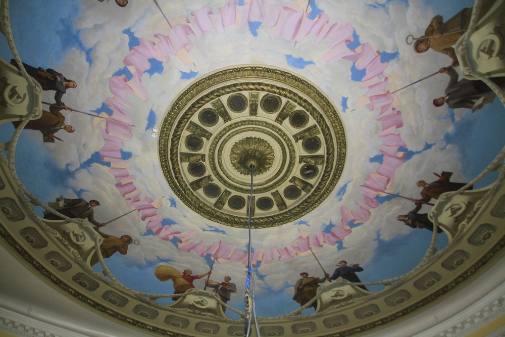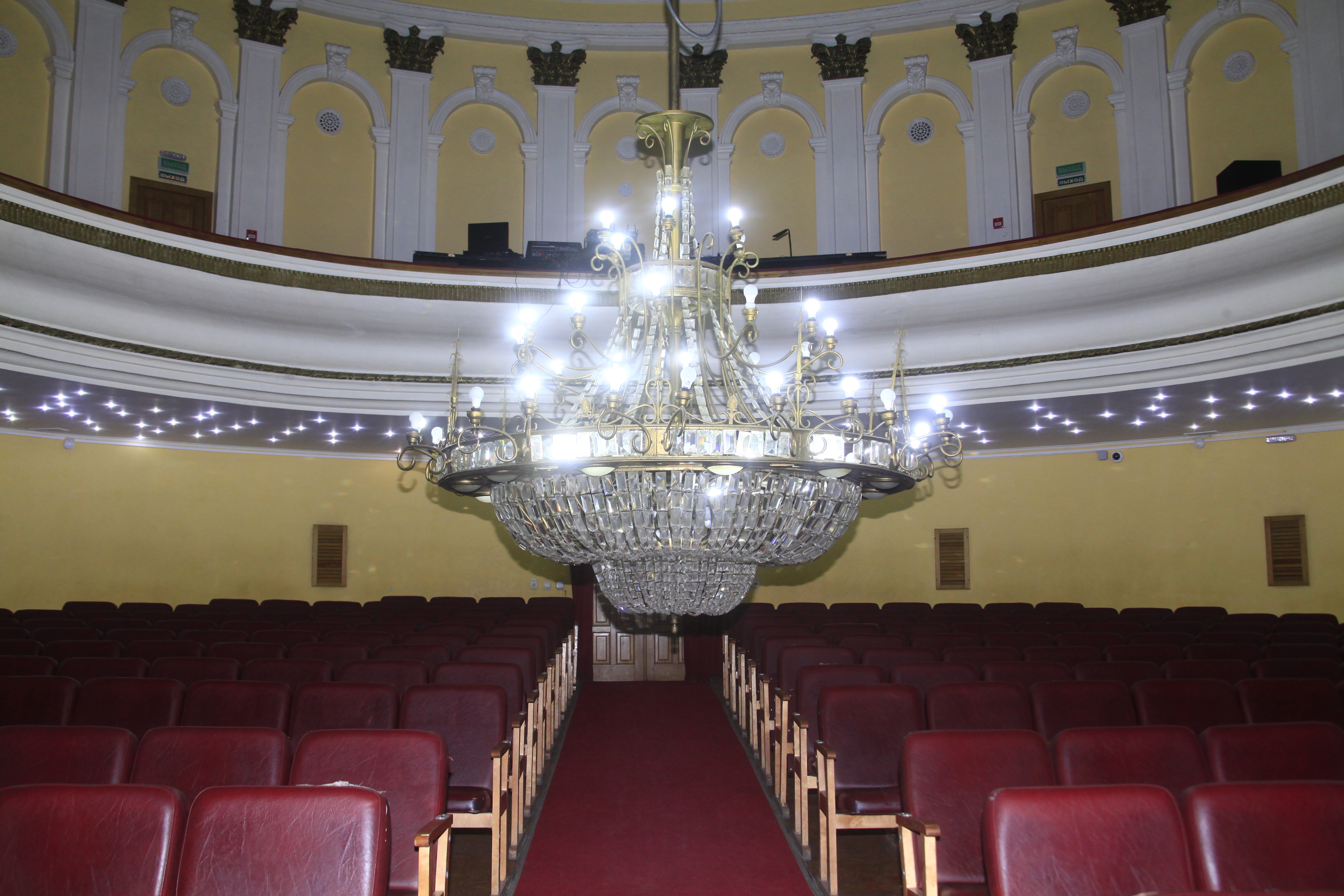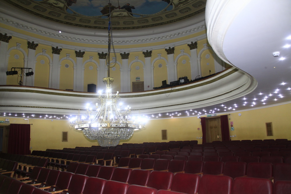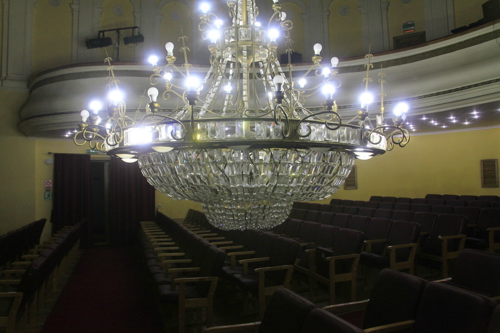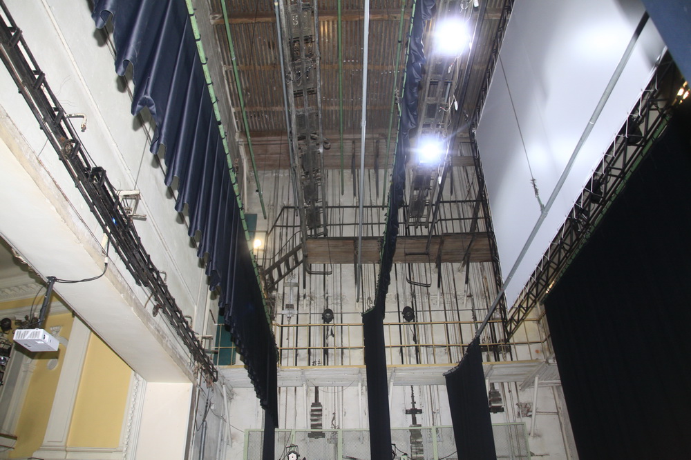 Главную люстру зрительного зала время от времени опускают, чтобы поменять перегоревшие лампы и удалить пыль. Это происходит как минимум раз в год. Нам повезло, что мы застали этот момент. По словам Александра Владимирова, всё сценическое оборудование, сохранившееся с незапамятных времён, в этом году планируют заменить на новое.
